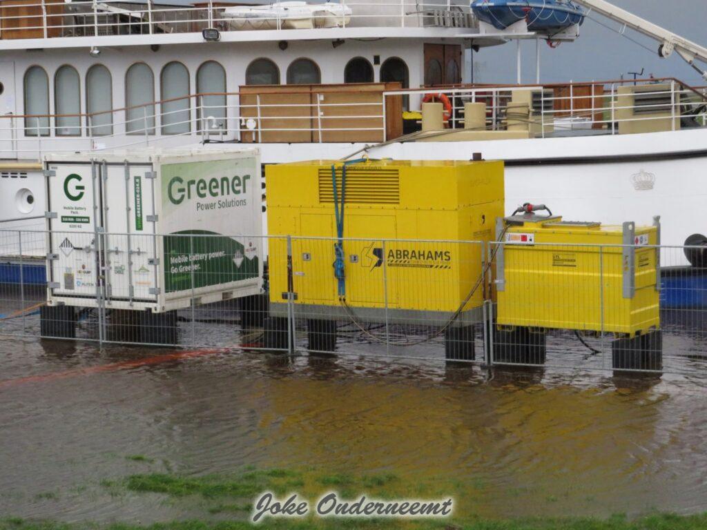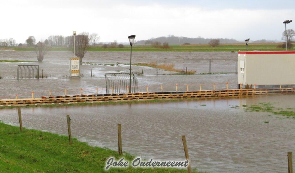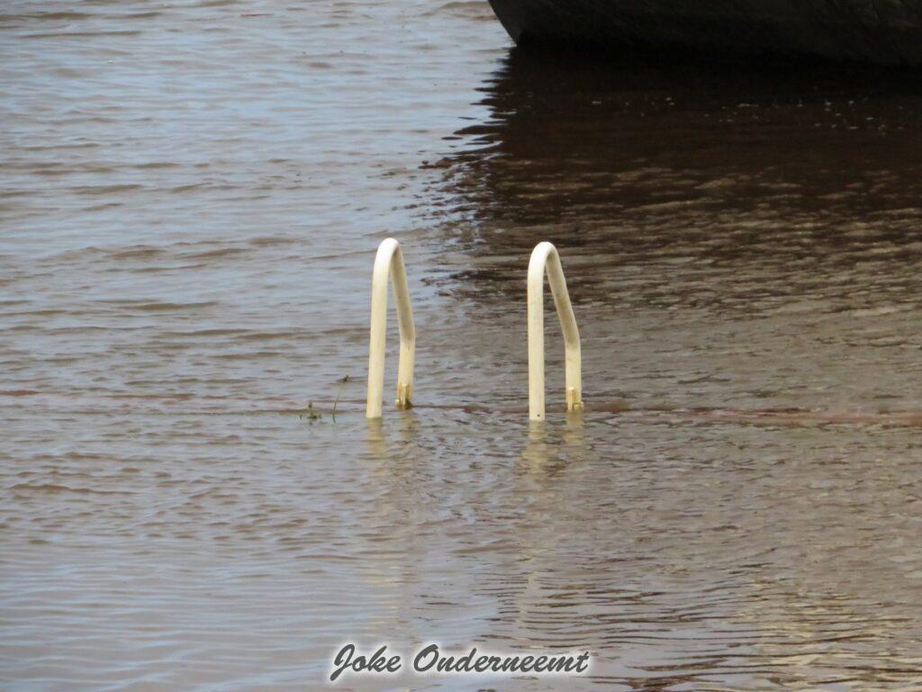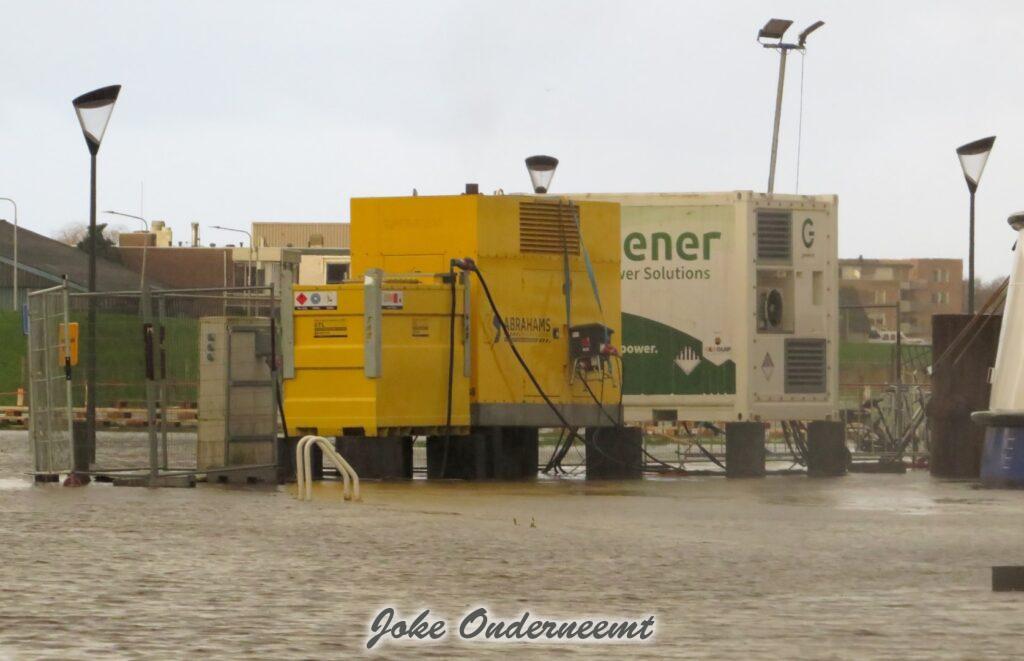 De aggregaten zijn veilig gesteld en op blokken geplaatst. En ze hebben nu een “eigen brug” om droog aan de wal te kunnen komen. Met de fiets zal even niet zo handig gaan die staan nog in het water, en voetballen zal voorlopig even “waterpolo” gaan worden denk ik…
