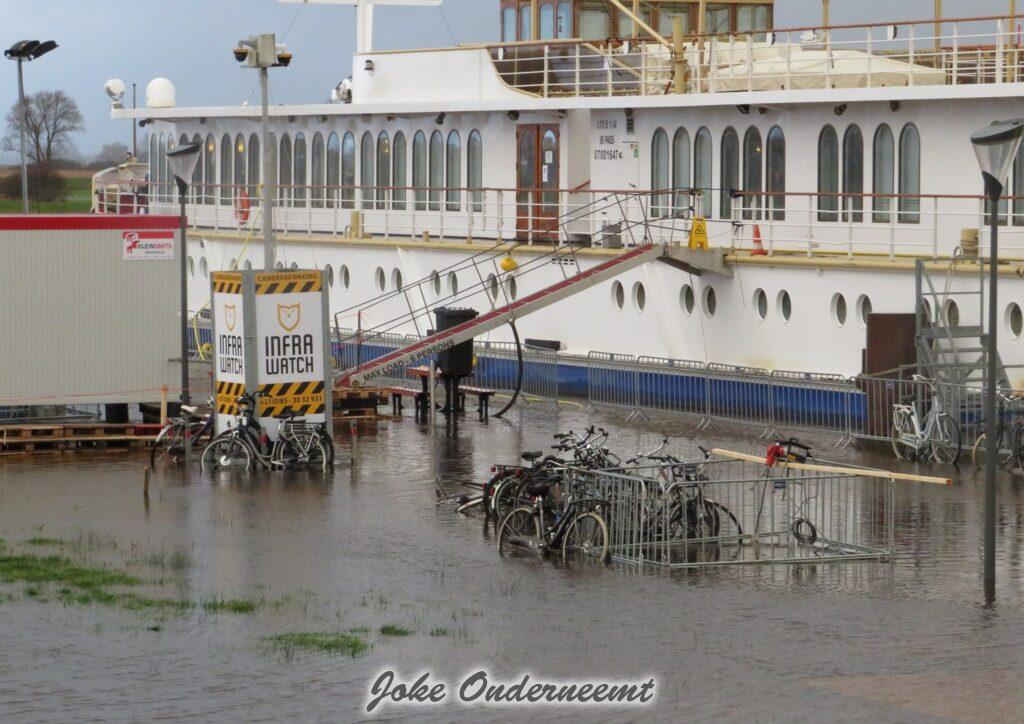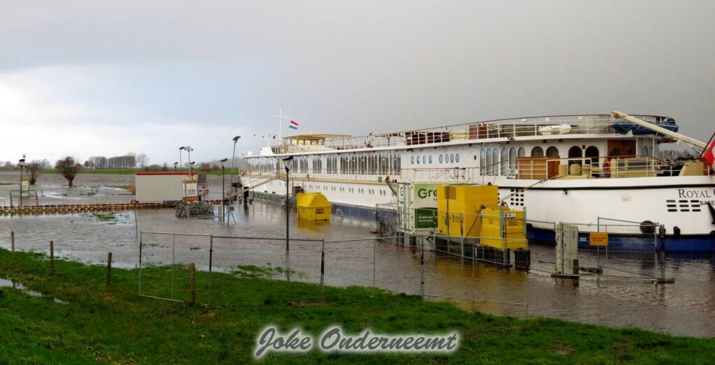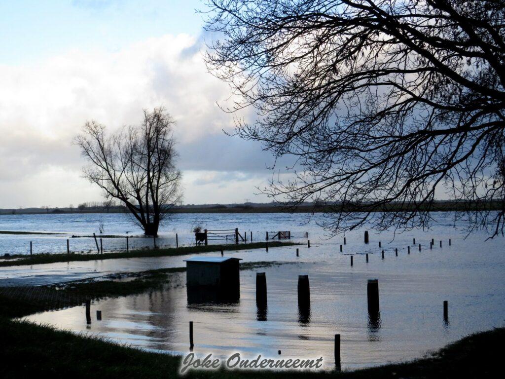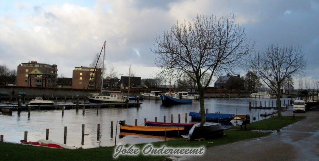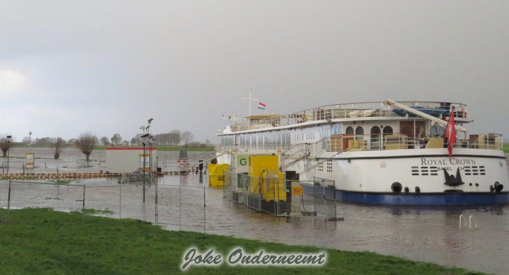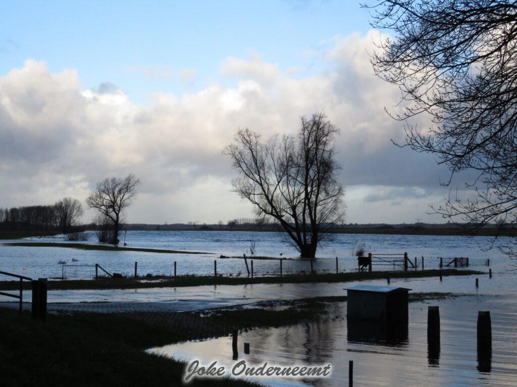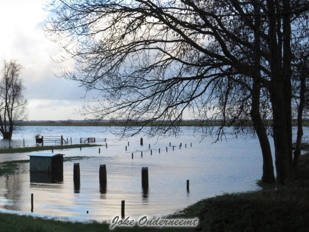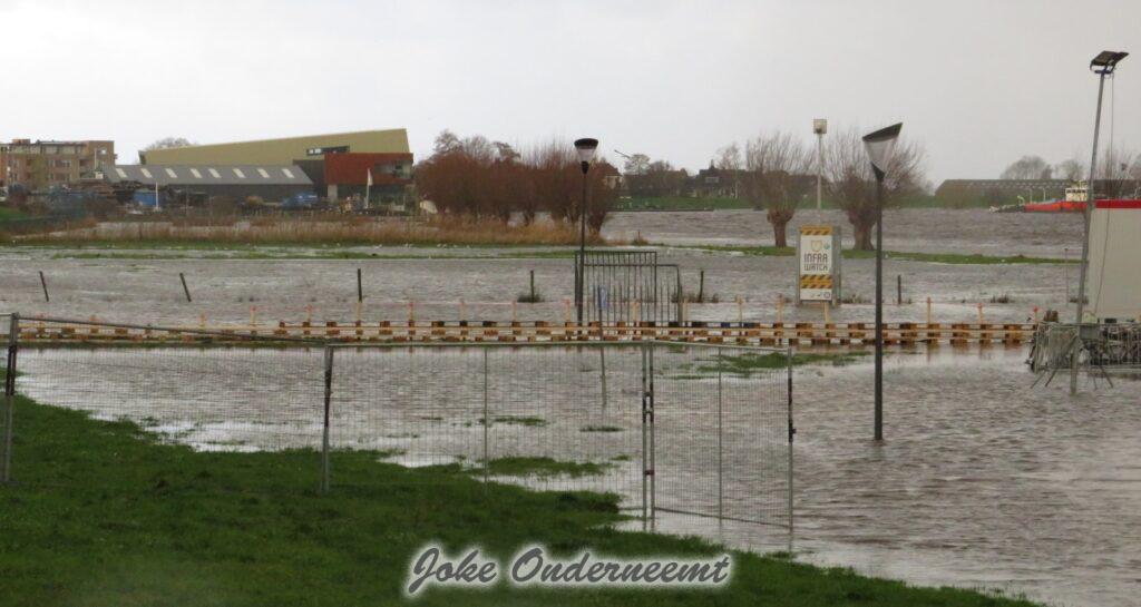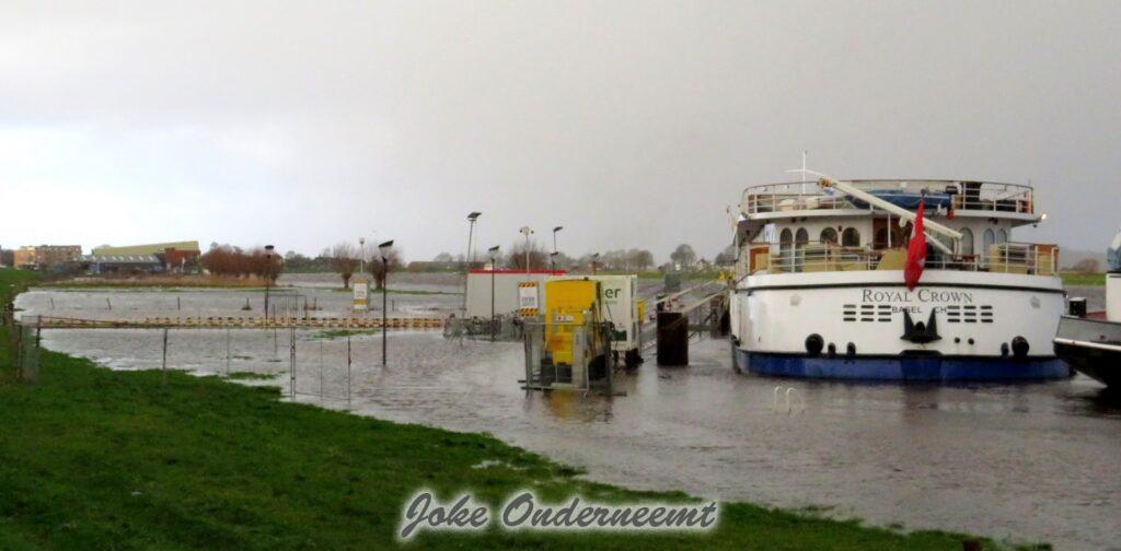 Ook de weilanden staan al weer veel onder water, zo ook bij de haven en het veer.