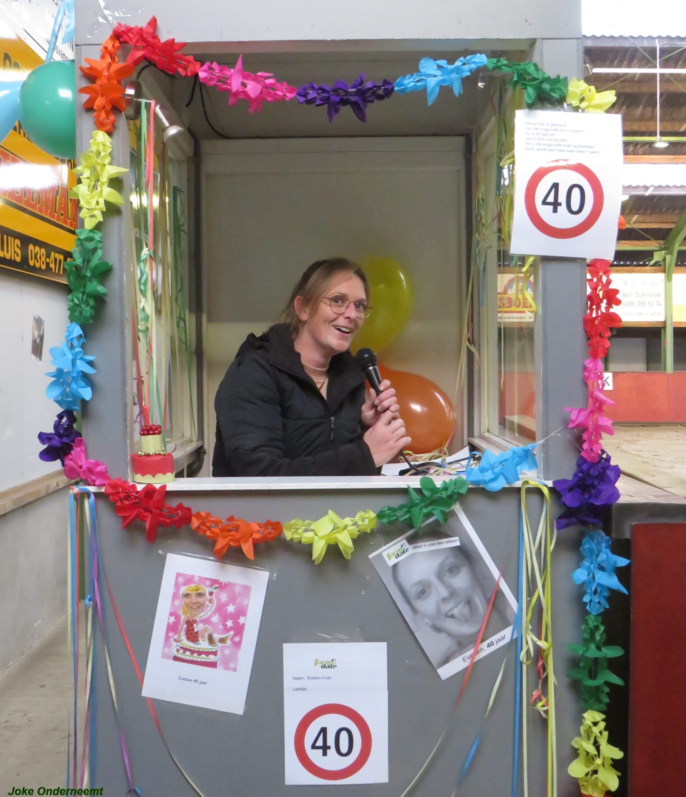 Voor nu dus drie wedstrijddagen, maar behalve paarden is er vandaag ook een “feestvarken” op de manege. Evelien Fuite is 40 jaar geworden en dat wordt natuurlijk wel even kenbaar gemaakt daar. Evelien is een echte paarden liefhebber en doet zoals zoveel mensen… daar ook veel achter de schermen, en zo zat ze vandaag bij de doorgang naar de wedstrijd bak, in haar “hokje” waar de deelnemers eerst langst moeten om zich te melden.