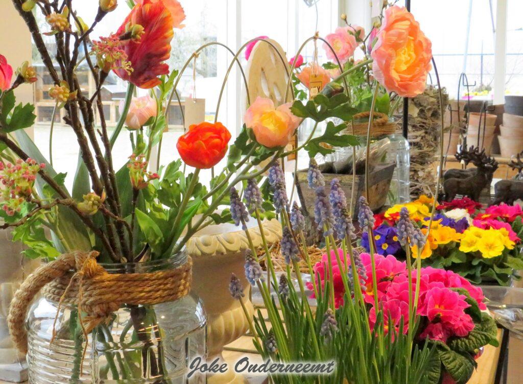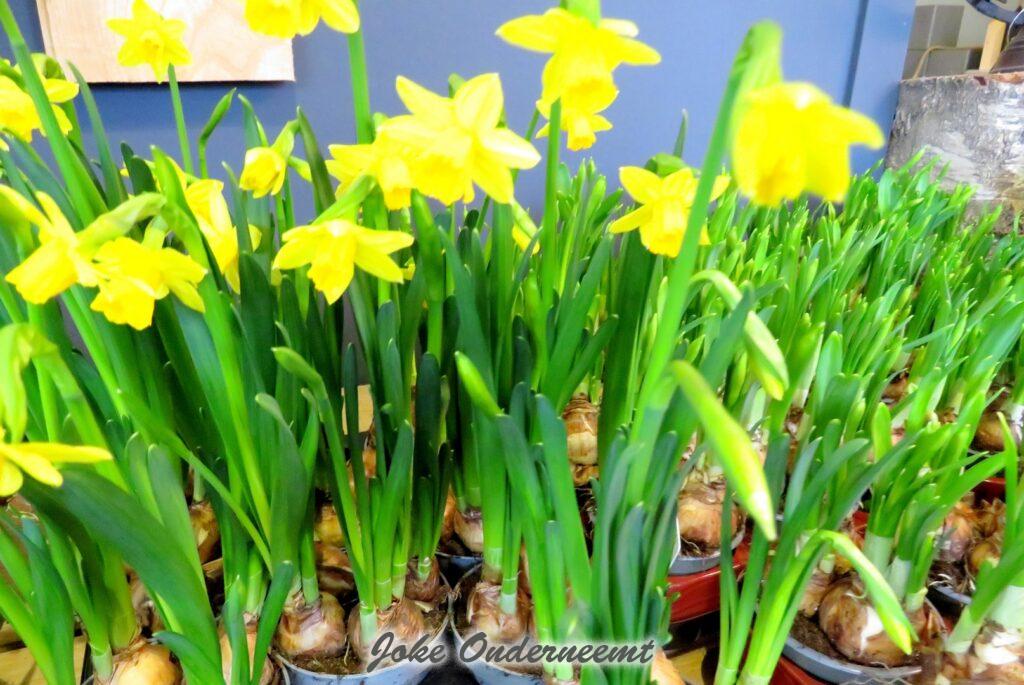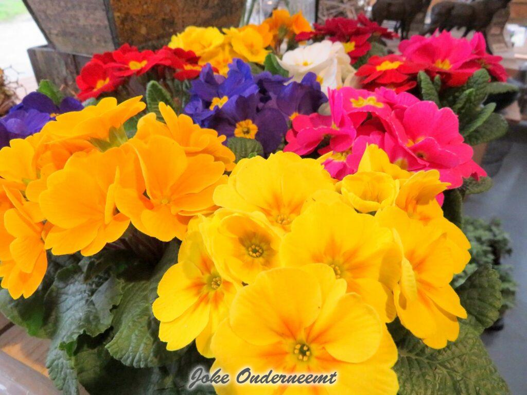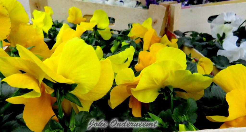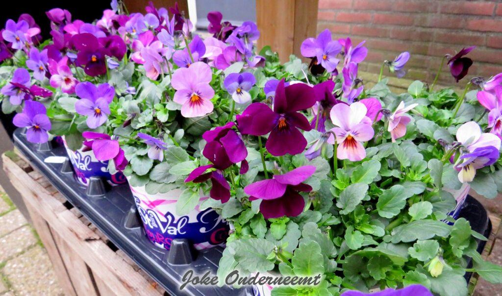 Het is een vrolijk gezicht al die violen in mooie kleuren en bloembollen, narcissen en hyacinten , blauwe druifjes .
