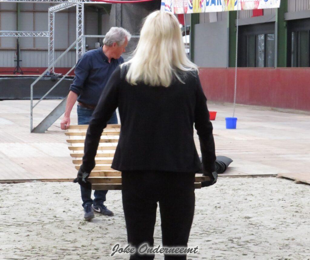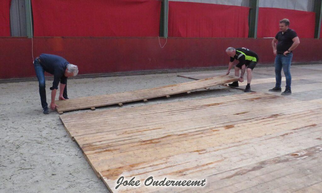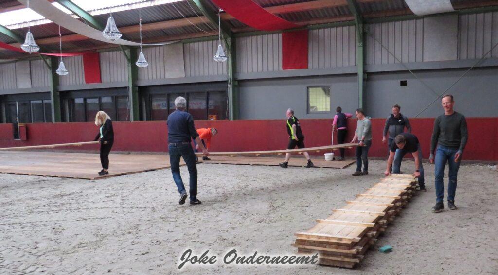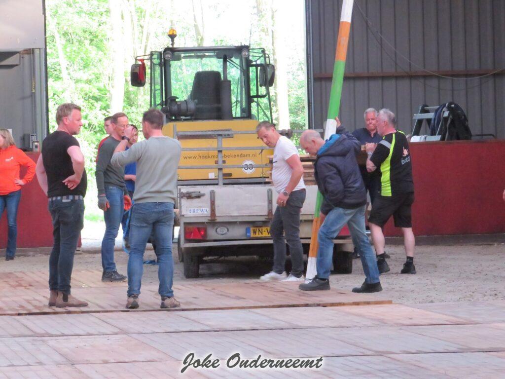 Vanavond zijn ze met de voorbereidingen begonnen en ja dat betekende dat directeuren & sponsoren aan de bak in de bak moesten , want dat feest begint natuurlijk bij een goede vloer leggen in de bak van de manege.. een hele klus maar het verloopt allemaal perfect dank zij de goede samenwerking.