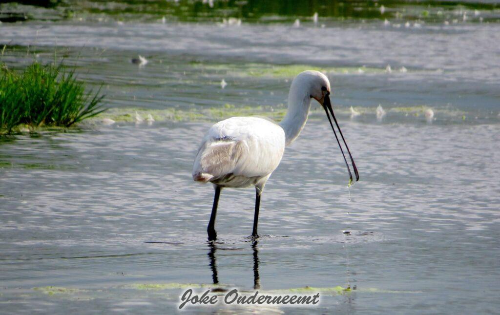 En meteen links in dat brede water en wat loopt daar vlak bij …. ja hoor en Lepelaar ! Helemaal alleen en vlakbij was hij naar eten aan het zoeken.
