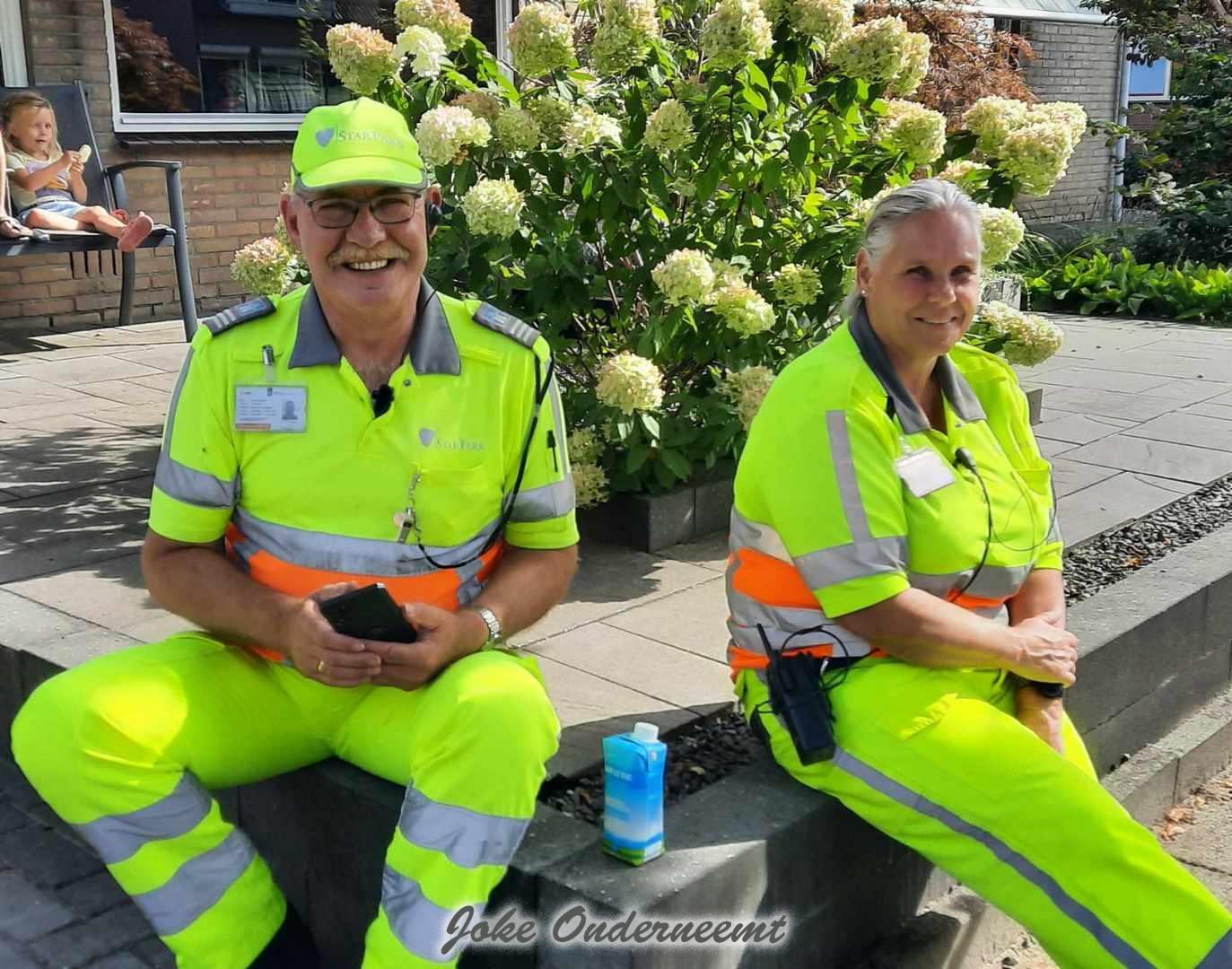 Maar vandaag waren verkeersregelaars Margot en Andre er die het verkeer in goede banen wisten te leiden… op de foto hadden ze even pauze en genoten in het zonnetje.