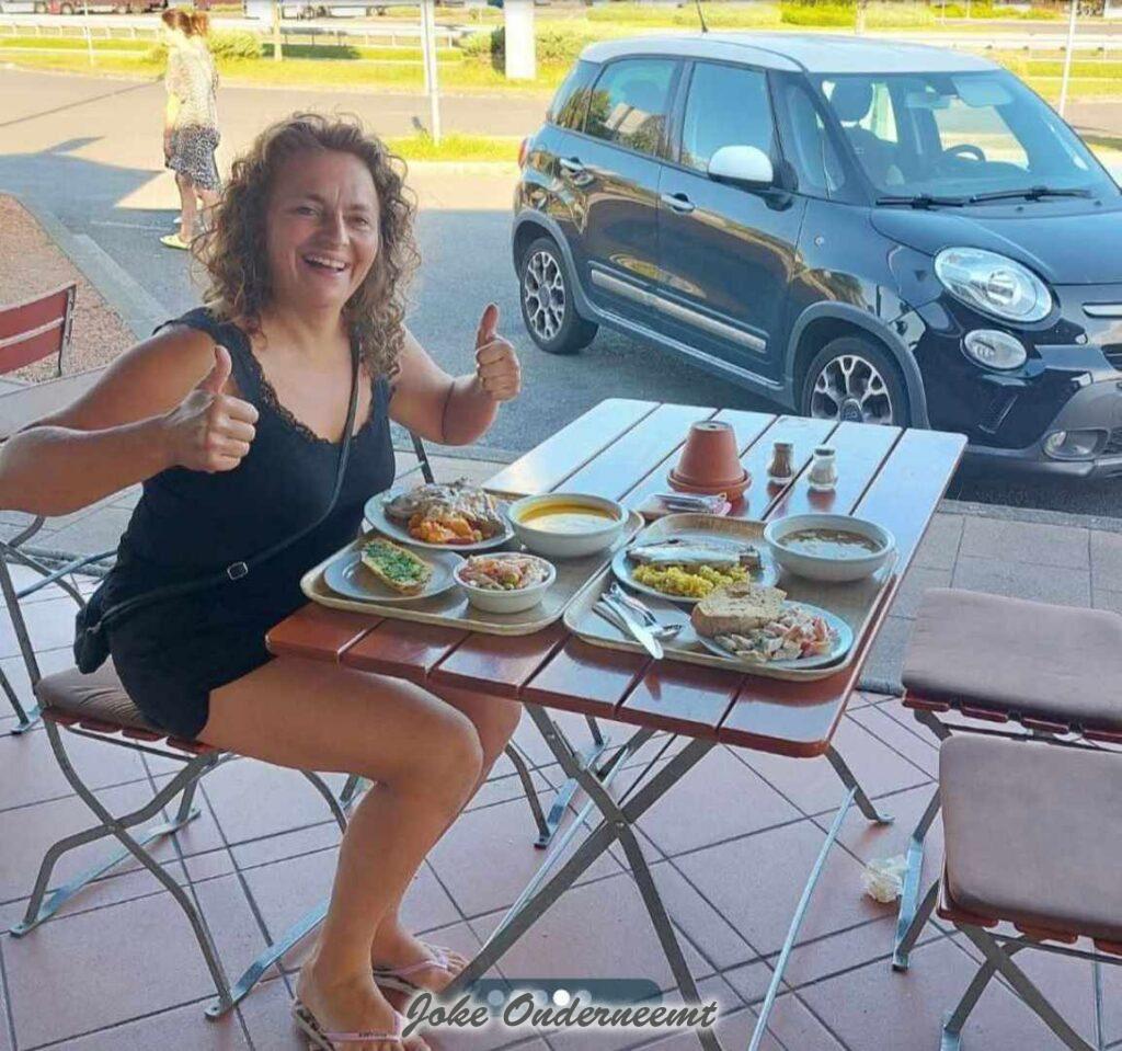 Onderweg even een hapje eten en wat denk je .. ze werden verwelkomt door jaja een koe ! Nou als dat geen toeval was… dus blije dames met toch een koe op de foto. Er was daar een lopend buffet dus ze troffen het.