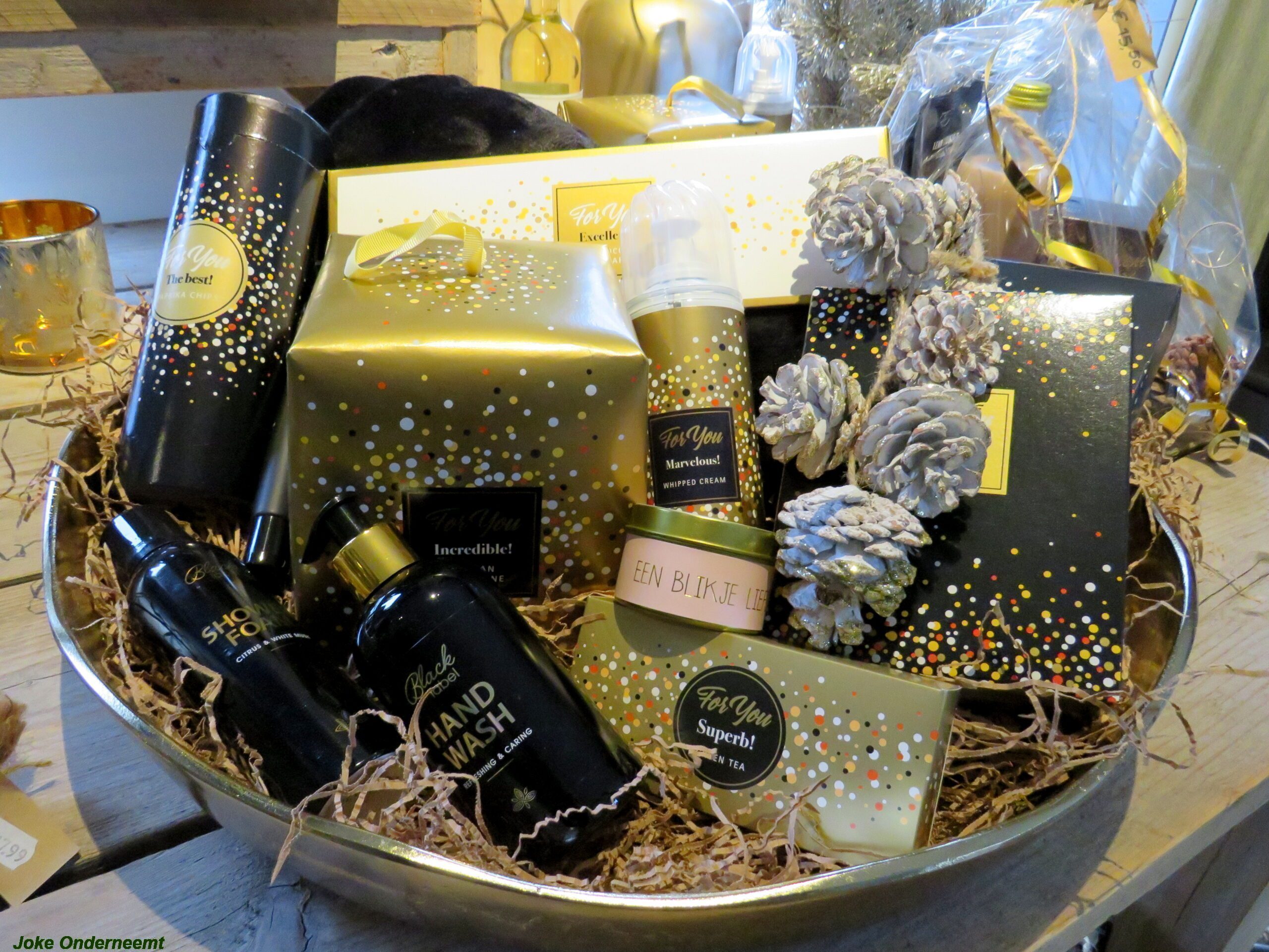 De eerste bestellingen staan genoteerd en de keuze is reuze ! U kunt natuurlijk als bedrijf kiezen voor 1 van de prachtige voorbeelden, of het zelf willen samenstellen naar uw keuze. Op bijvoorbeeld een prachtige goudkleurige schaal, een mooie vilten tas of een mooie houten snijplank /serveerplank/ decoratieplank noem maar op.