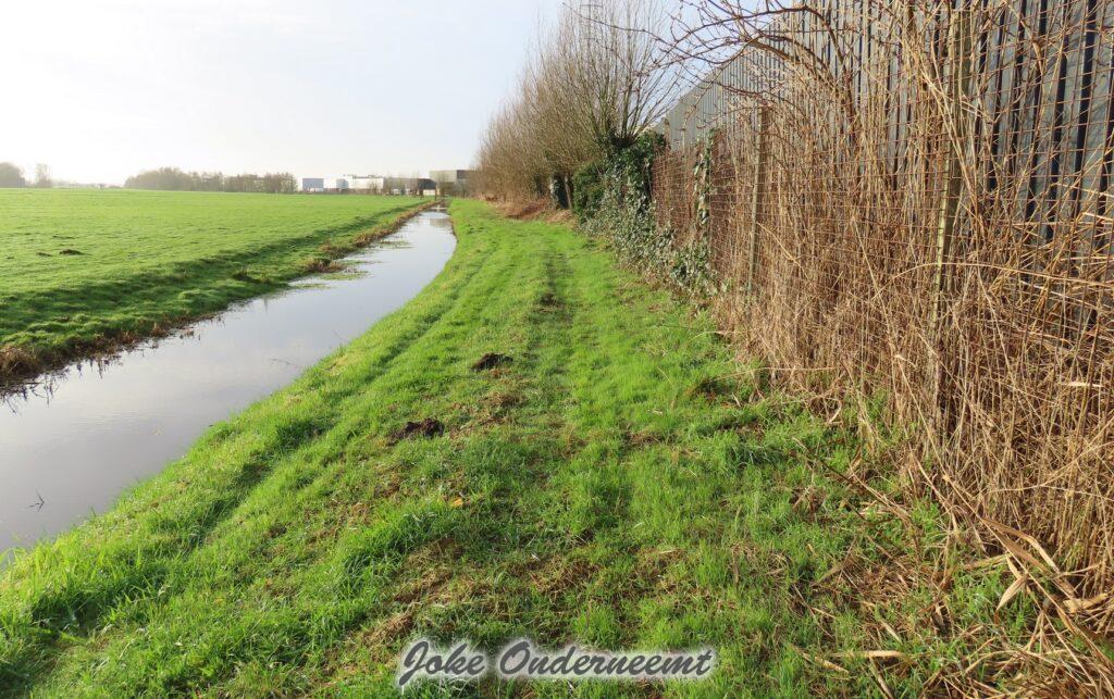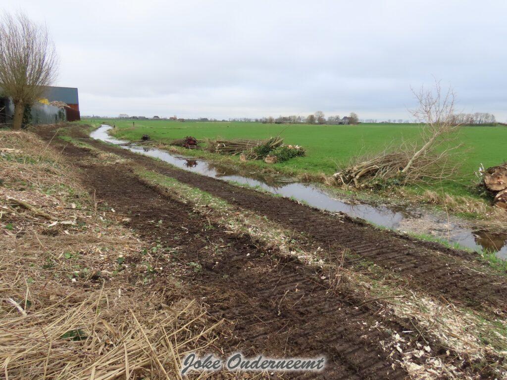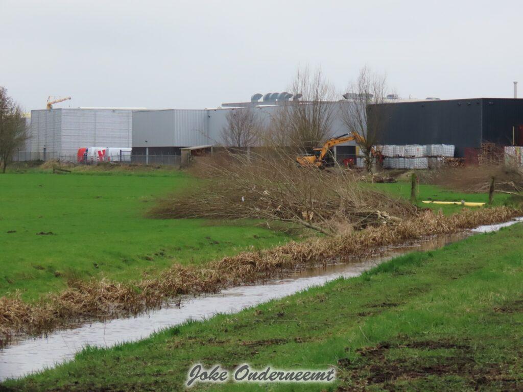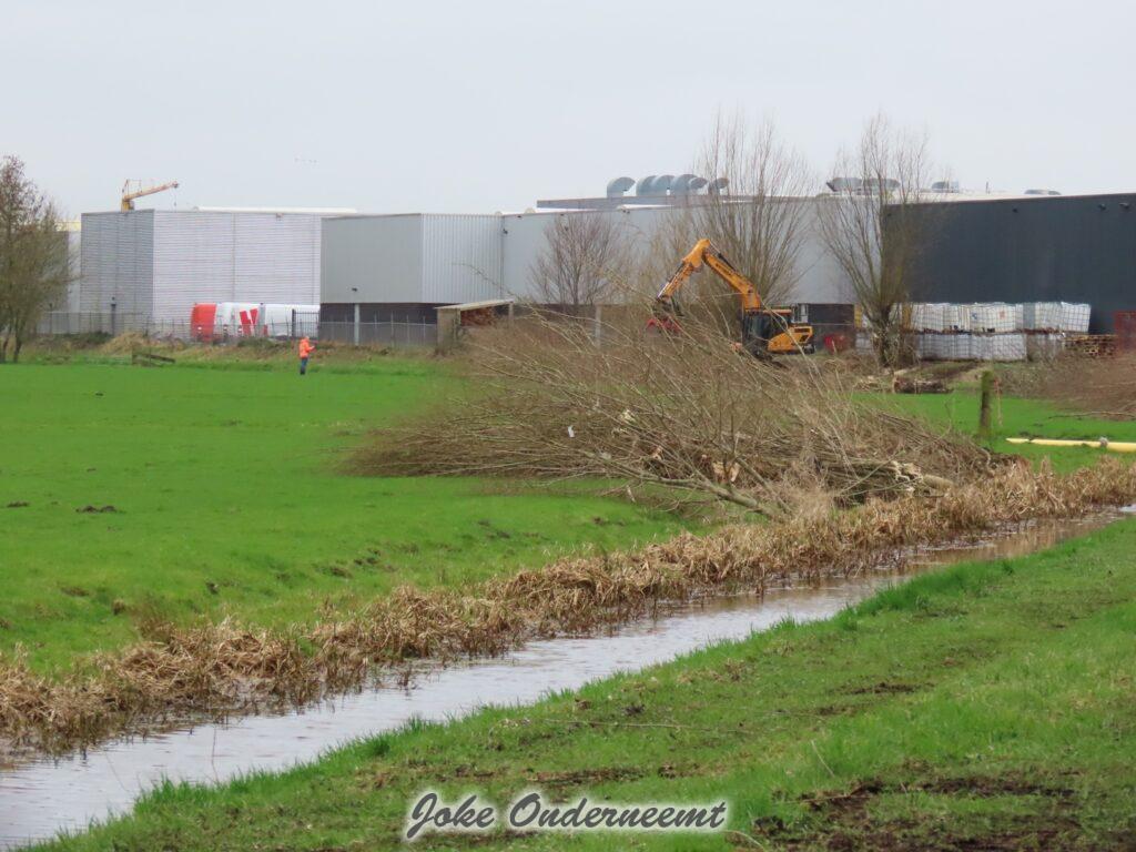 Vanmorgen rond acht uur ging ik kijken en werden de eerste bomen/ struiken eruit getrokken, en zo ging dat vandaag de hele dag door langst de slootkant achter o.a. van Dijk Containers en die hele lange rij met bedrijven aldaar. Om drie uur ging ik kijken en toen was de kraan al einde verder en “wipte” de bomen er zo uit.. De hele dikke moet nog even de zaag doorheen.