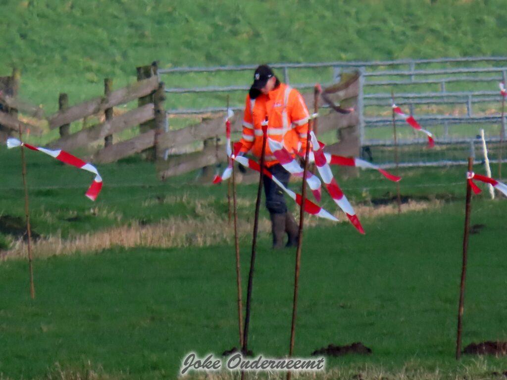 En dat was een apart gezicht want er staan inmiddels al een kleine 450 stokken met vlaggetjes te wapperen in de wind! De werkmannen van BRI waren heel ver weg , maar gelukkig kon ik inzomen met mijn camera en hoefde ik dus niet het hele land door te stampen.