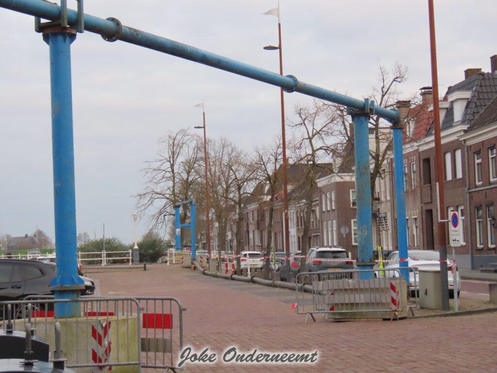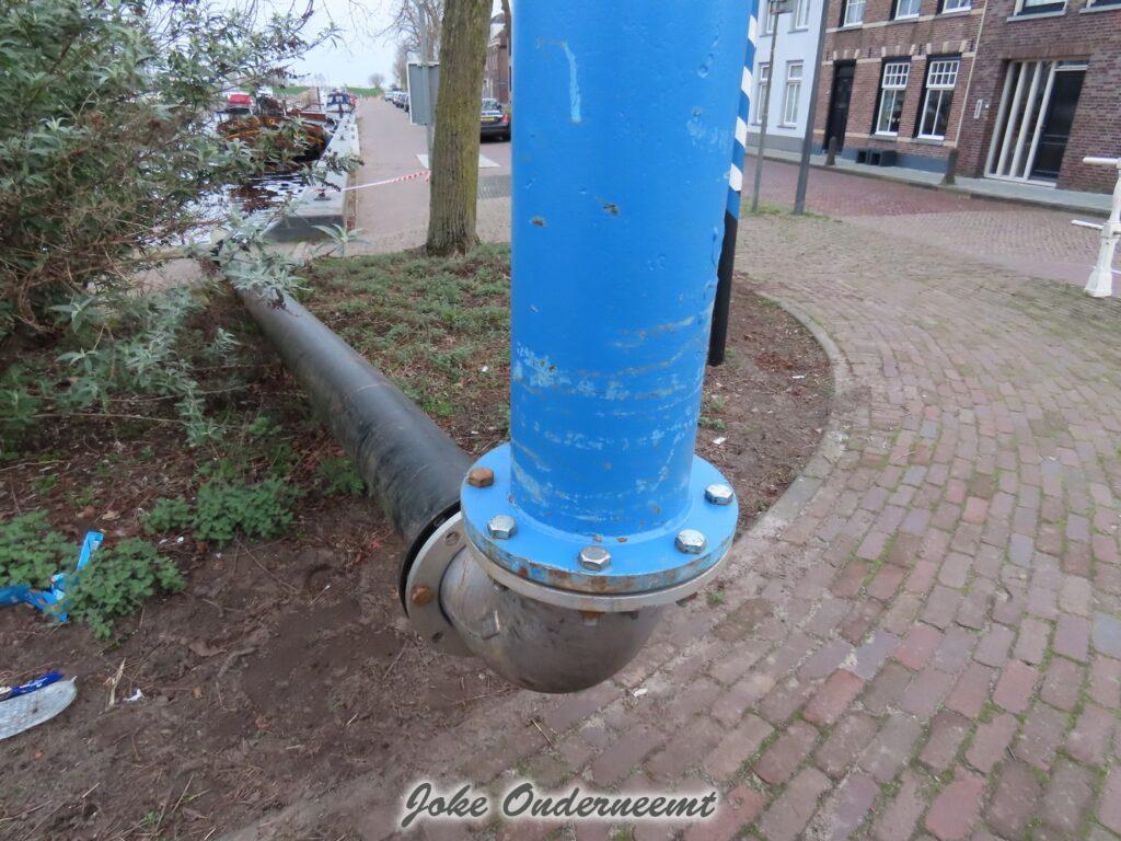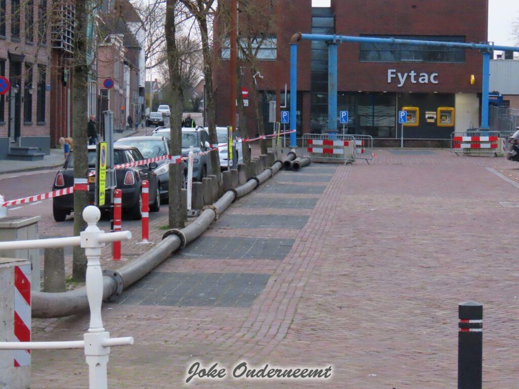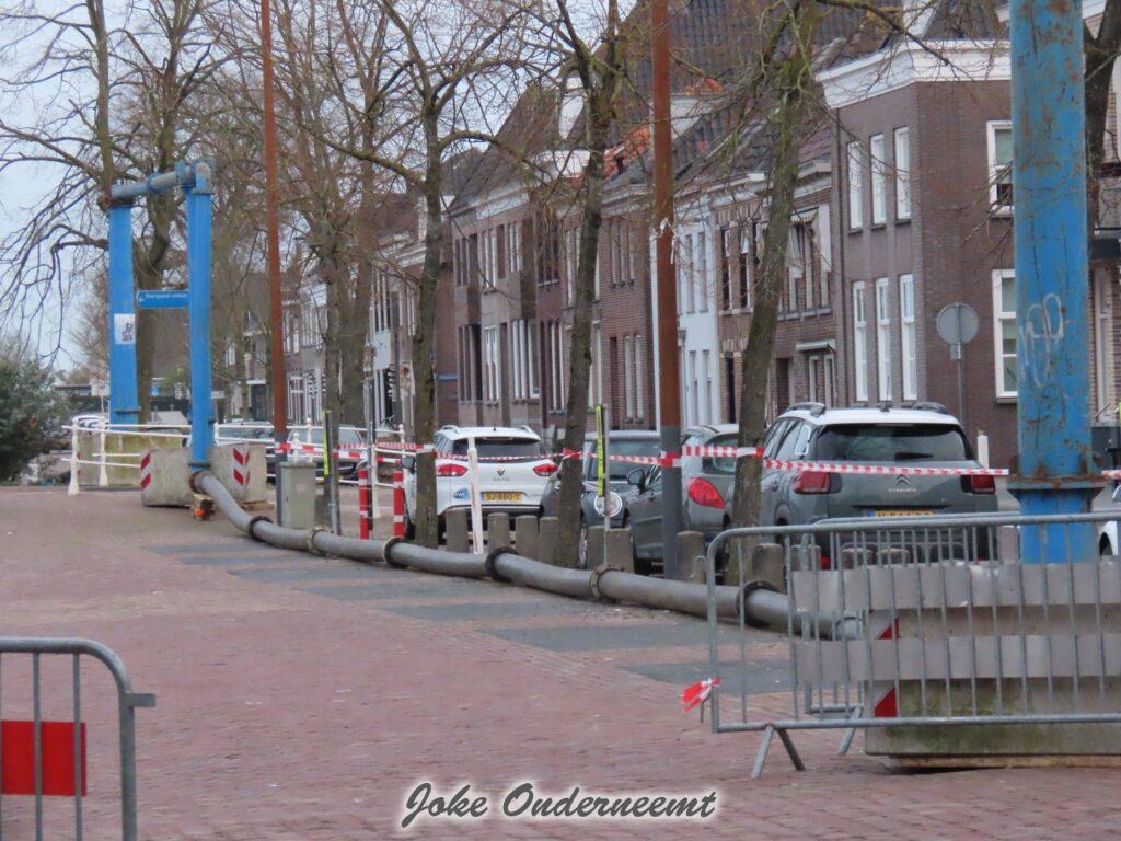 Maar nu alles binnen bijna gereed is moet er buiten nog wel wat gebeuren zag ik , een mooi “bouwwerk” van meters lange dikke buizen is vanaf de achterkant van ’t Olde Staduus via het Havenplein gelegd en komt uit in de Binnenhaven.