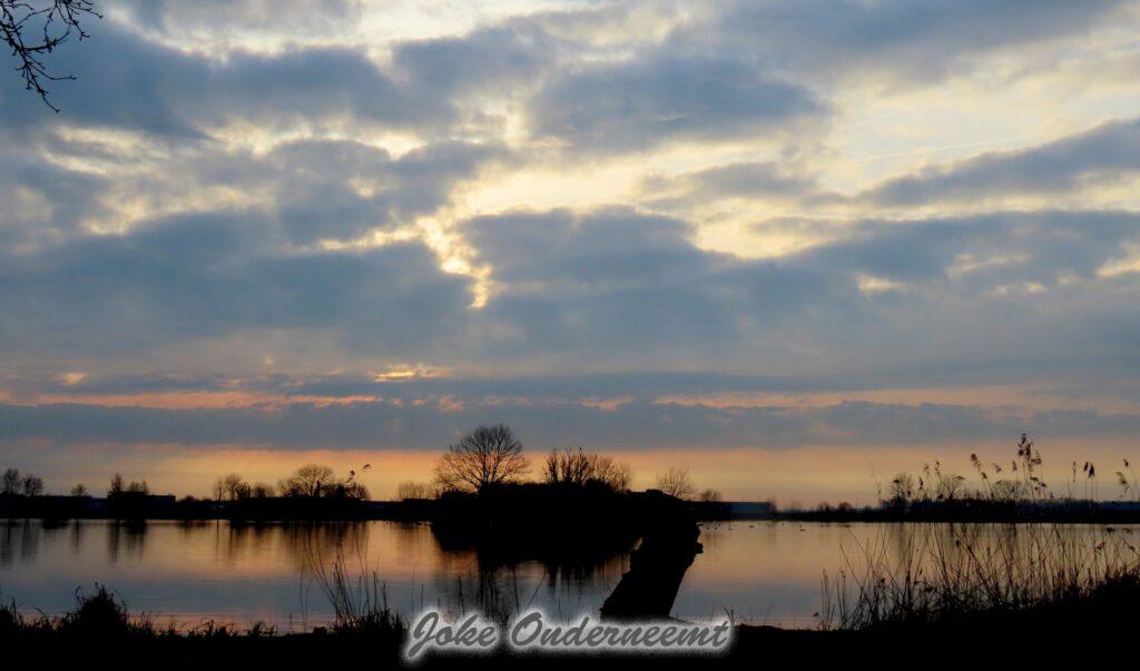 De stilte in het buitengebied en de mooie kleuren van de zon die zijn best doet om door de wolken te komen