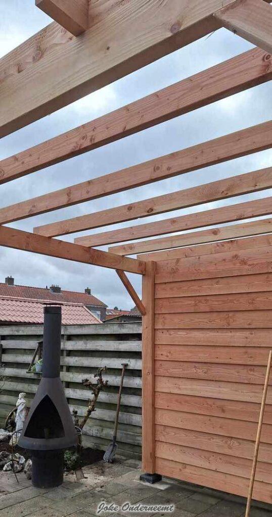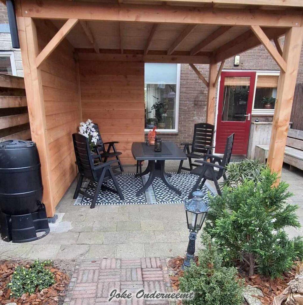 En dat werd een overkapping , nee niet vast aan het huis ( dat verzakt misschien nog wel weer haha) dus is het gewoon weer een drie bij drie geworden maar van hout. Maar ja die man van mij kan het best zetten , maar al dat gezaag was toch wel even een puntje.