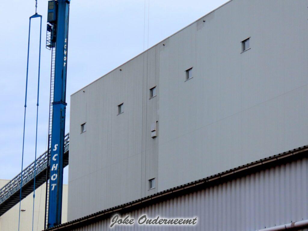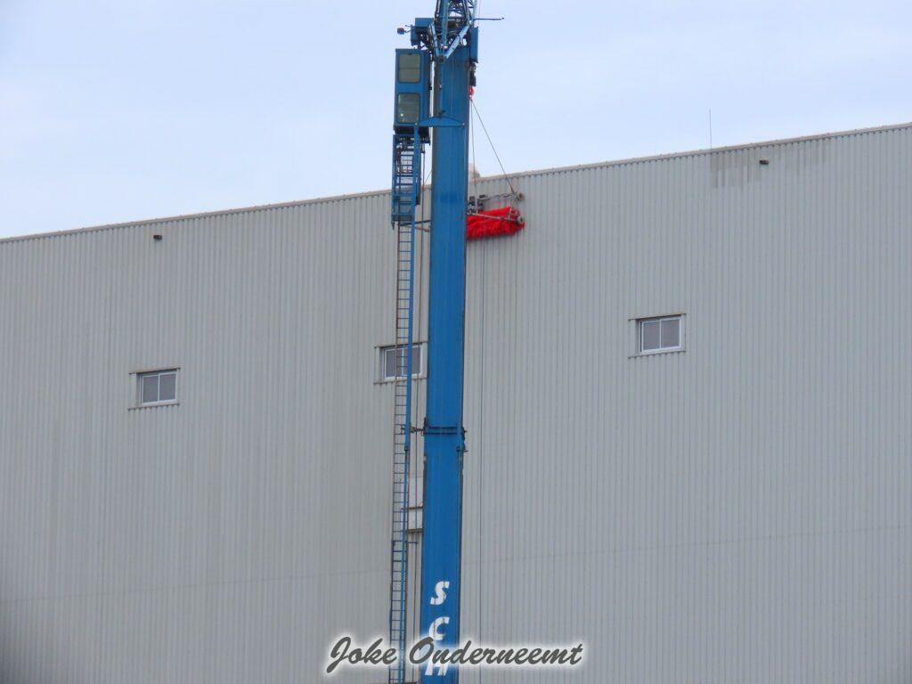 De machinist gaat secuur te werk door dat gevaarte van beneden naar boven te hijsen en weer terug en zo gaat hij denk ik, alle wanden van de mega hoge silo’s bij langs,