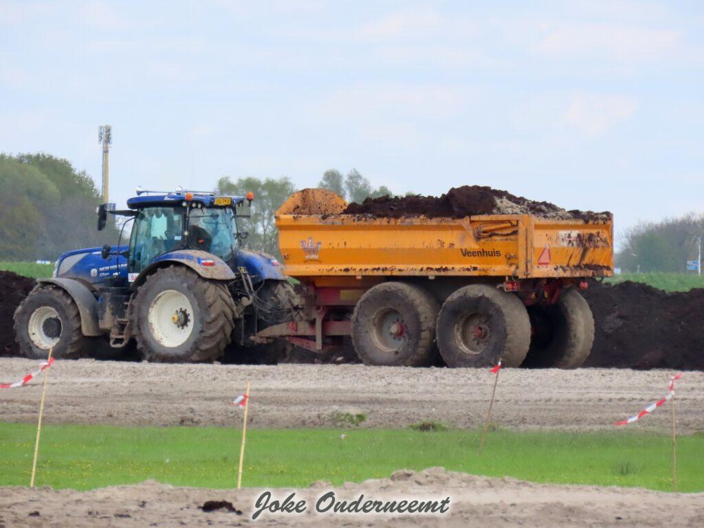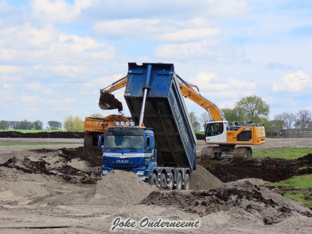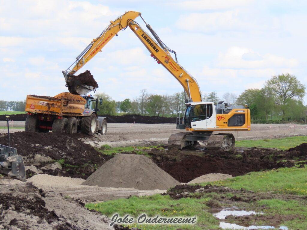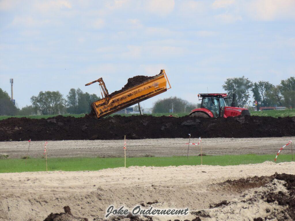Vandaag kon ik er zonder laarzen heen want het was allemaal mooi droog daar gelukkig . Er was veel werkverkeer druk bezig met uitgraven van de zwarte grond op een behoorlijk diepte, en dat werd meteen opgeladen en weggereden . Dan kwamen de vrachtwagens meteen aan om zand weer te lossen en vervolgens kon de sjofel steeds snel te boel gelijk schuiven.