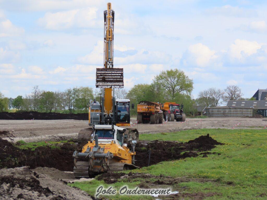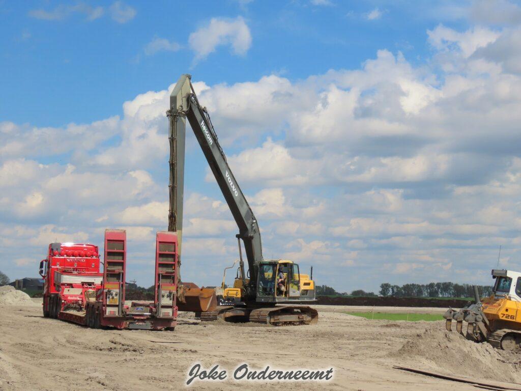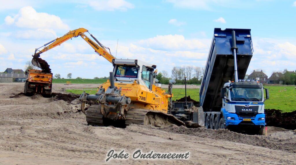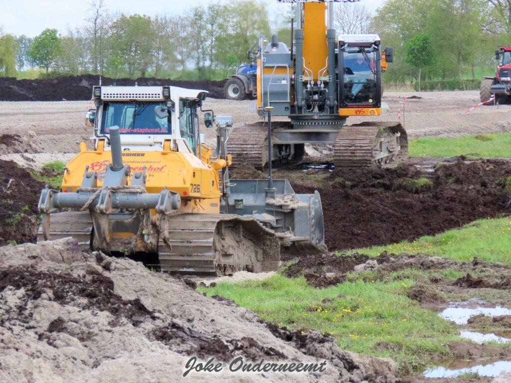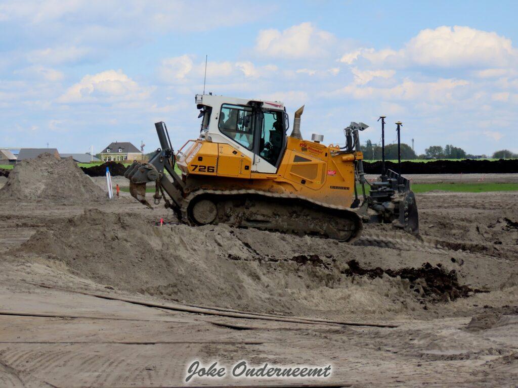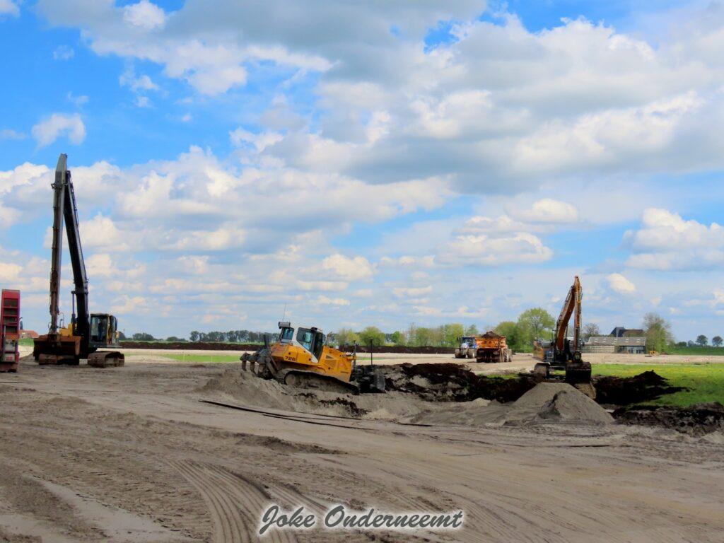 En zo ging het als een geoliede machine de hele dag door, goed op elkaar afgestemd en dat was een mooi gezicht. Ze leggen nu de “wegen voor het werkverkeer” aan en dat gaat dus steeds weer een stuk verder.. Of er nog niet genoeg machine’s waren werd er ook net weer een grote gebracht toen ik er was.