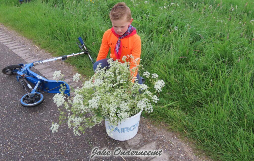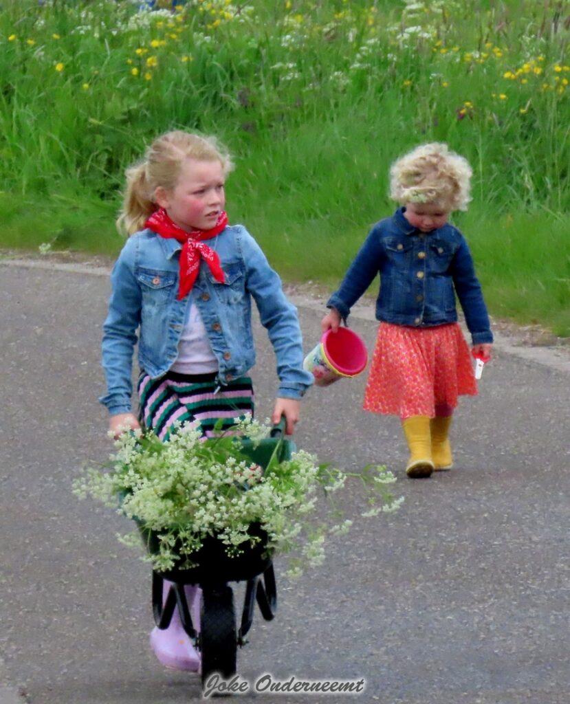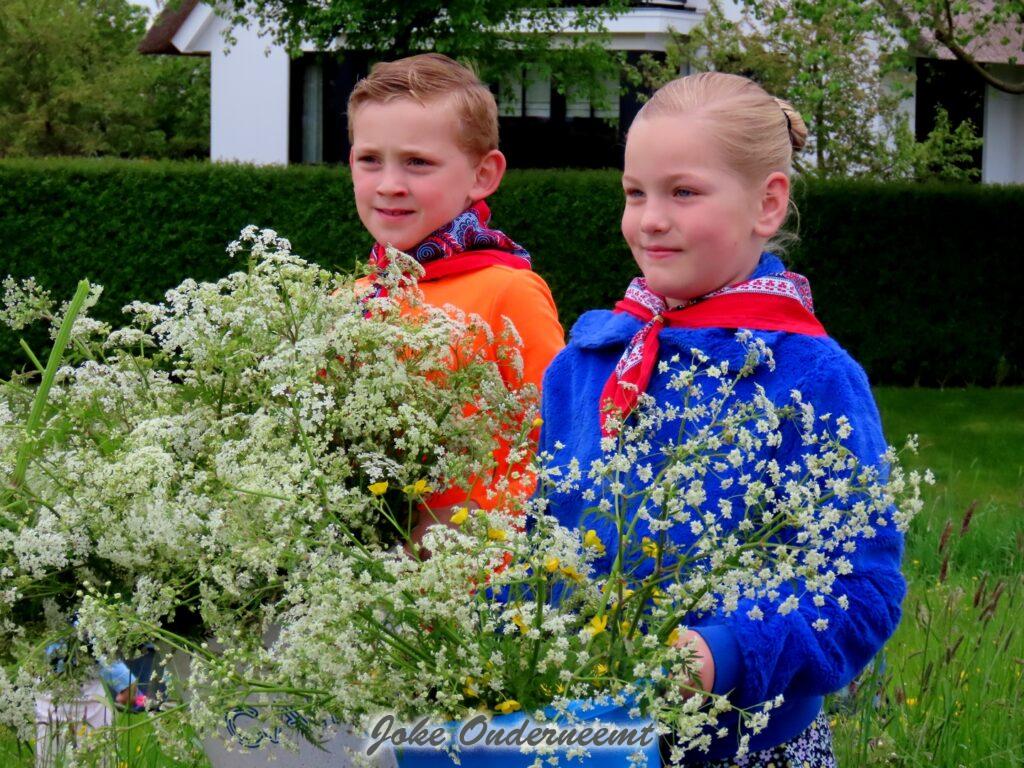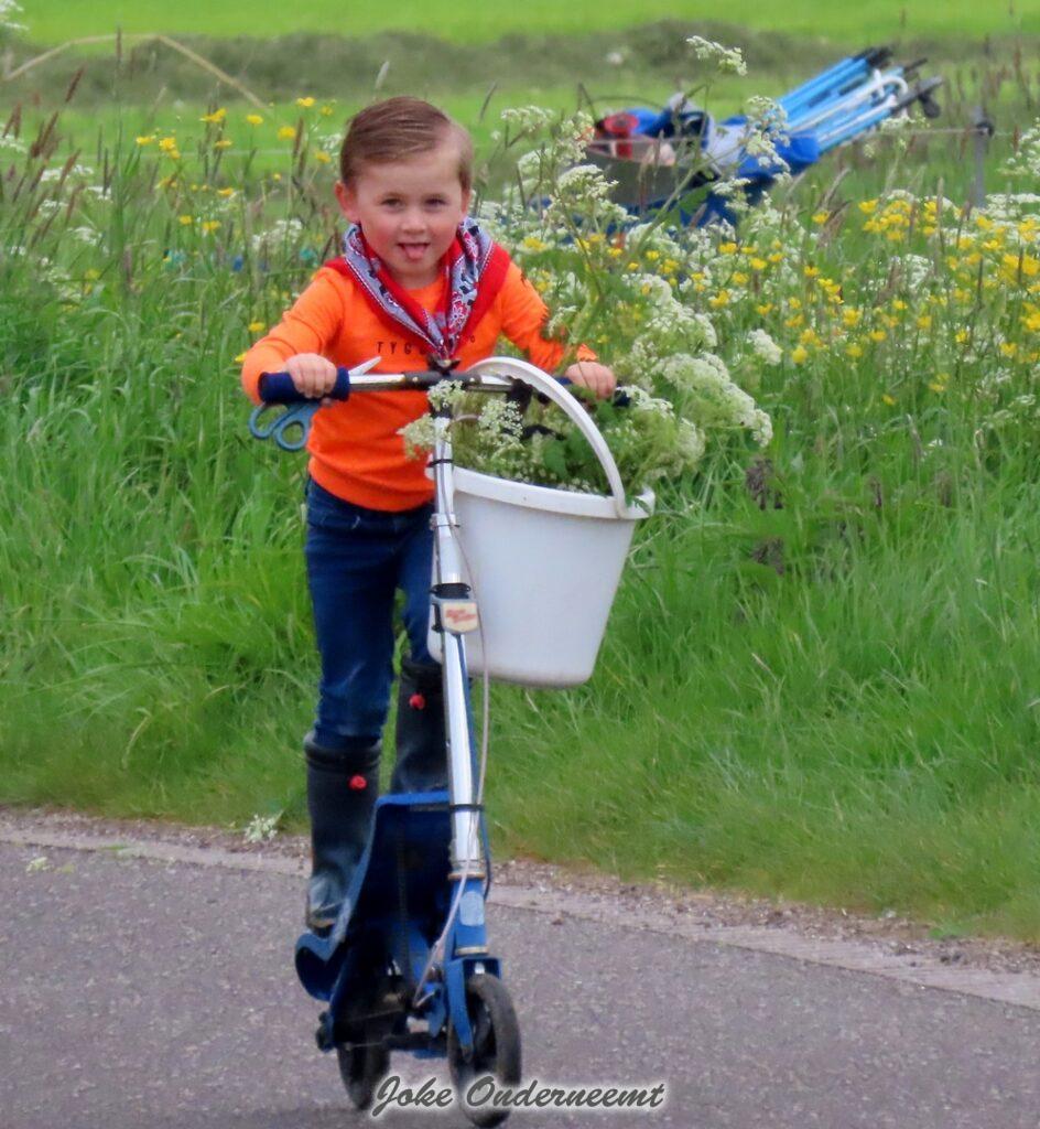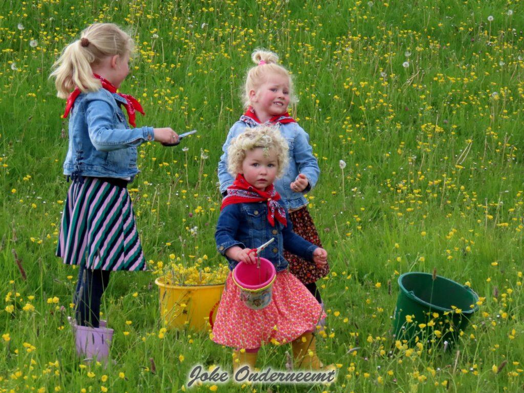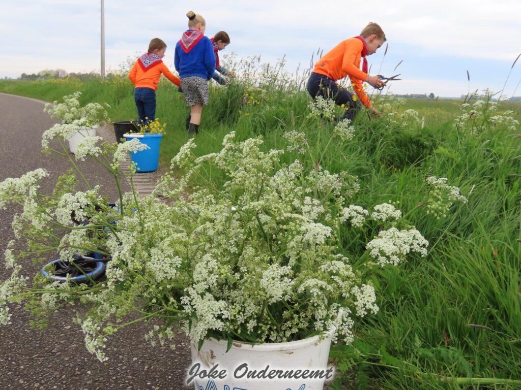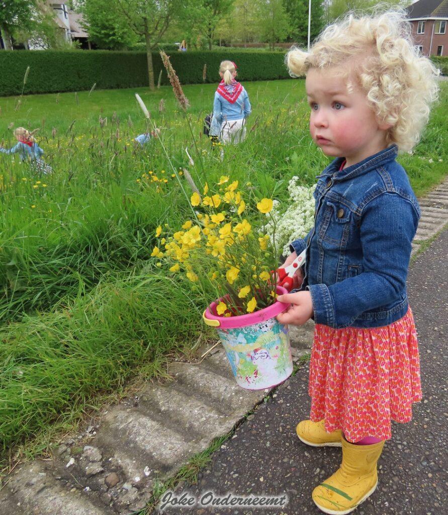 Groot en kleine kids gingen gewapend met emmer en schaar het land in om zoveel mogelijk bloemen te plukken, helaas was er geen pinksterbloem te bekennen dit jaar maar er was nog genoeg materiaal om wat moois van te maken gelukkig.