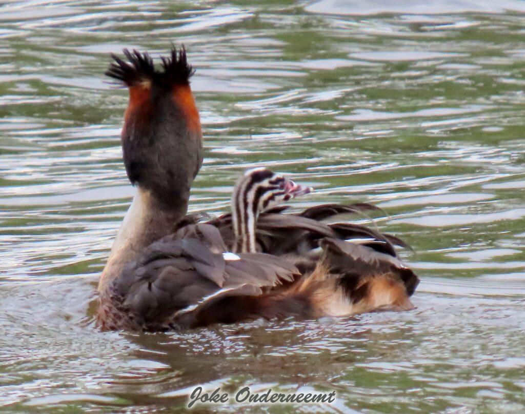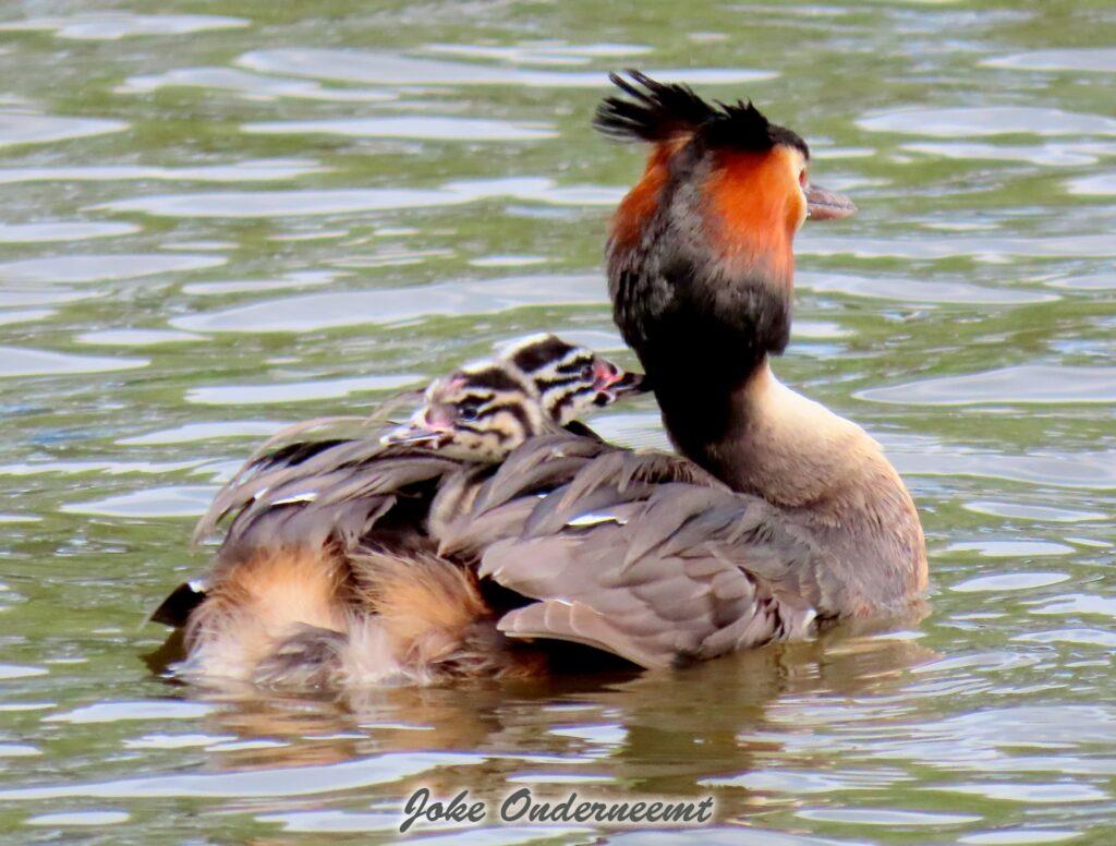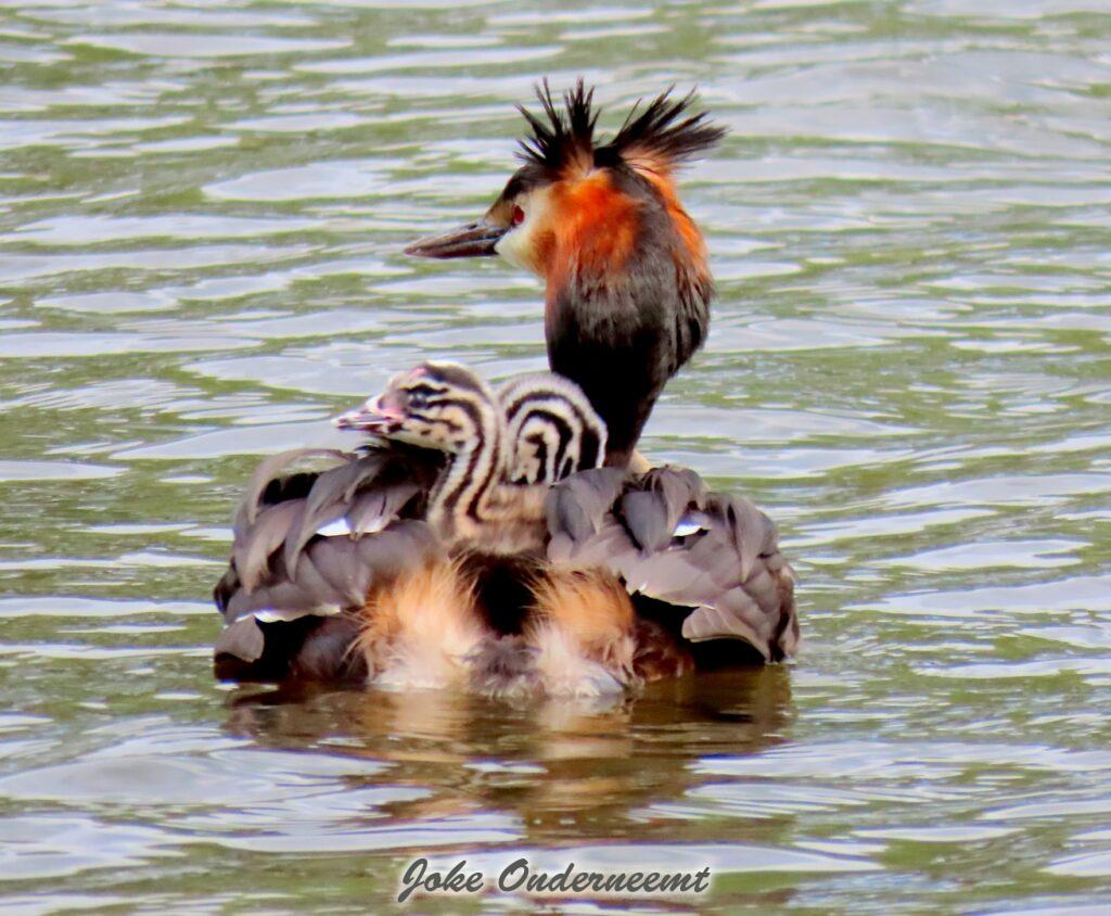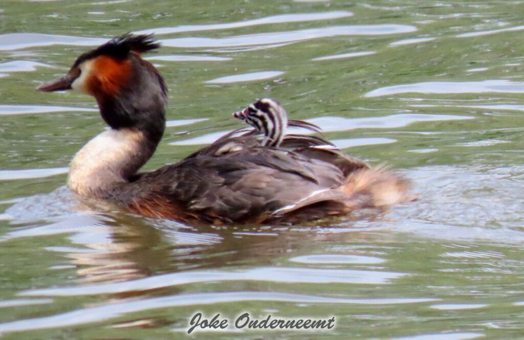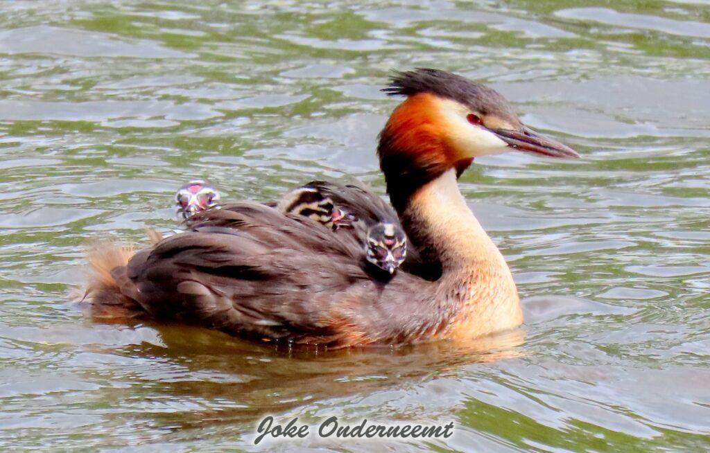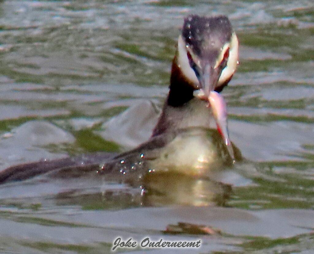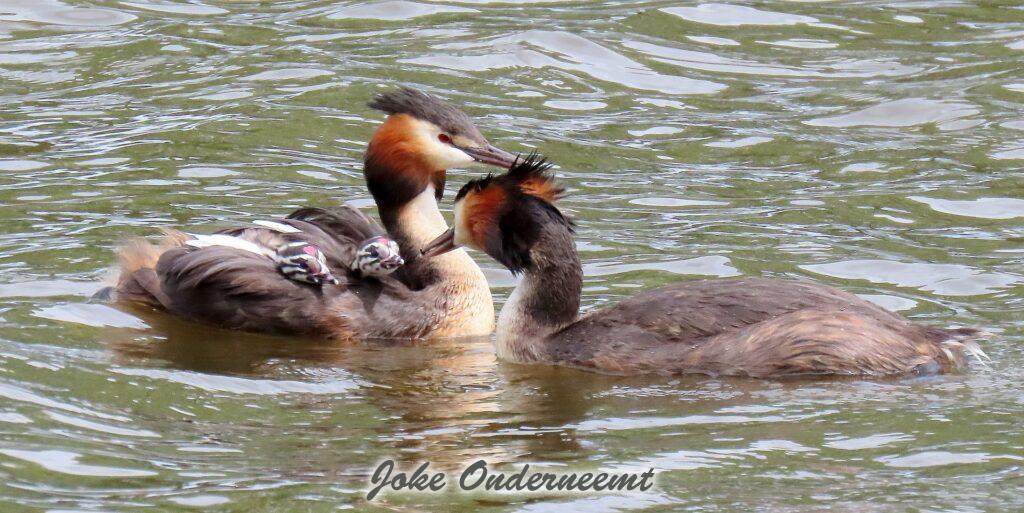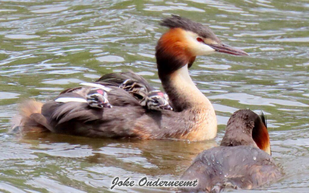 En ja hoor daar zag ik mama fuut met 1 kleintje op haar rug wat een leuk gezicht.. maar ik dacht er nog 1 te zien en toen ik thuis de foto’s bekeek zaten er maar liefst 3 op mama’s rug wat een geluk had ik dus..en papa die was druk bezig met voeren !