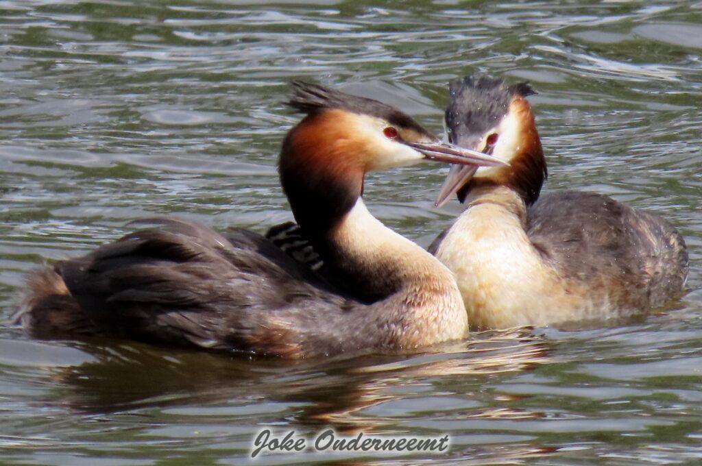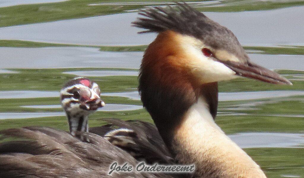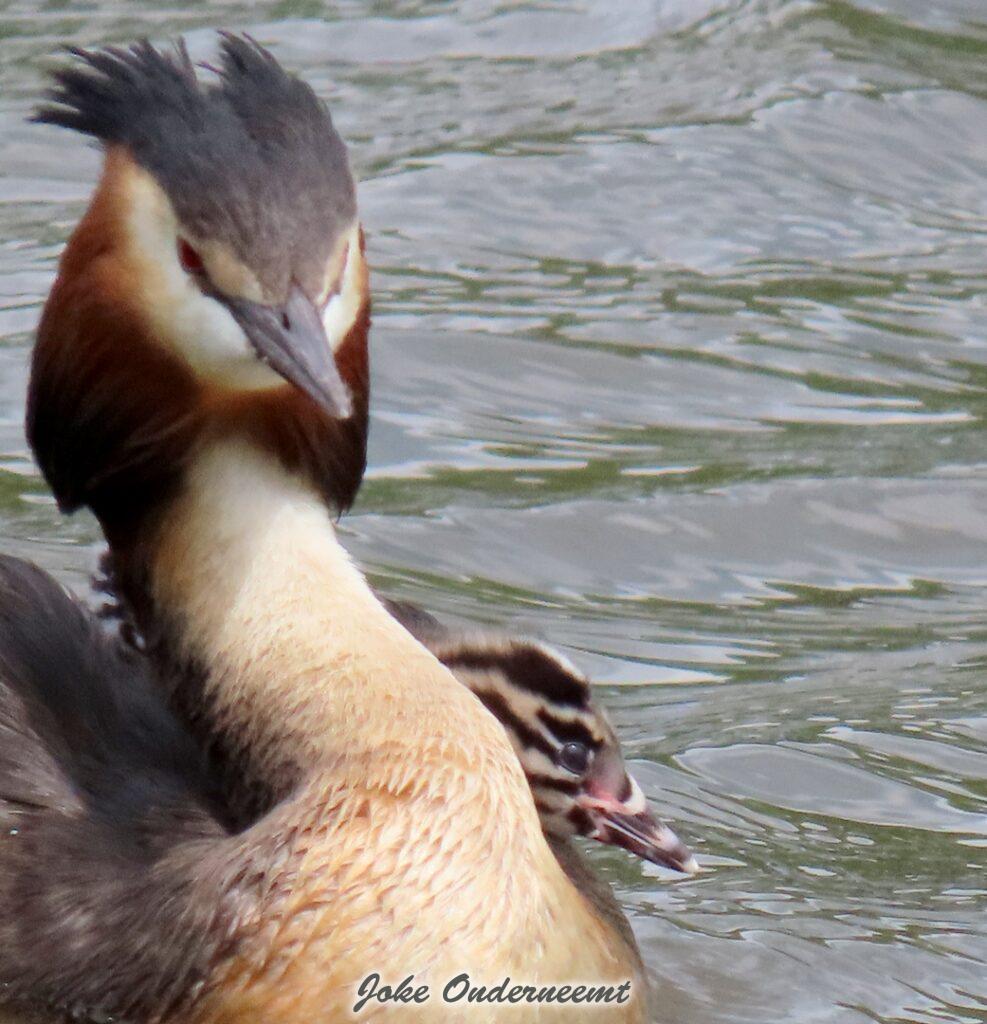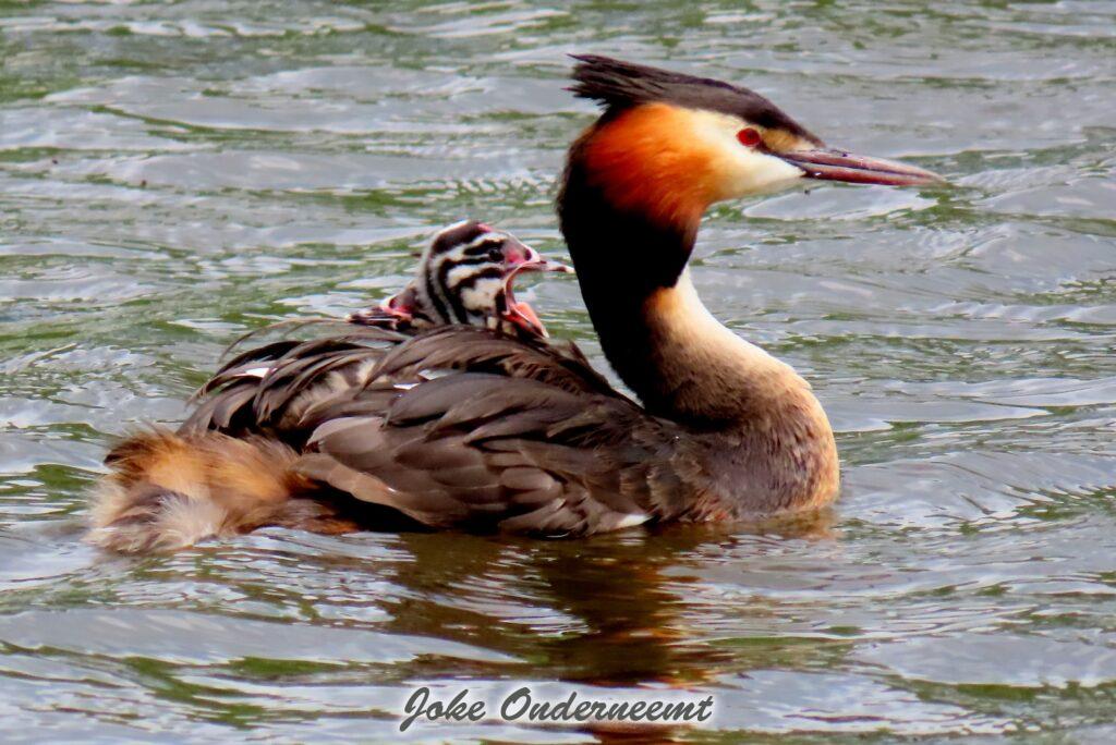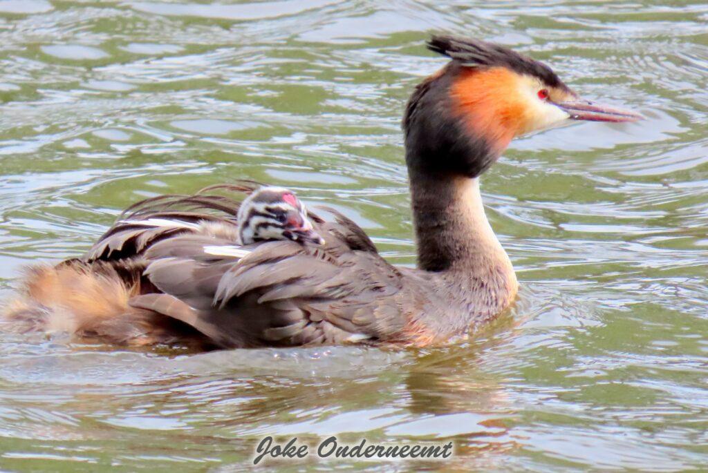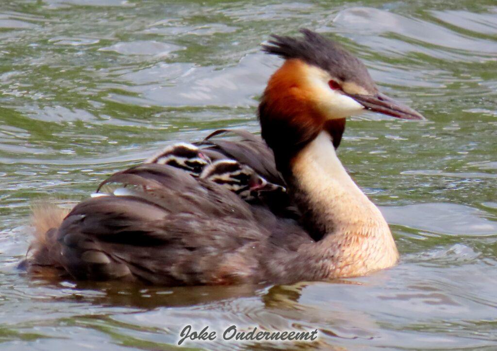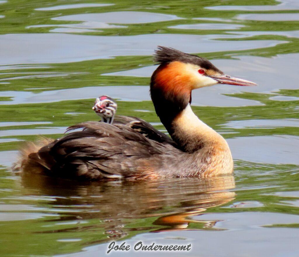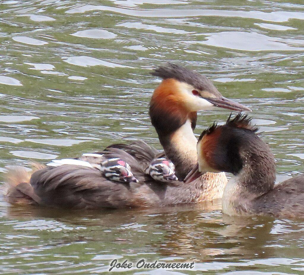 En ja hoor daar zag ik mama fuut met 1 kleintje op haar rug wat een leuk gezicht.. maar ik dacht er nog 1 te zien en toen ik thuis de foto’s bekeek zaten er maar liefst 3 op mama’s rug wat een geluk had ik dus..en papa die was druk bezig met voeren !