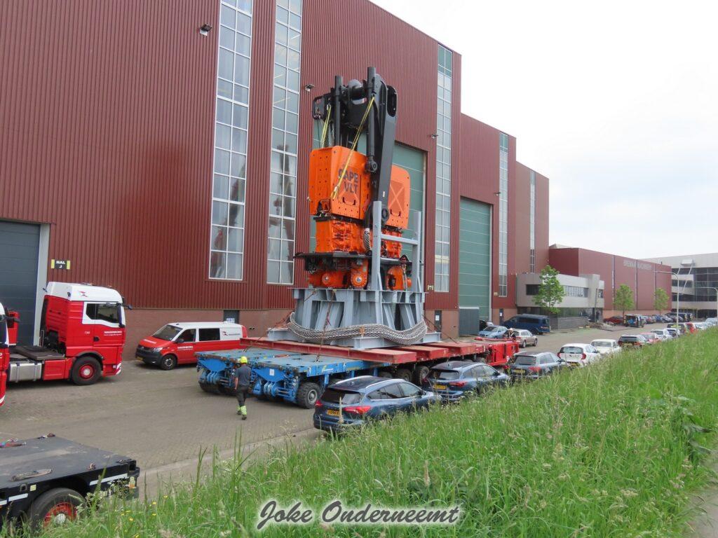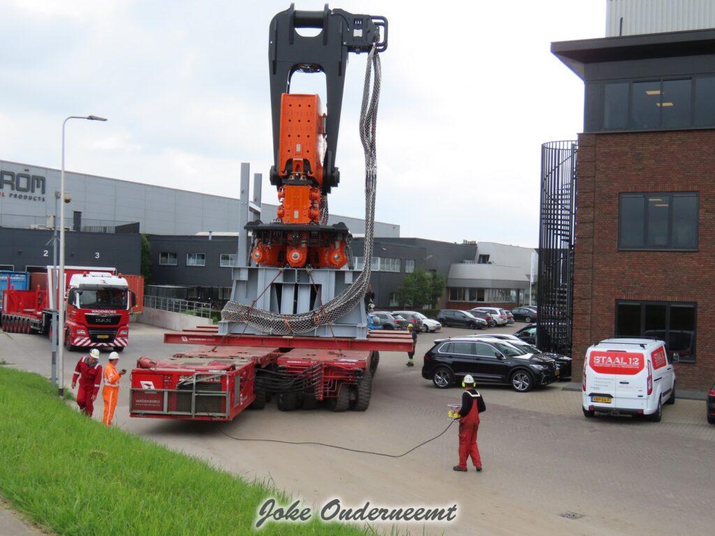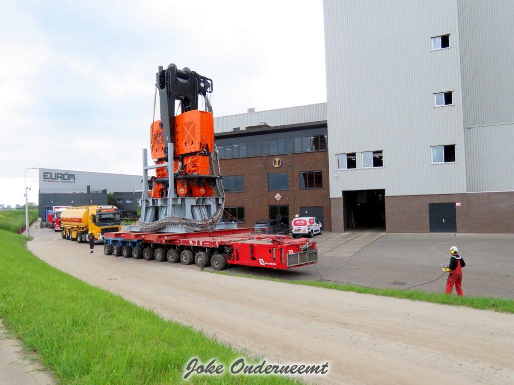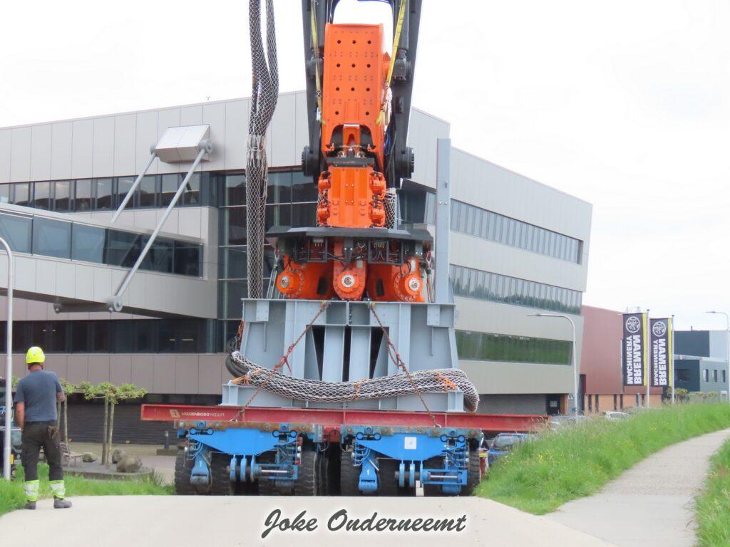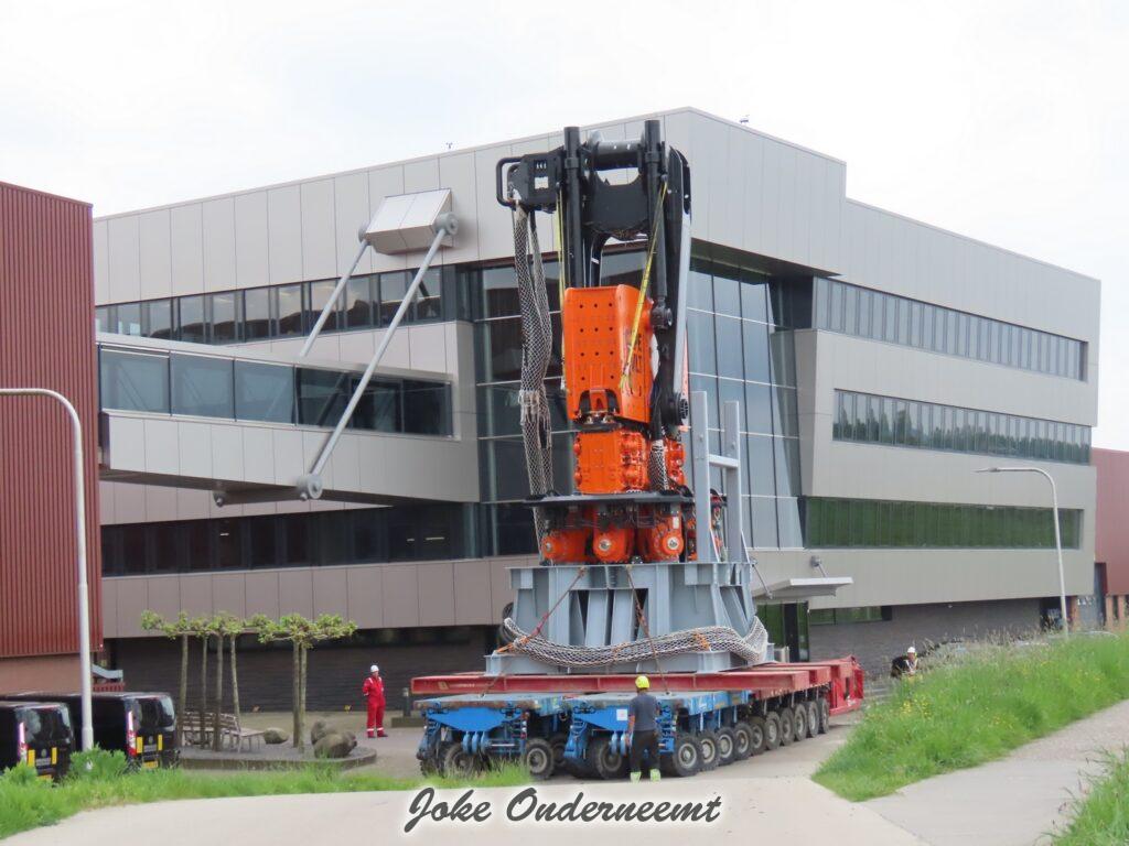 Deze mega machine van 215 ton is daar nodig om op de zee heipalen mee de grond in te trillen, een reuze trilblok dus eigenlijk.