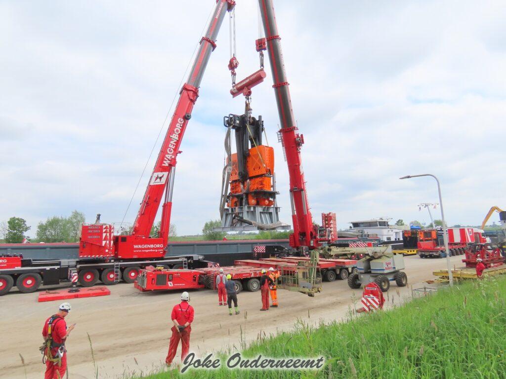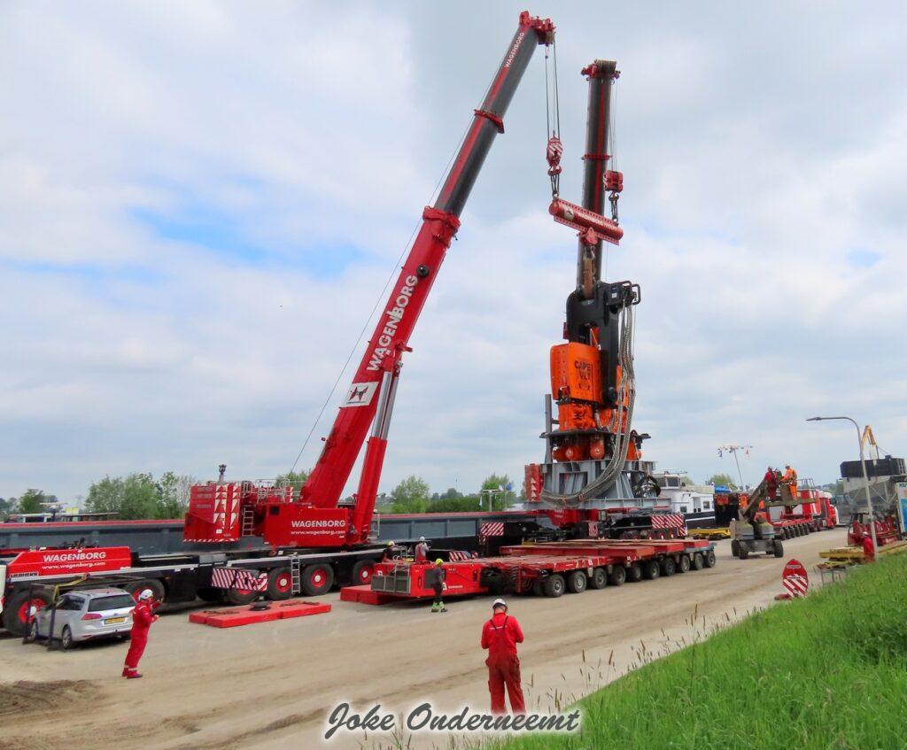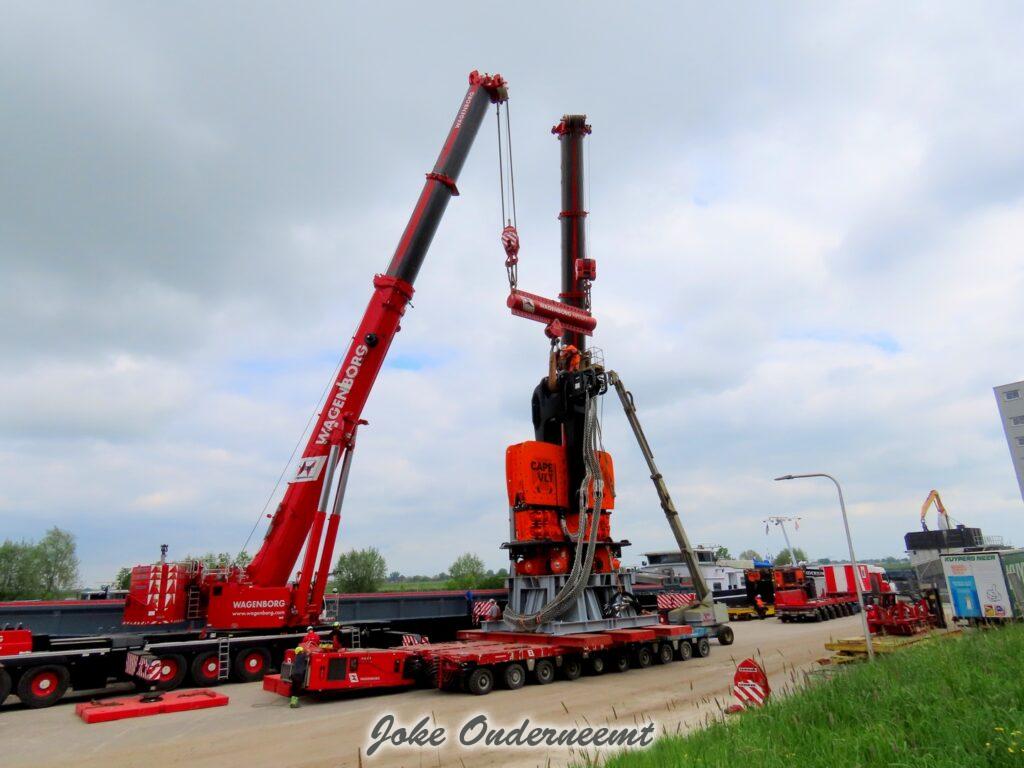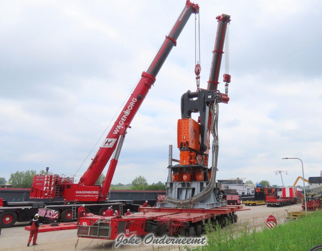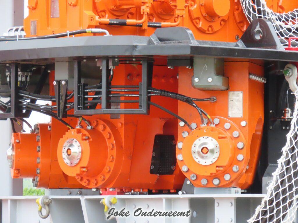 Deze mega machine van 215 ton is daar nodig om op de zee heipalen mee de grond in te trillen, een reuze trilblok dus eigenlijk.
