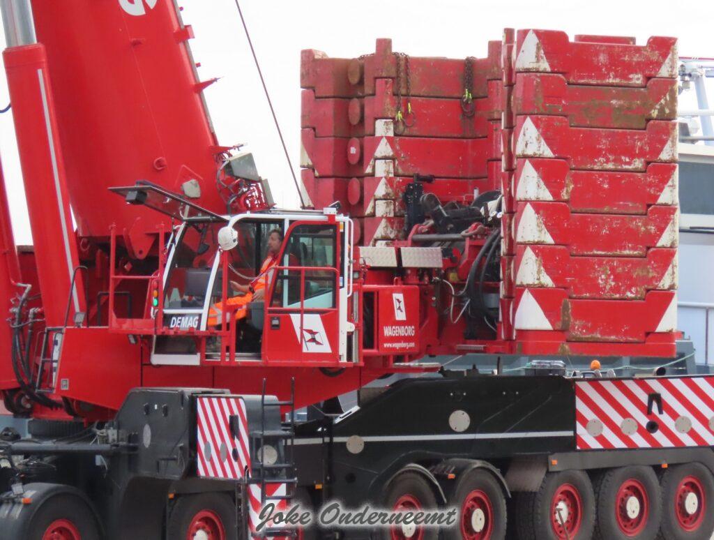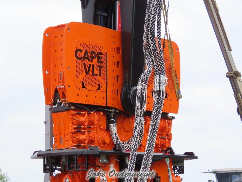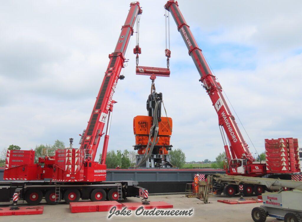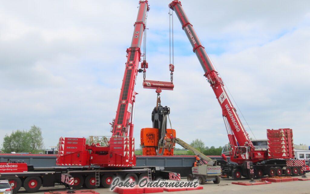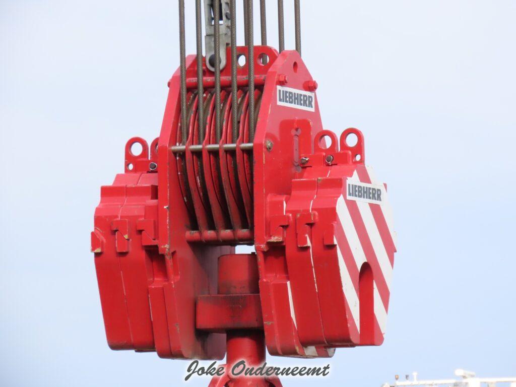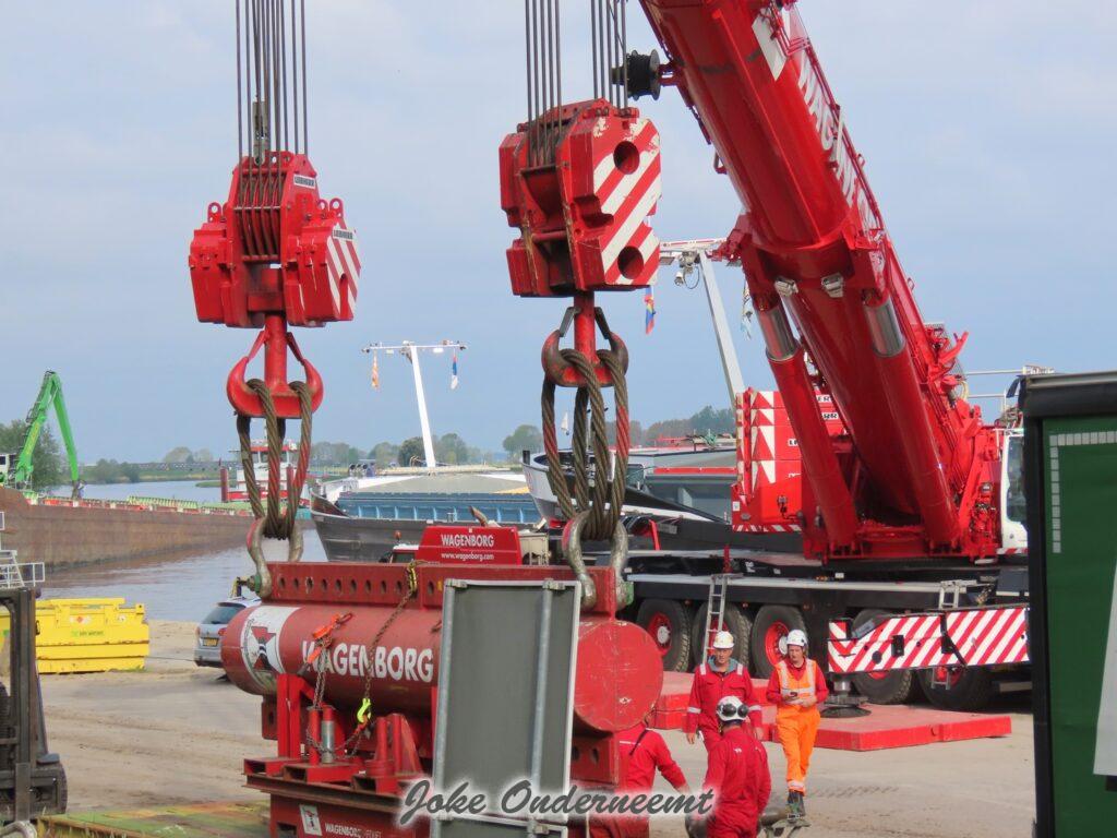Deze mega machine van 215 ton is daar nodig om op de zee heipalen mee de grond in te trillen, een reuze trilblok dus eigenlijk.