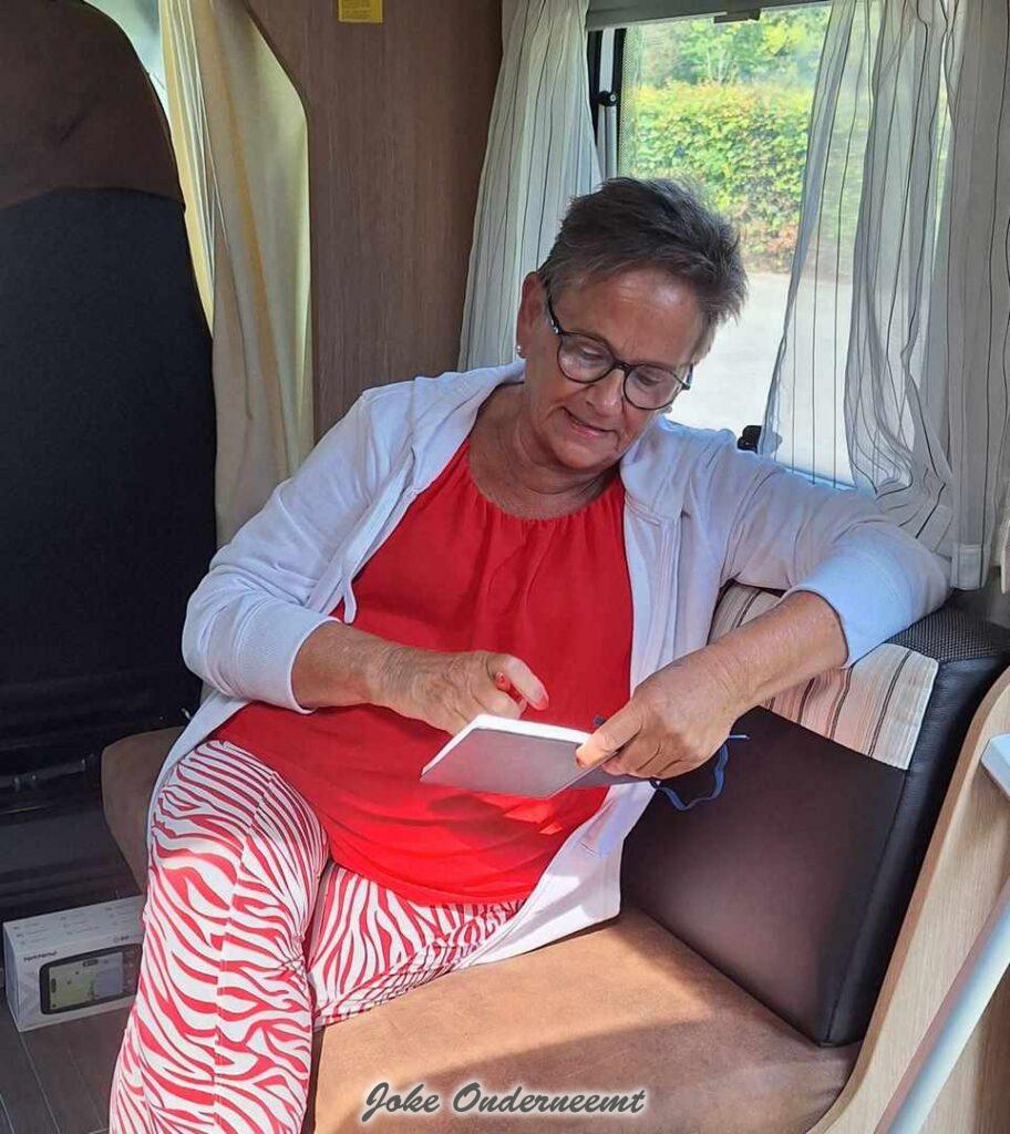 Ontzettend lieve mensen zijn dit gewoon dat had ik dus goed gezien. Ze hadden de fietsen bij zicht en meneer ging de” pontjes” route fietsen door de polder, en mevrouw bleef thuis lekker uitrusten. Ik mocht nog even de camper bezichtigen en vroeg mevrouw of ze mij op de foto mocht zetten…nou vooruit dan maar ook wel een keer leuk !