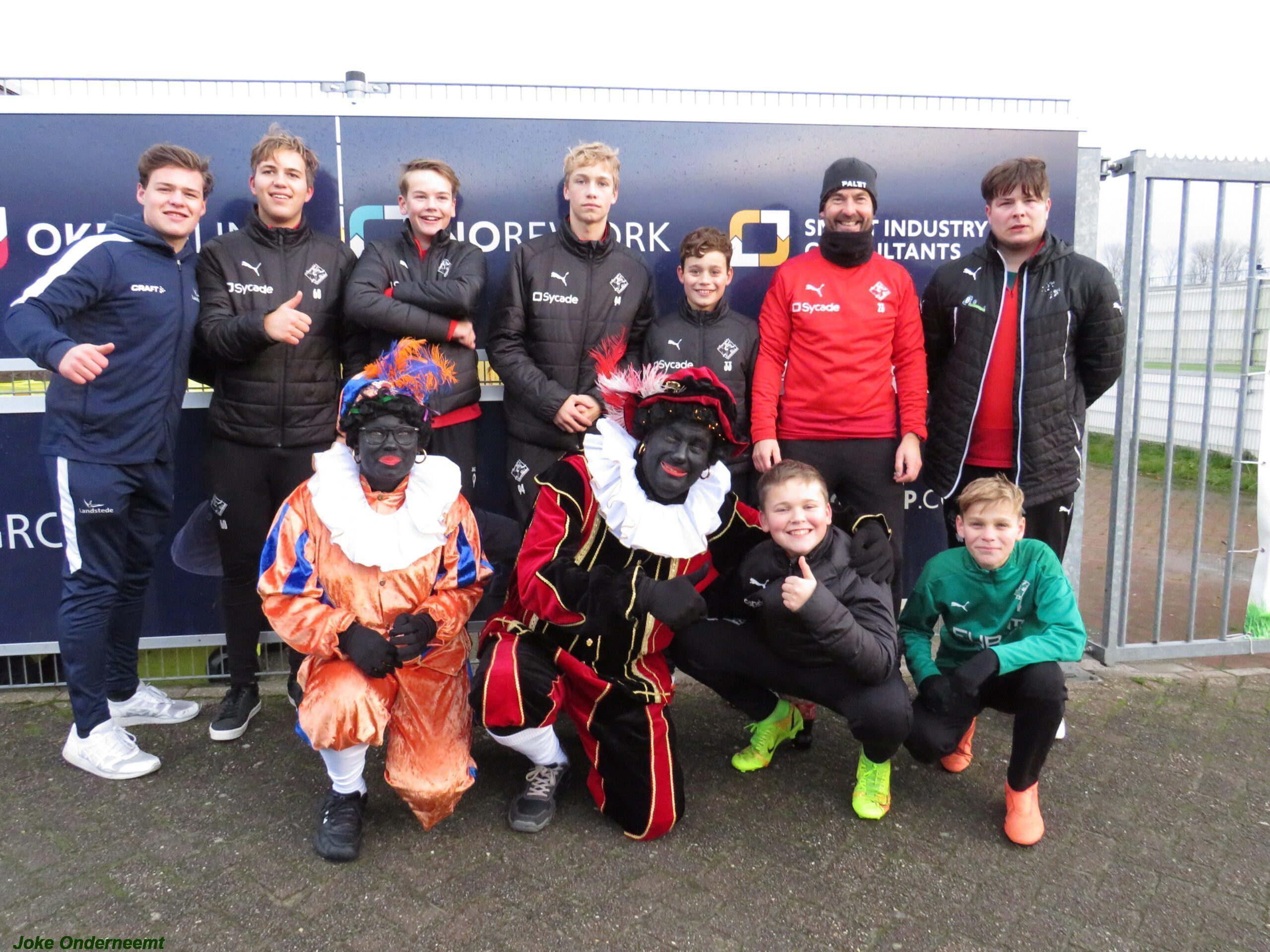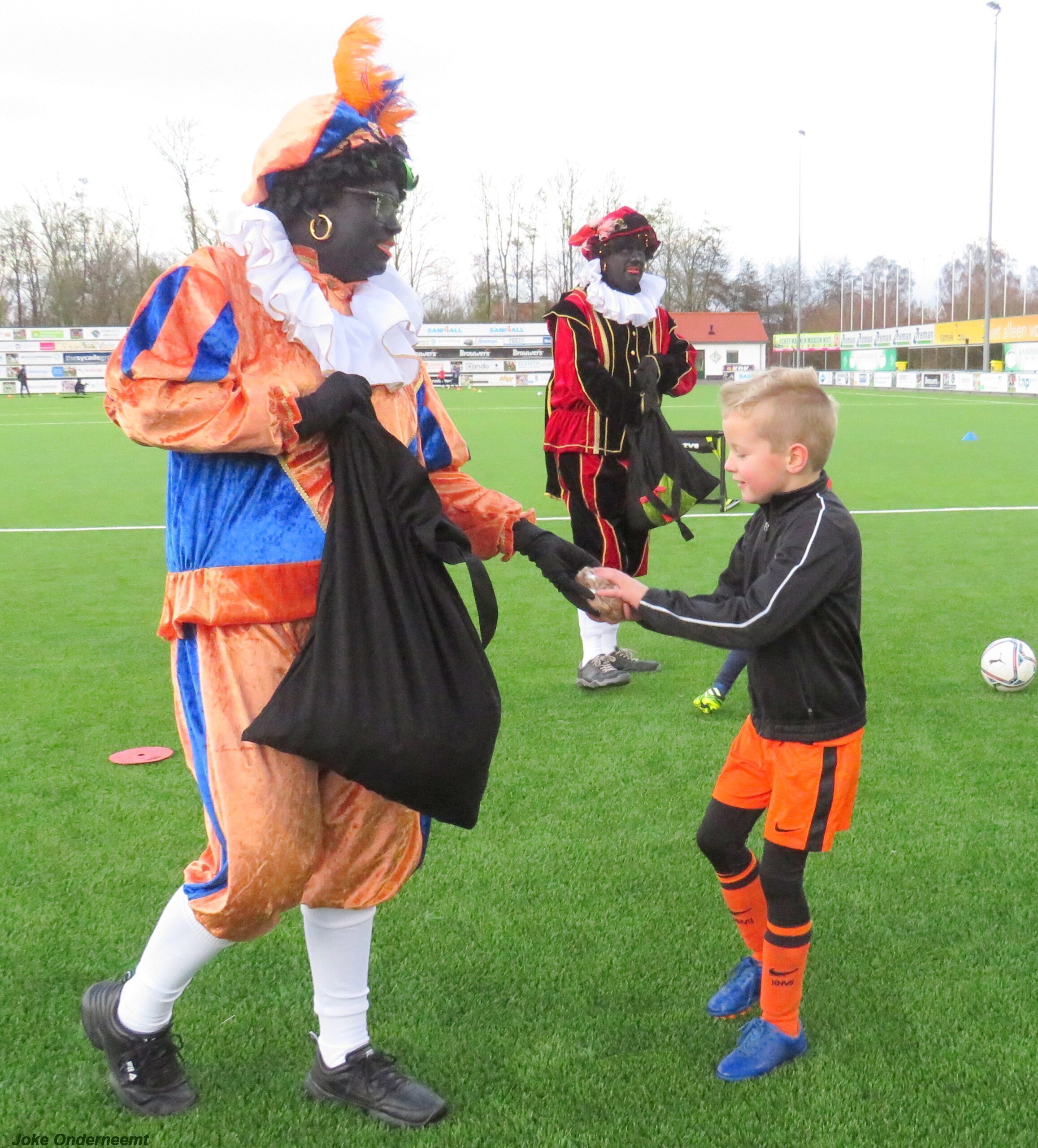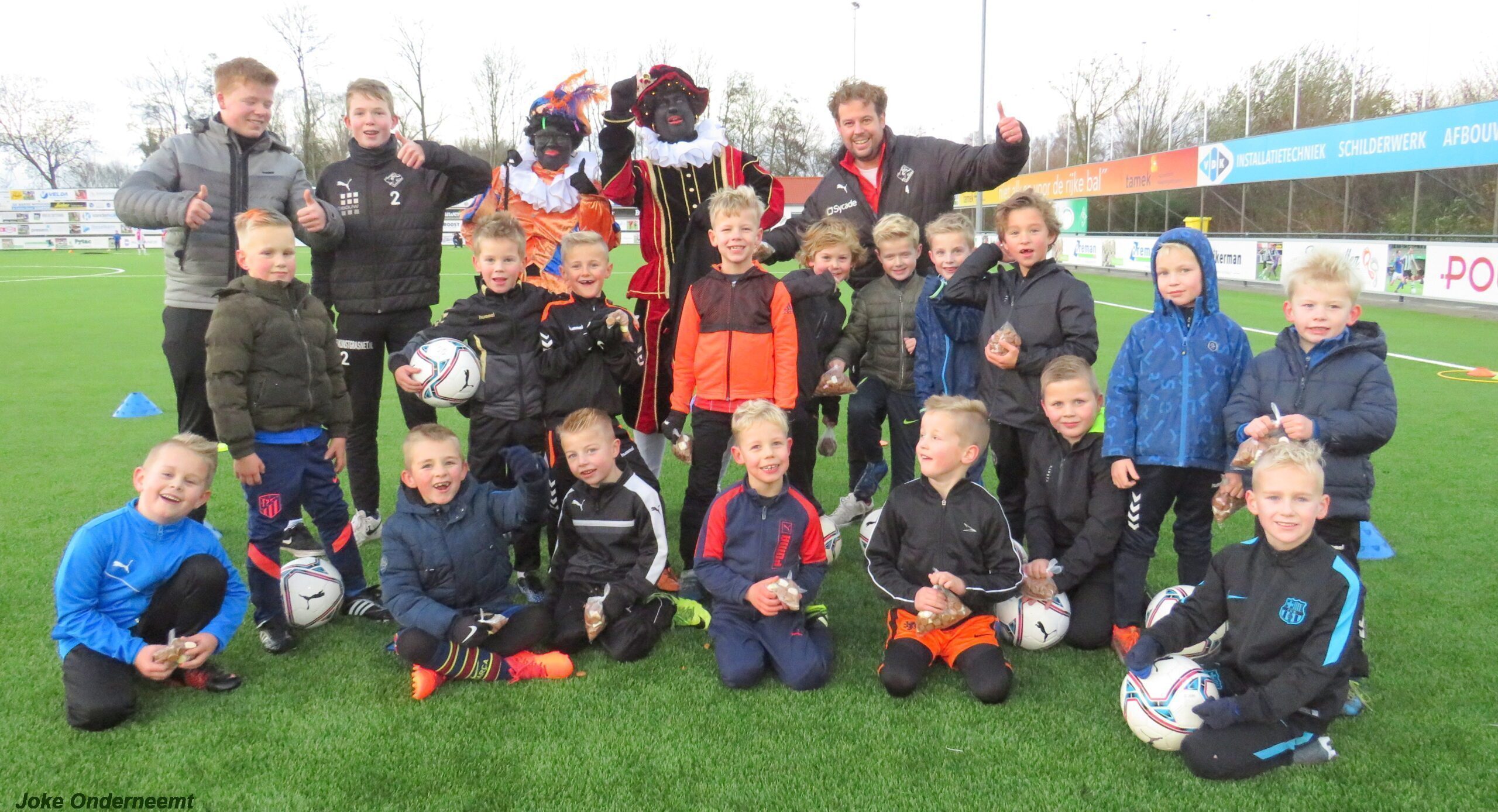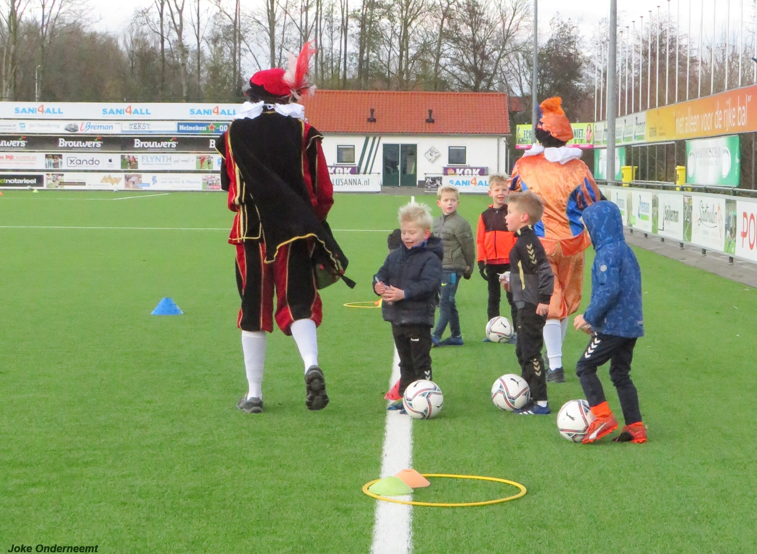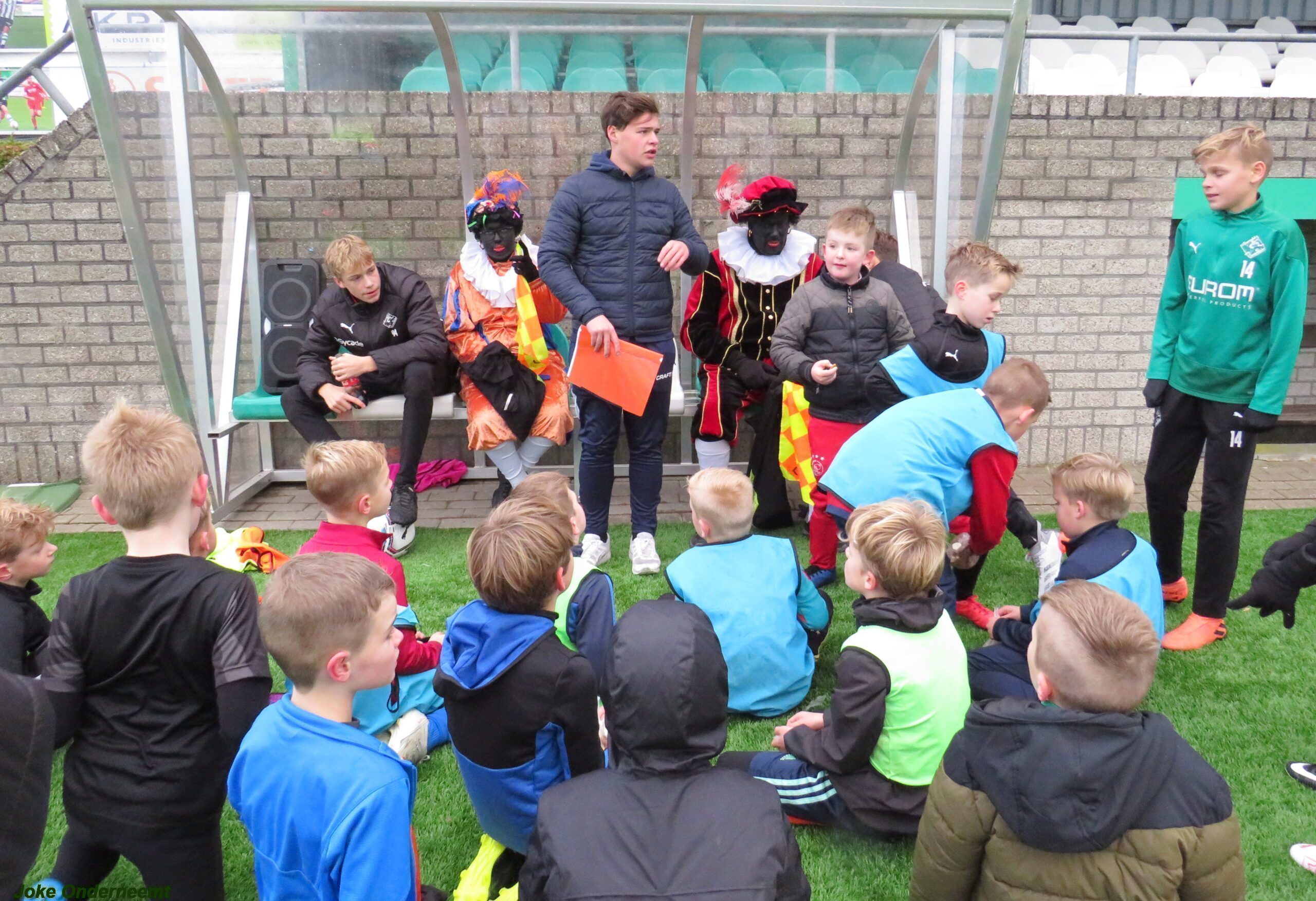 Nadat er vijf teams waren gevormd met de namen Marsepijnteam – Pepernotenteam- Speculaasteam-Chocoladeteam en het Stoombootteam werd er lekker gespeeld en toen kwamen er onverwachts in de rust twee pieten het veld op en kregen de spelertjes allemaal een zakje met pepernoten. Ook hielpen de pieten na wat uitleg te hebben gekregen, maar even met vlaggen want ze vonden voetballen zelf ook wel erg leuk.