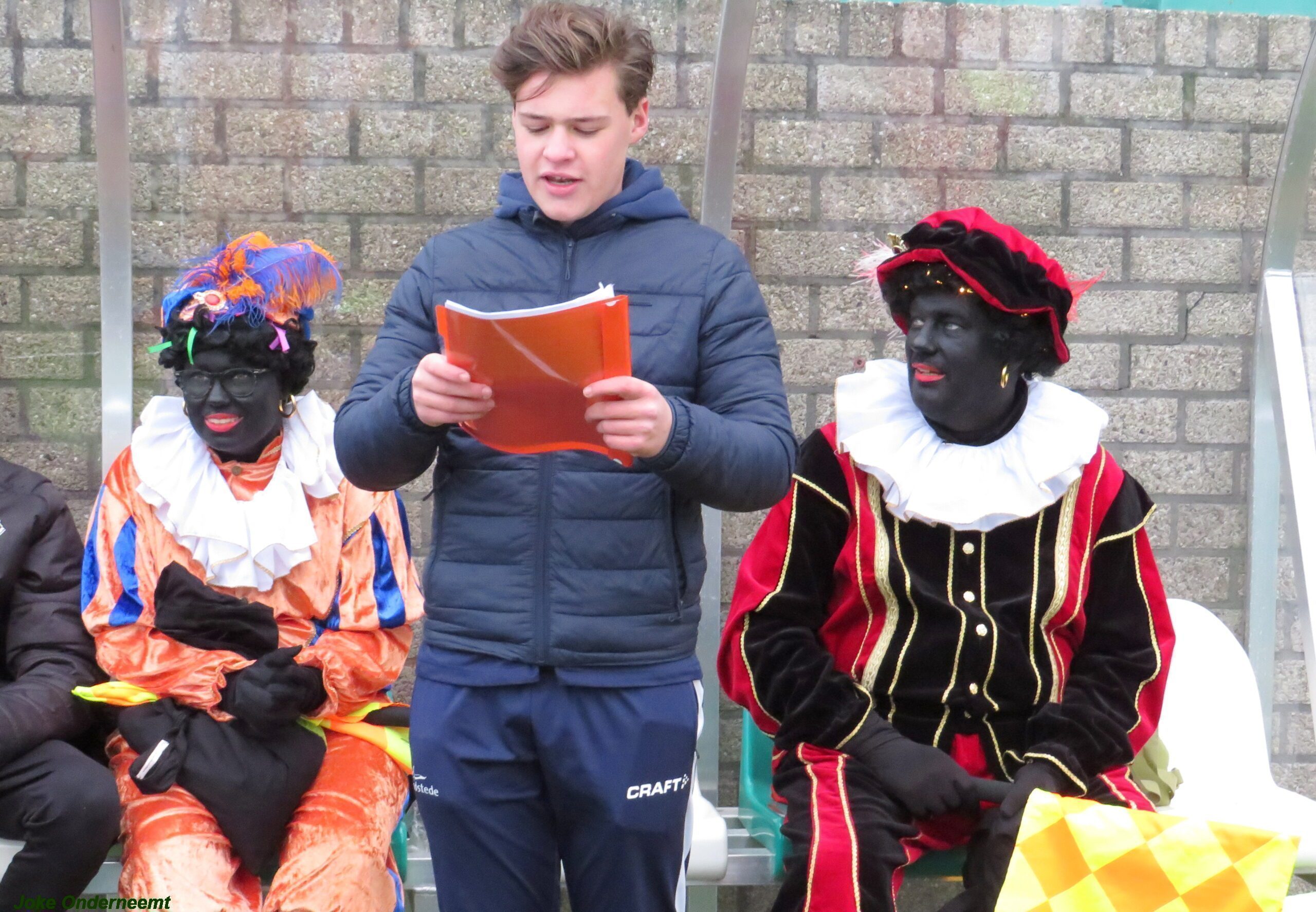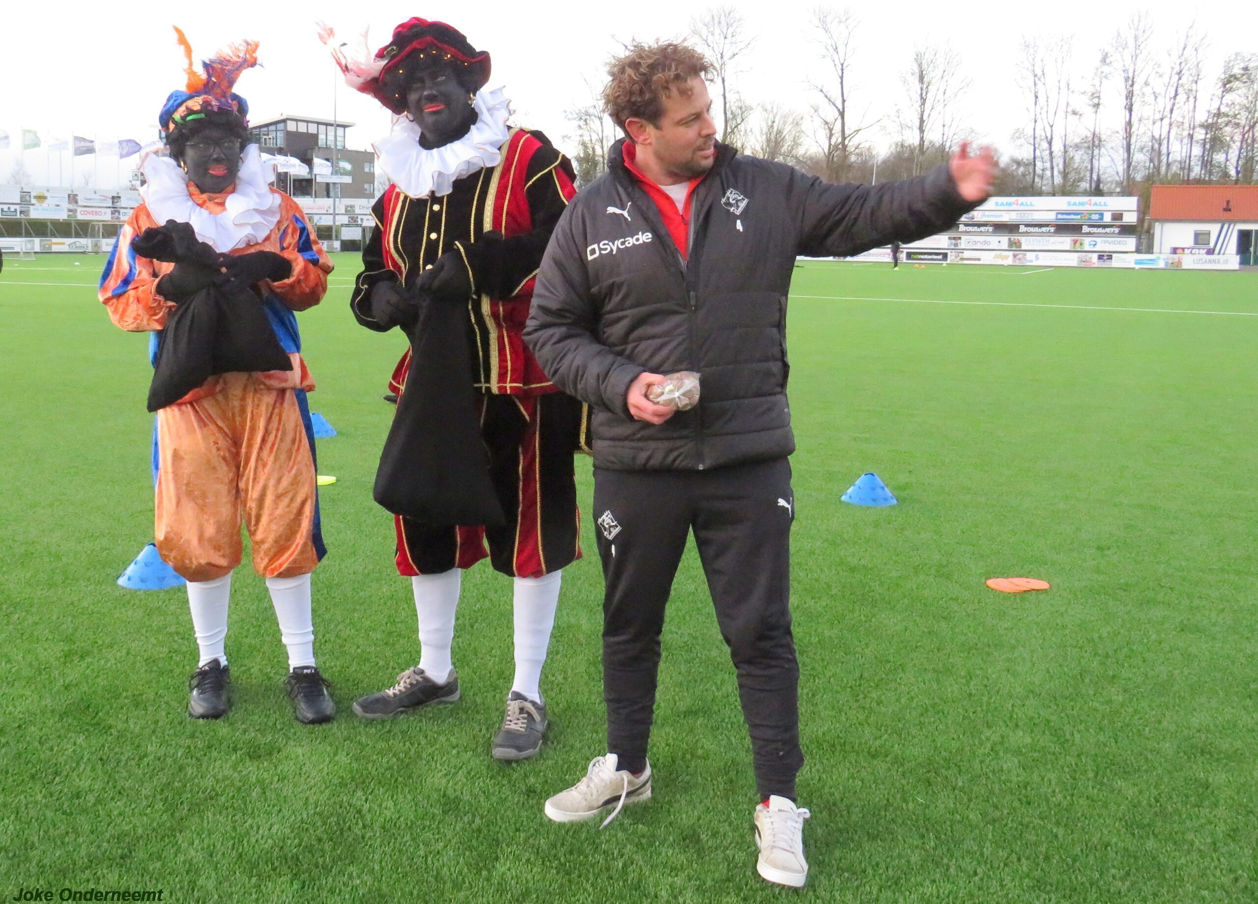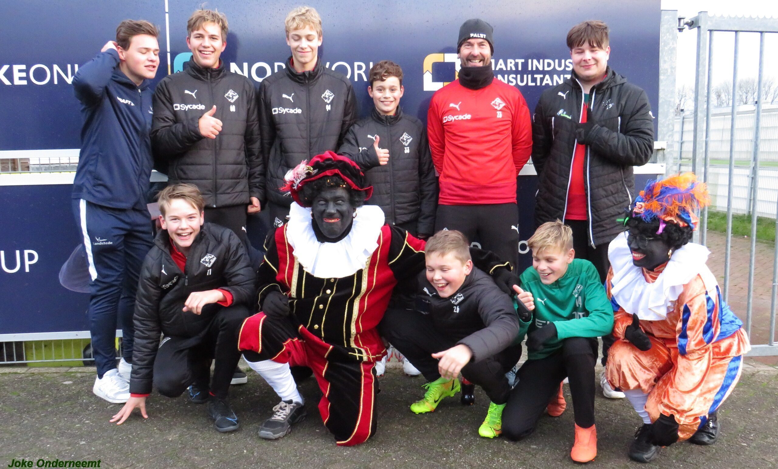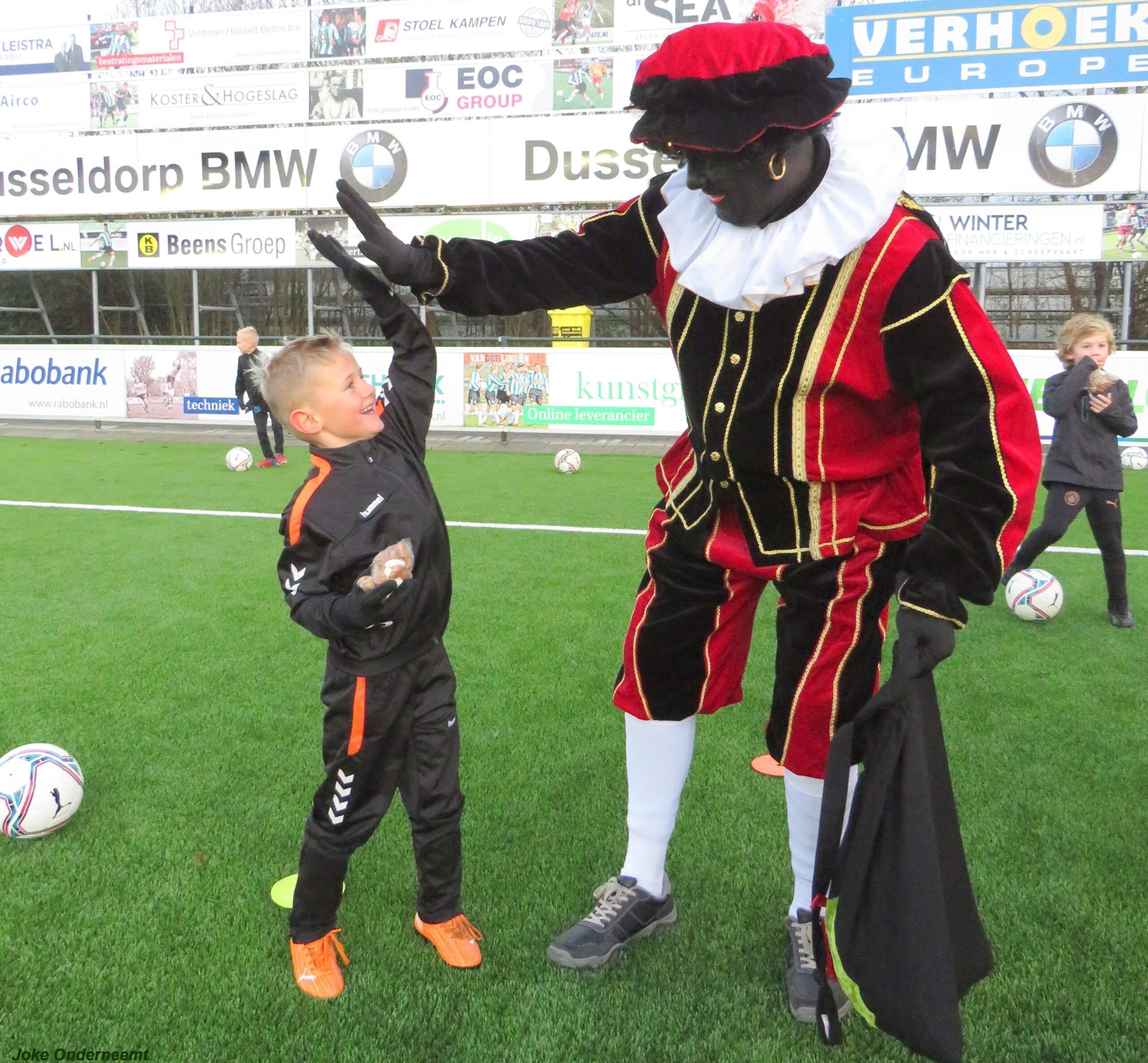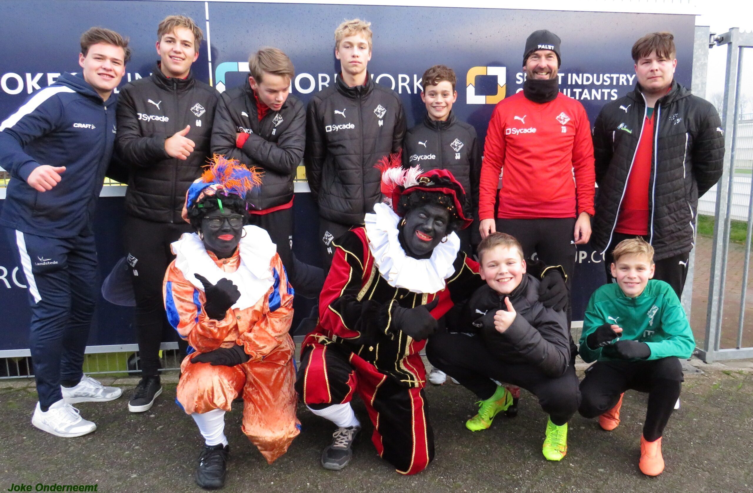 Nadat er vijf teams waren gevormd met de namen Marsepijnteam – Pepernotenteam- Speculaasteam-Chocoladeteam en het Stoombootteam werd er lekker gespeeld en toen kwamen er onverwachts in de rust twee pieten het veld op en kregen de spelertjes allemaal een zakje met pepernoten. Ook hielpen de pieten na wat uitleg te hebben gekregen, maar even met vlaggen want ze vonden voetballen zelf ook wel erg leuk.