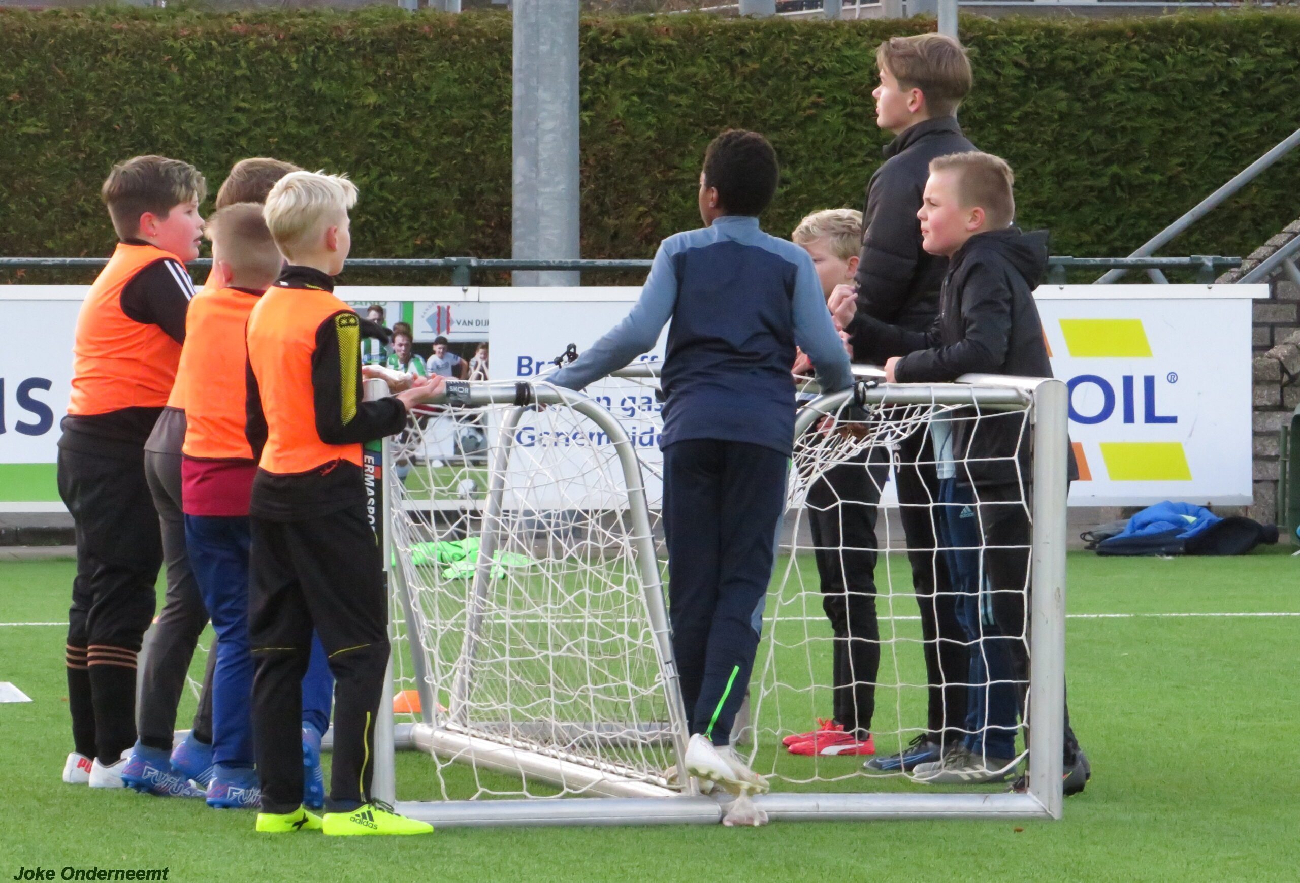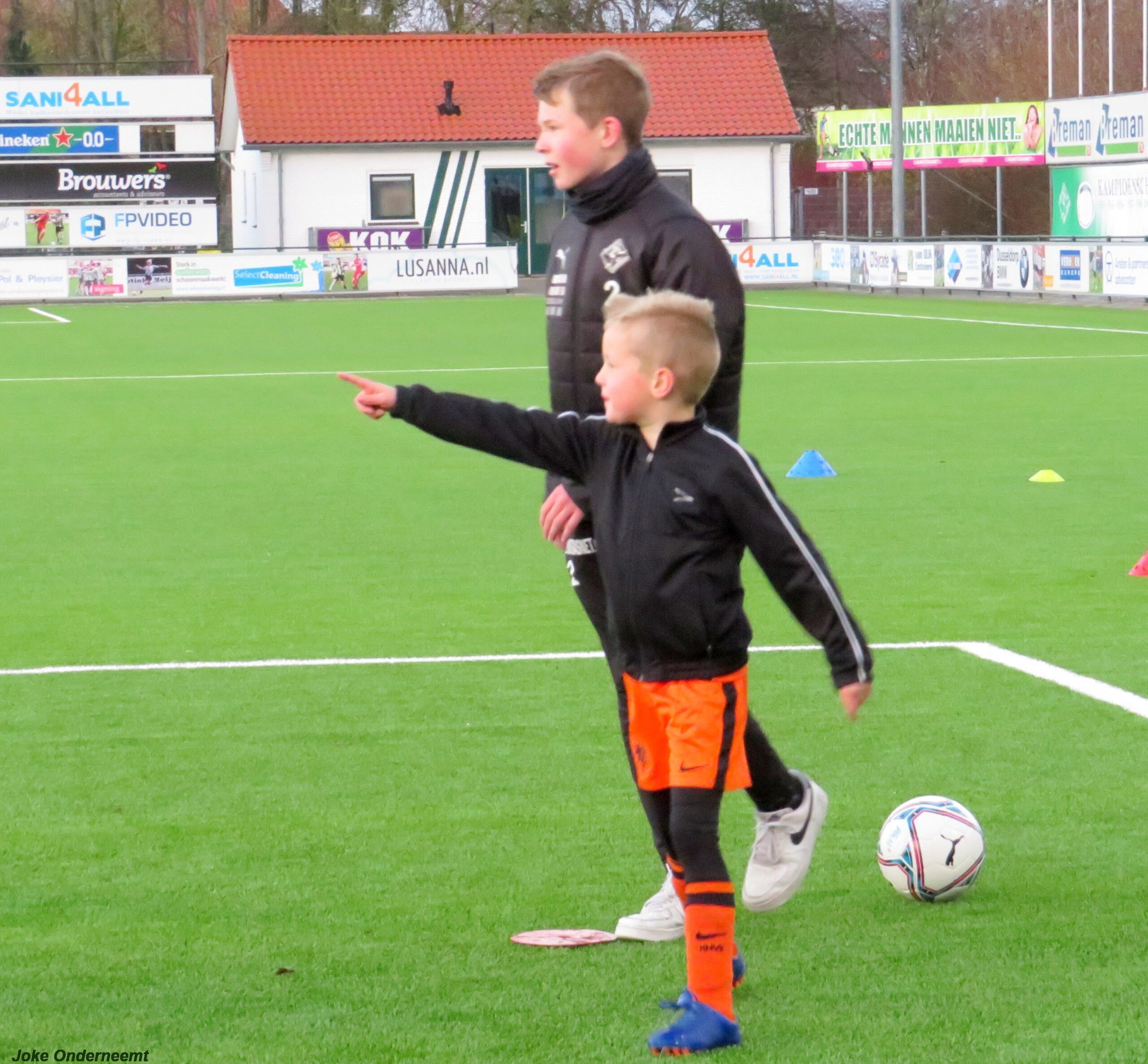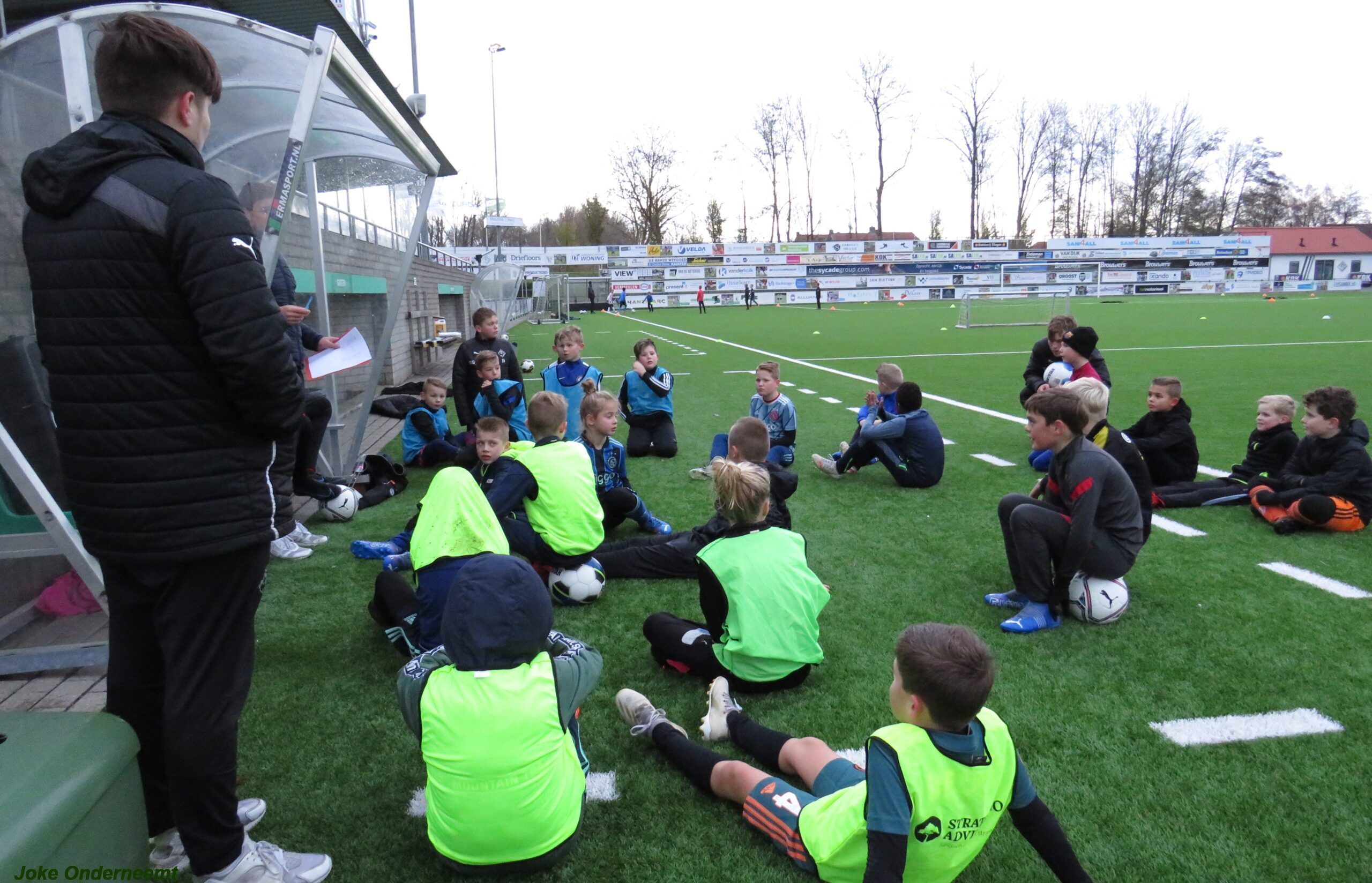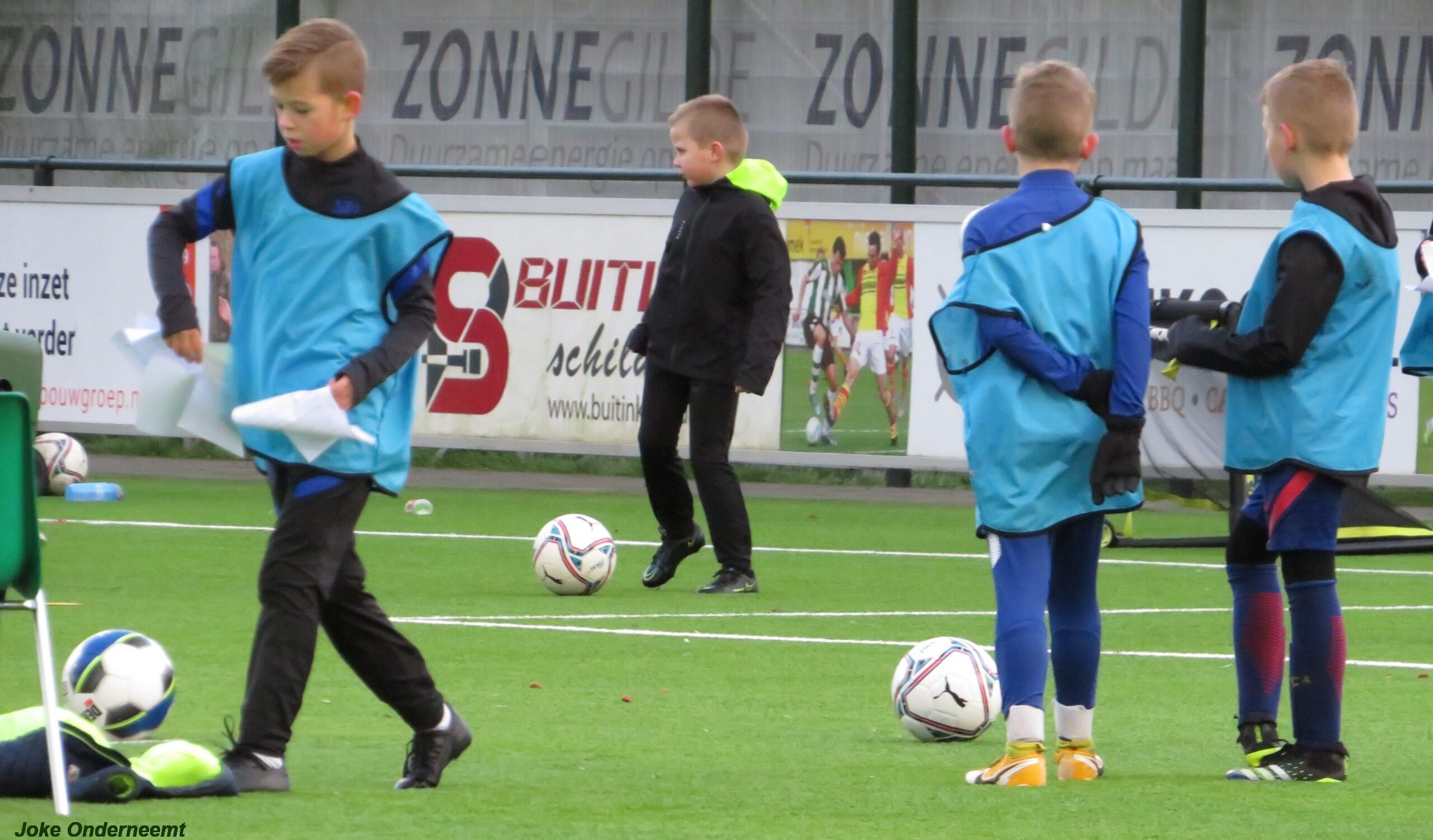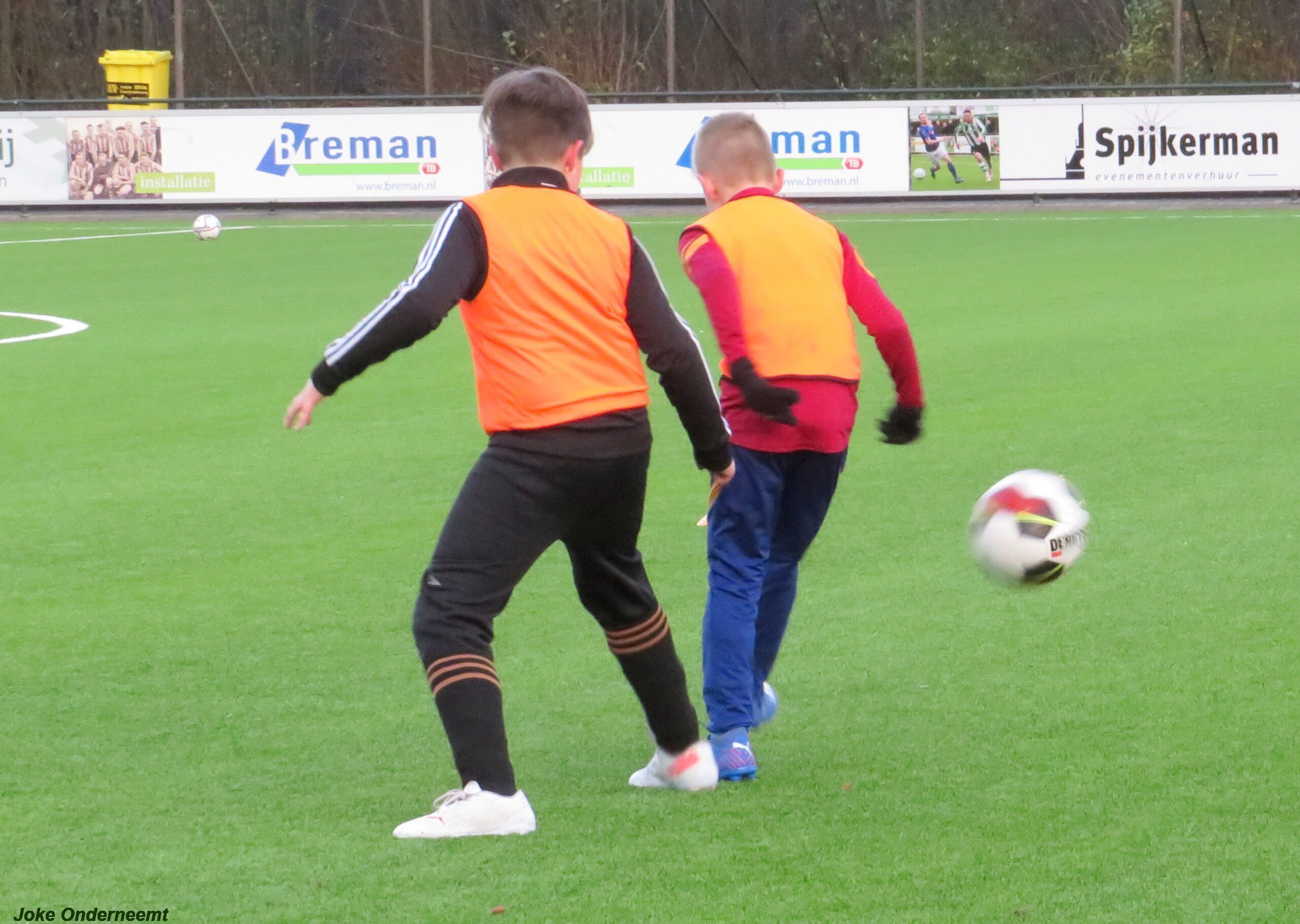 Nadat er vijf teams waren gevormd met de namen Marsepijnteam – Pepernotenteam- Speculaasteam-Chocoladeteam en het Stoombootteam werd er lekker gespeeld en toen kwamen er onverwachts in de rust twee pieten het veld op en kregen de spelertjes allemaal een zakje met pepernoten. Ook hielpen de pieten na wat uitleg te hebben gekregen, maar even met vlaggen want ze vonden voetballen zelf ook wel erg leuk.