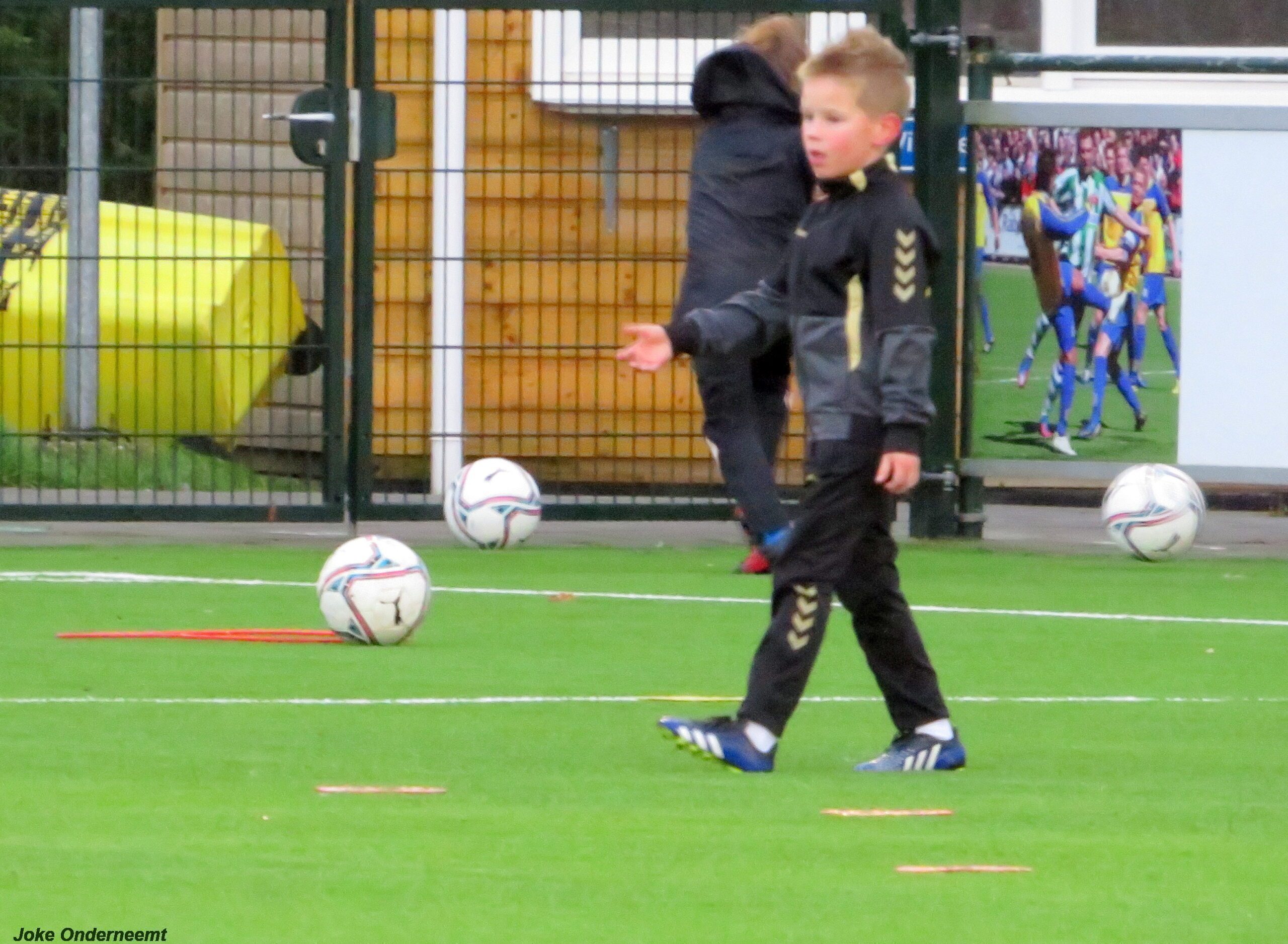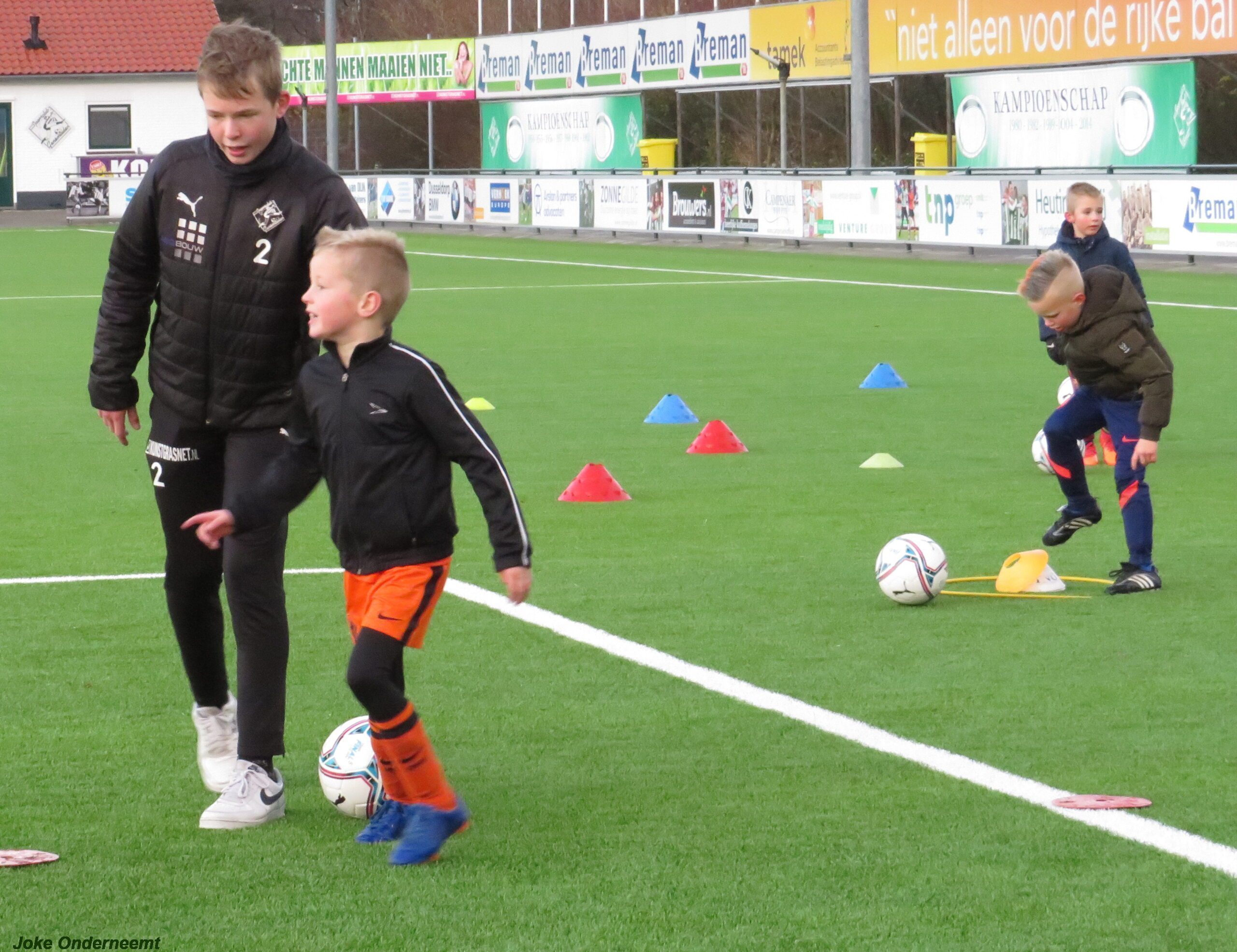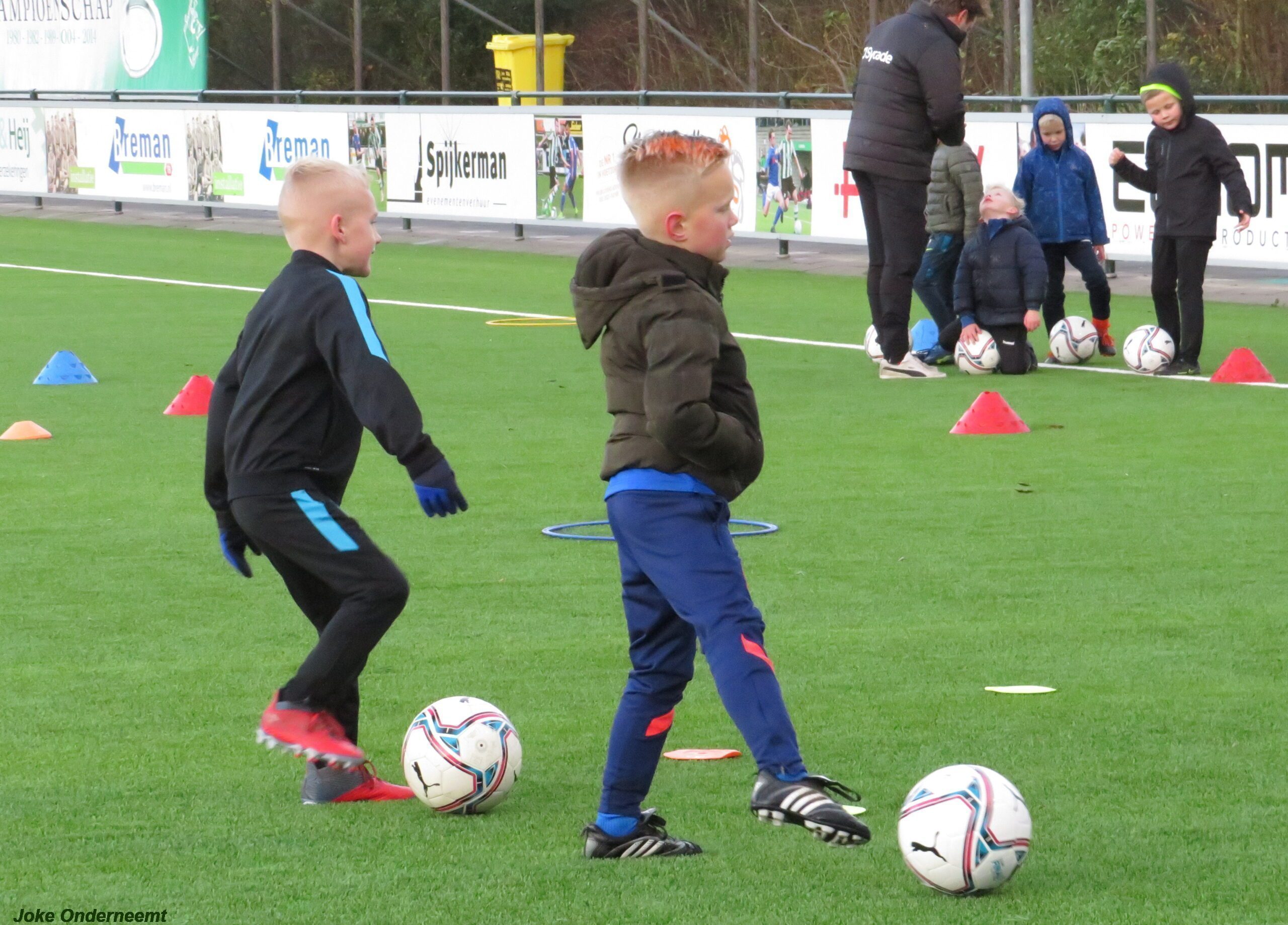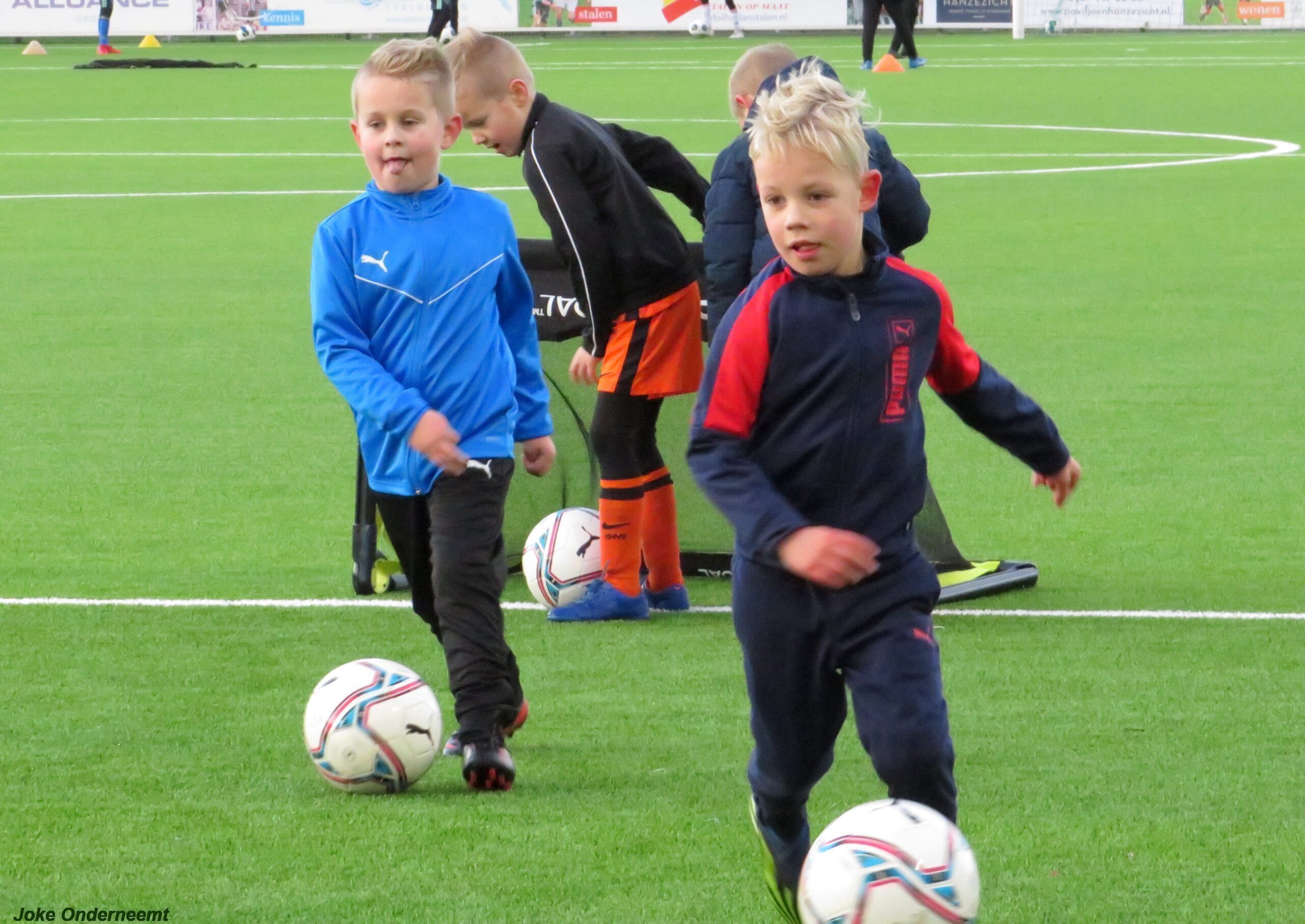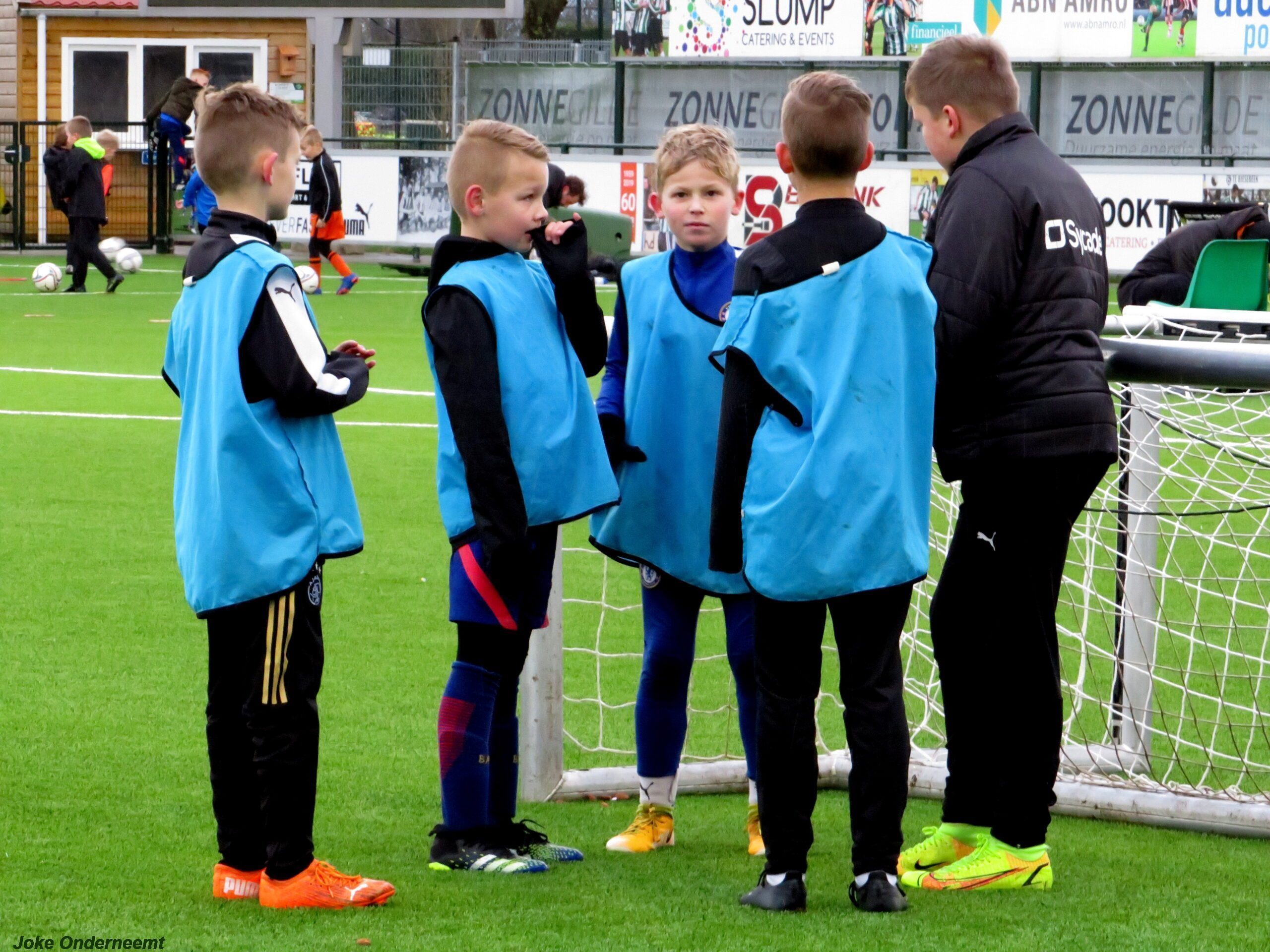 Nadat er vijf teams waren gevormd met de namen Marsepijnteam – Pepernotenteam- Speculaasteam-Chocoladeteam en het Stoombootteam werd er lekker gespeeld en toen kwamen er onverwachts in de rust twee pieten het veld op en kregen de spelertjes allemaal een zakje met pepernoten. Ook hielpen de pieten na wat uitleg te hebben gekregen, maar even met vlaggen want ze vonden voetballen zelf ook wel erg leuk.
