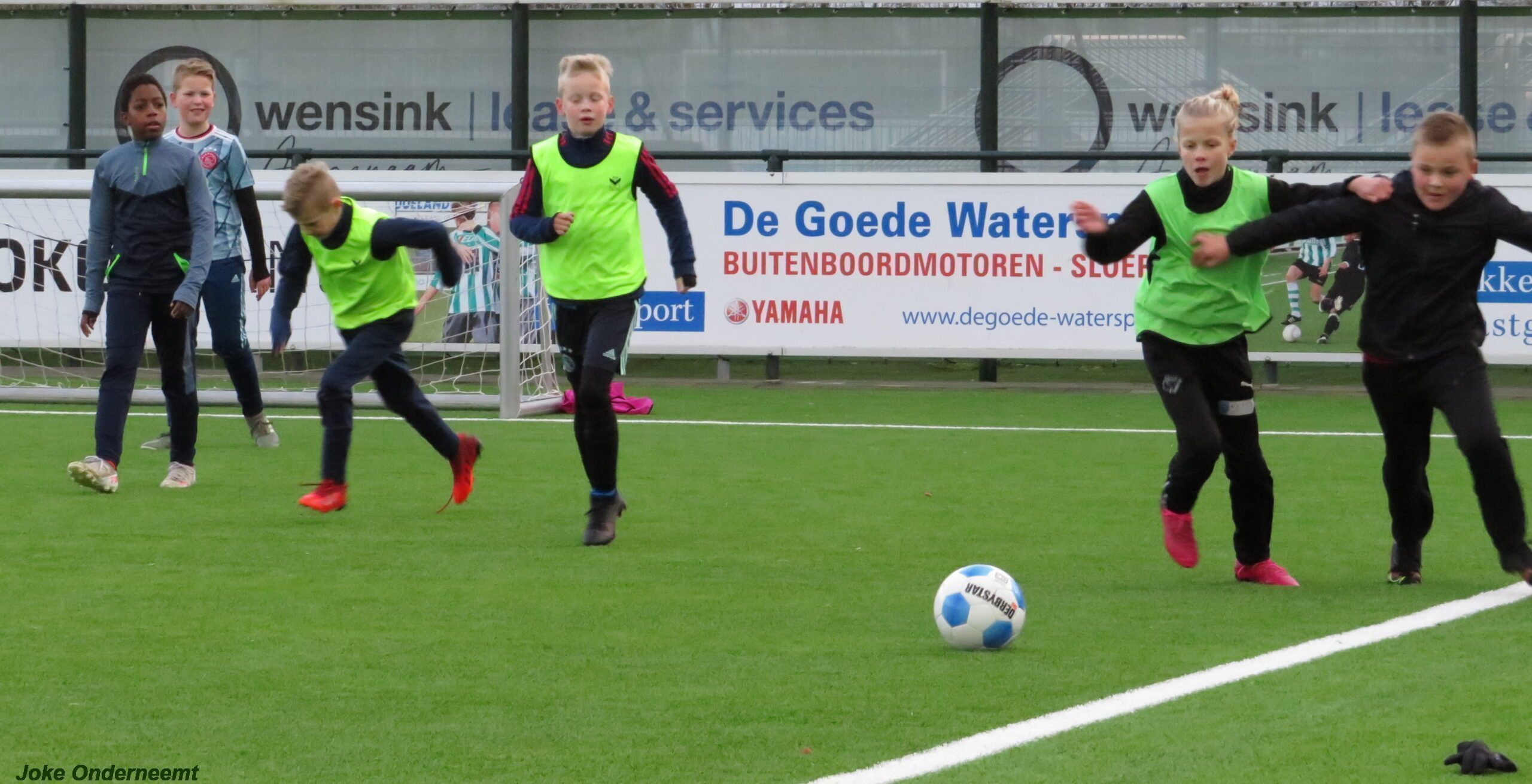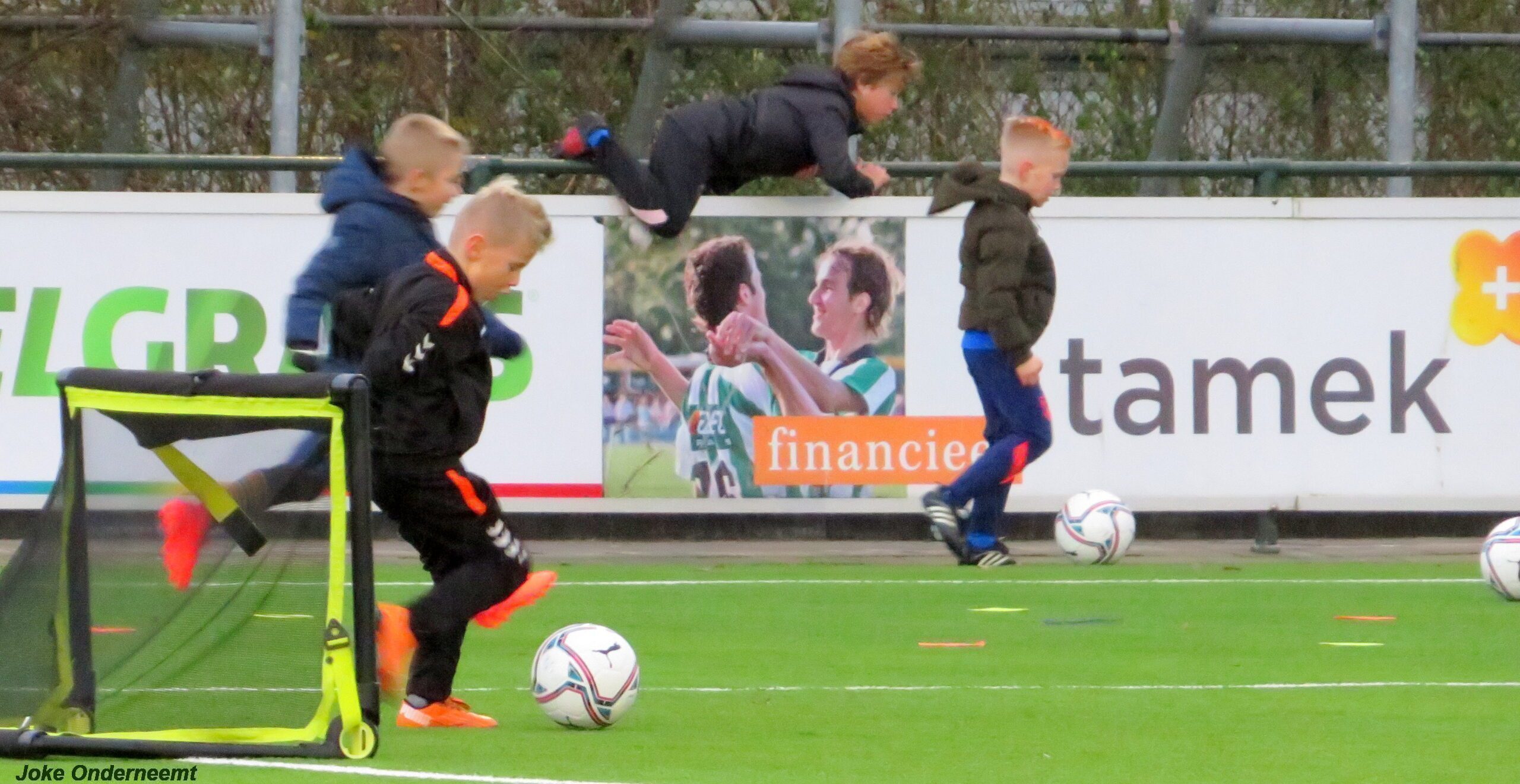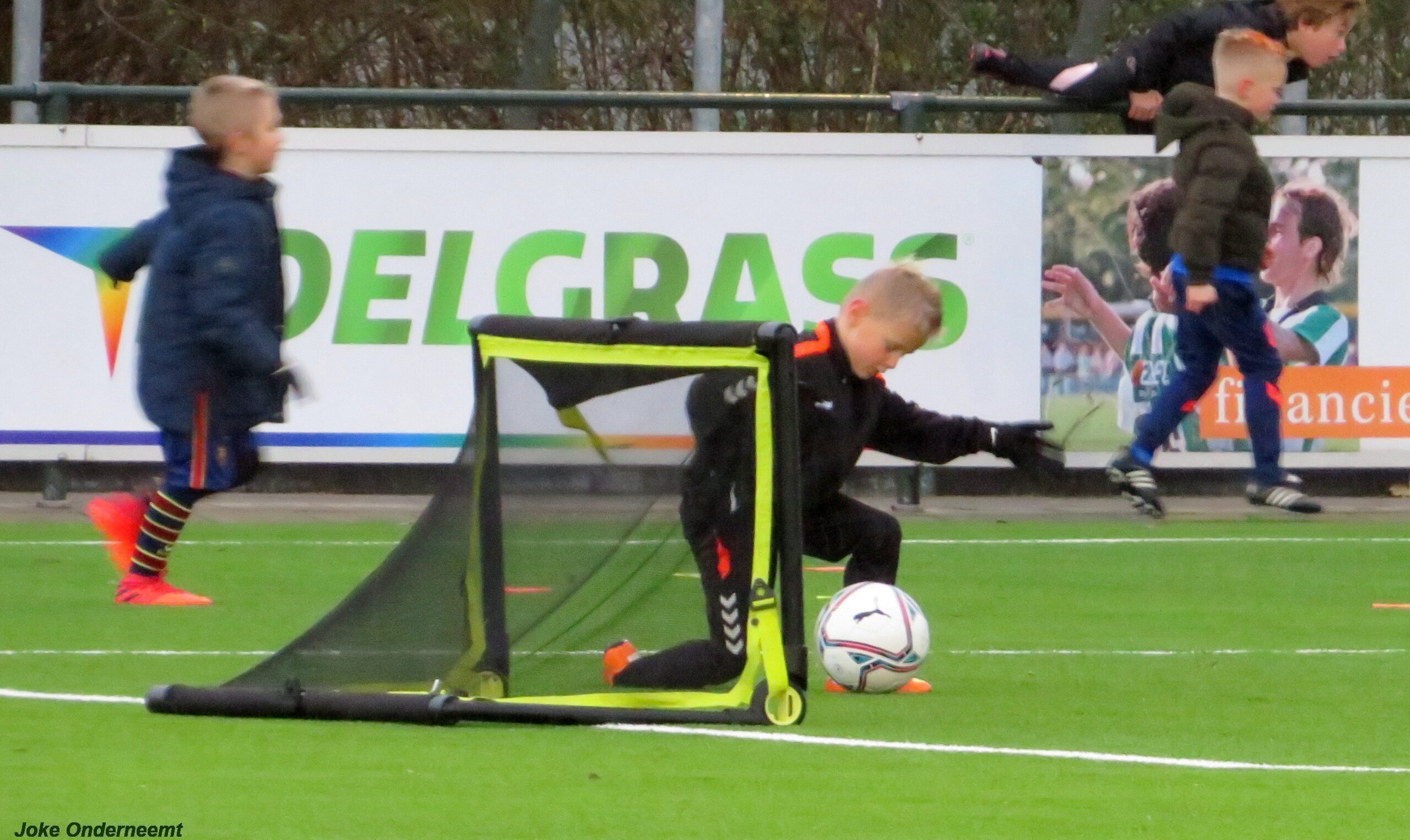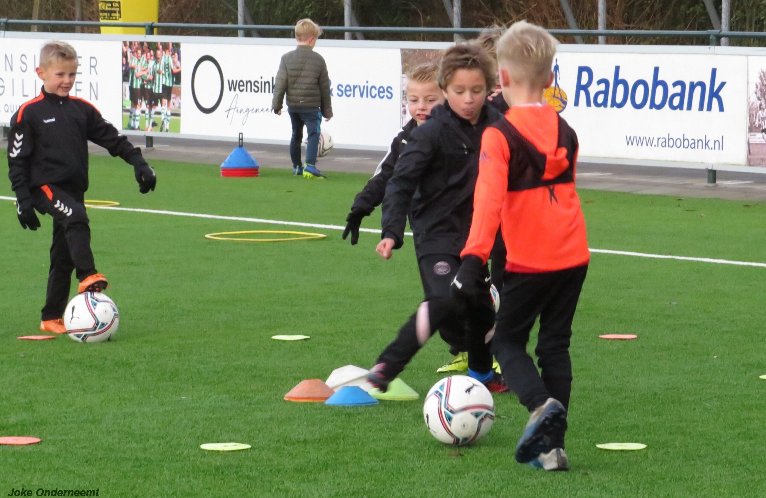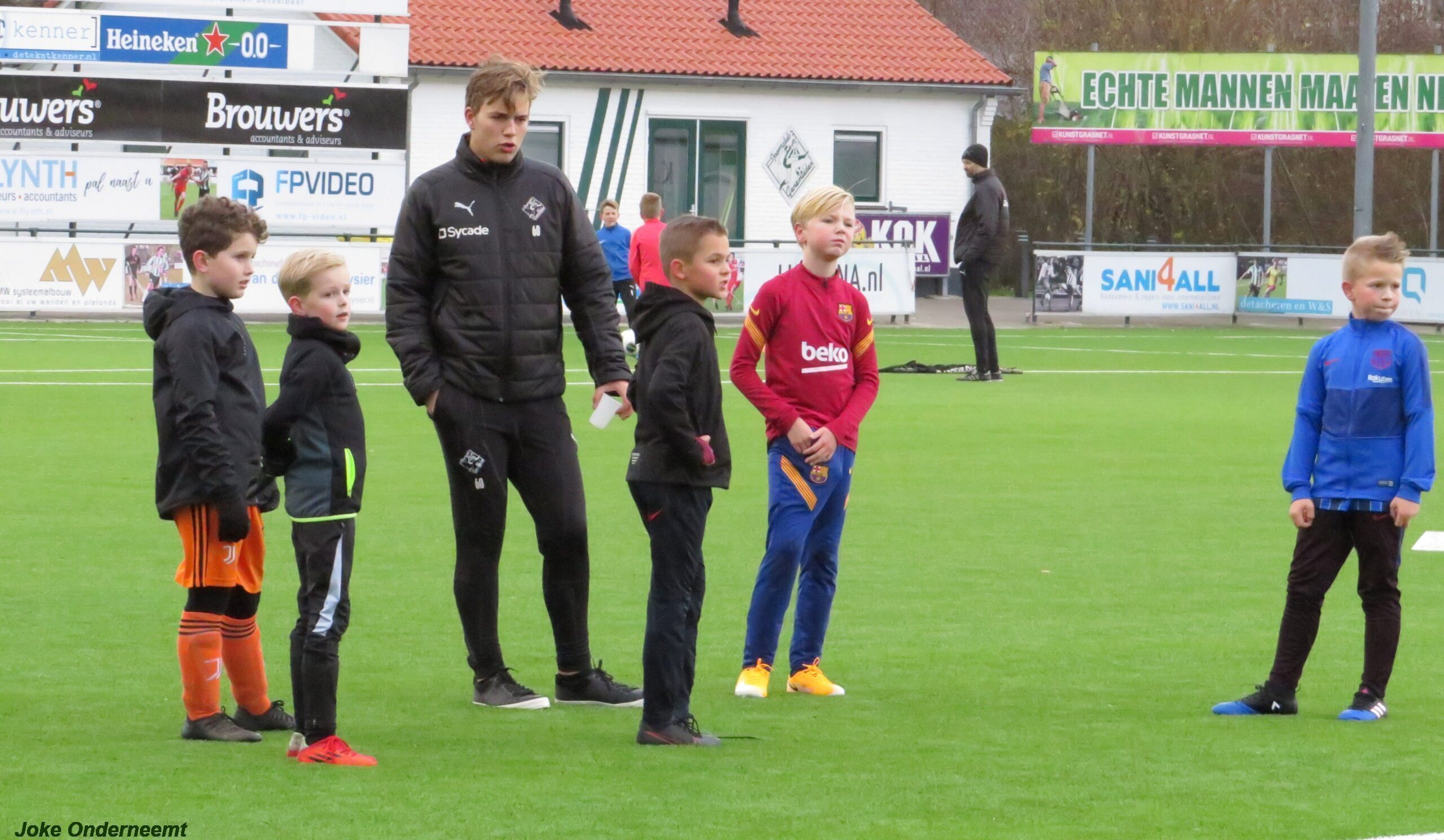 Nadat er vijf teams waren gevormd met de namen Marsepijnteam – Pepernotenteam- Speculaasteam-Chocoladeteam en het Stoombootteam werd er lekker gespeeld en toen kwamen er onverwachts in de rust twee pieten het veld op en kregen de spelertjes allemaal een zakje met pepernoten. Ook hielpen de pieten na wat uitleg te hebben gekregen, maar even met vlaggen want ze vonden voetballen zelf ook wel erg leuk.
