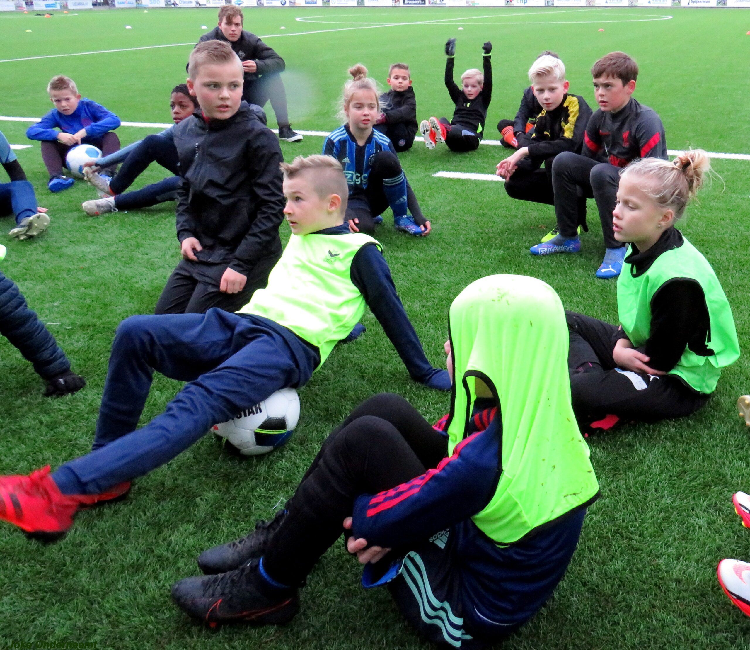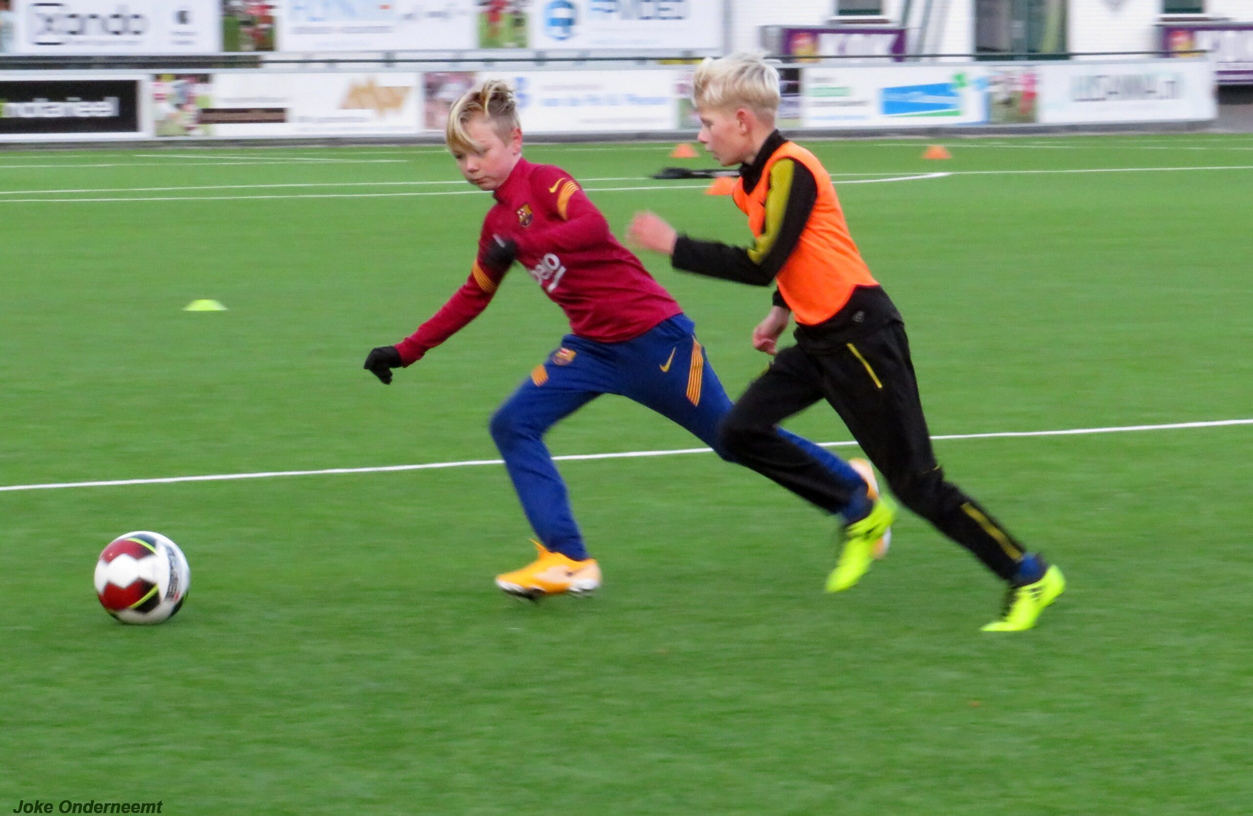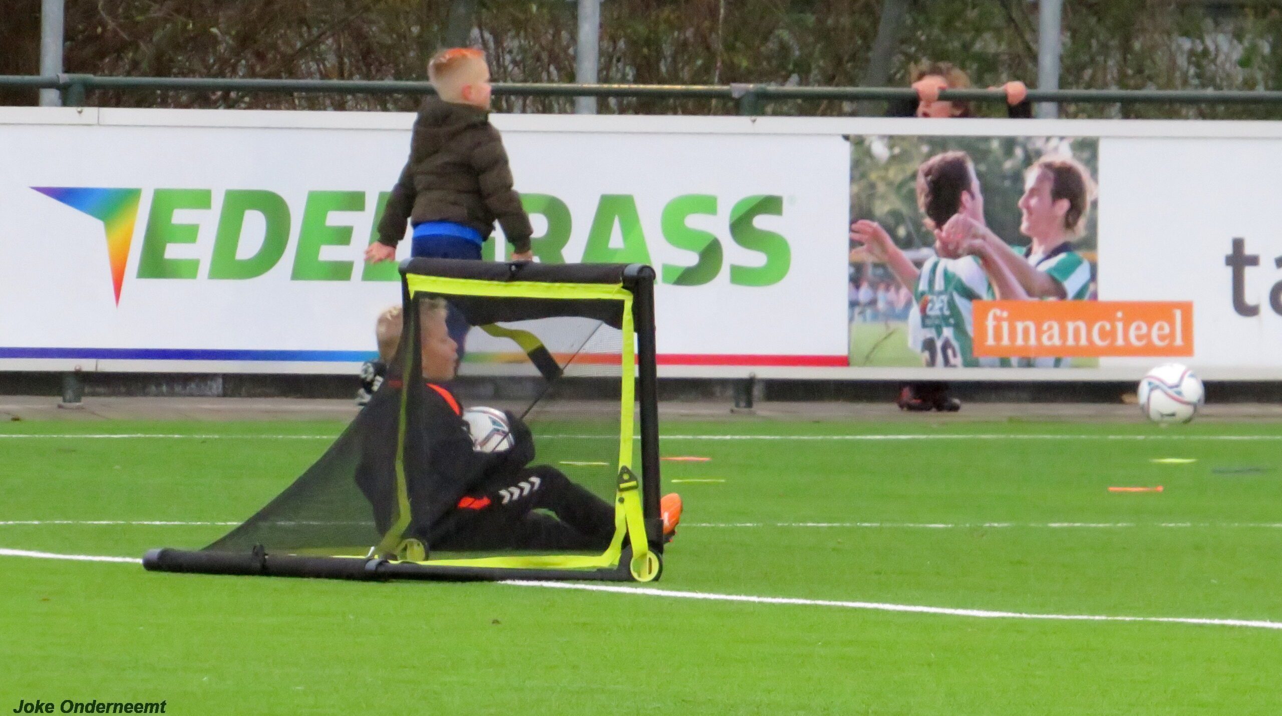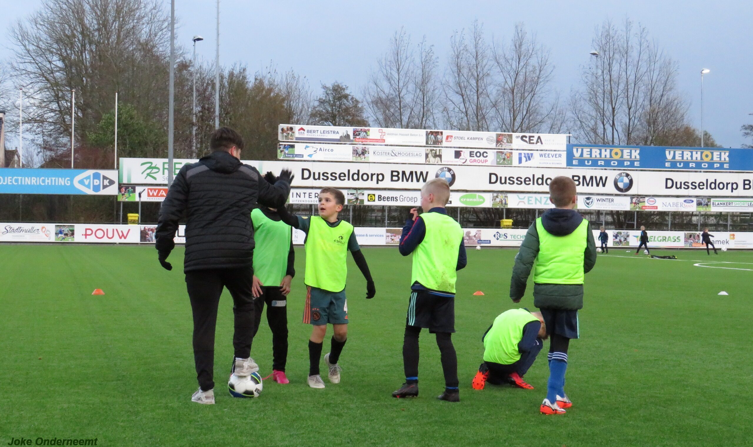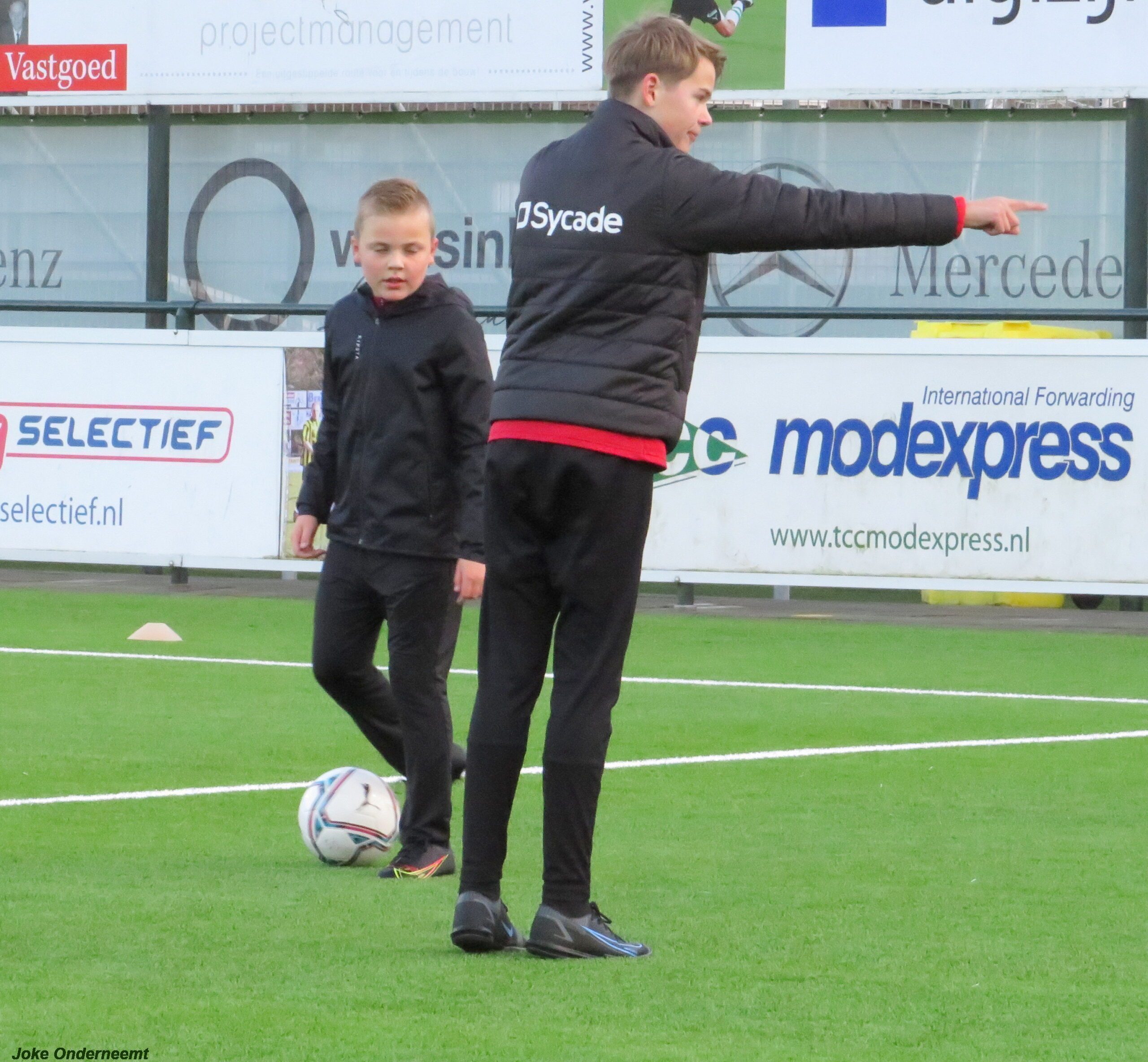 Nadat er vijf teams waren gevormd met de namen Marsepijnteam – Pepernotenteam- Speculaasteam-Chocoladeteam en het Stoombootteam werd er lekker gespeeld en toen kwamen er onverwachts in de rust twee pieten het veld op en kregen de spelertjes allemaal een zakje met pepernoten. Ook hielpen de pieten na wat uitleg te hebben gekregen, maar even met vlaggen want ze vonden voetballen zelf ook wel erg leuk.