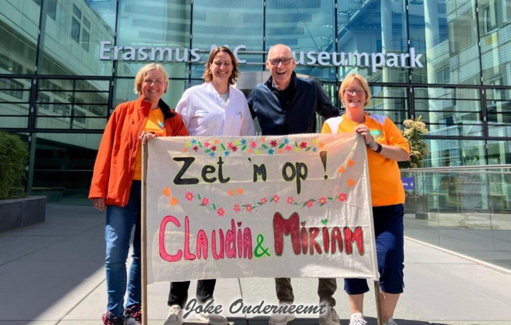 Op naar het Erasmus MC, en zaterdag vertrekken ze dus weer op weg terug naar Hasselt. Claudia lopend en Miriam fietsend met de bagage wagen achter de fiets.