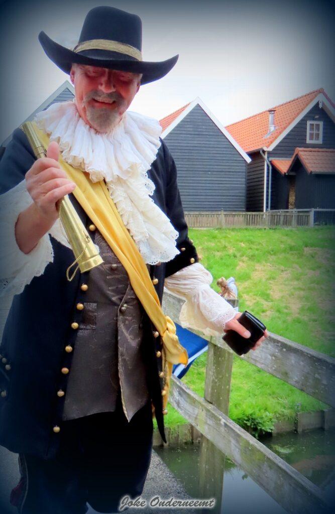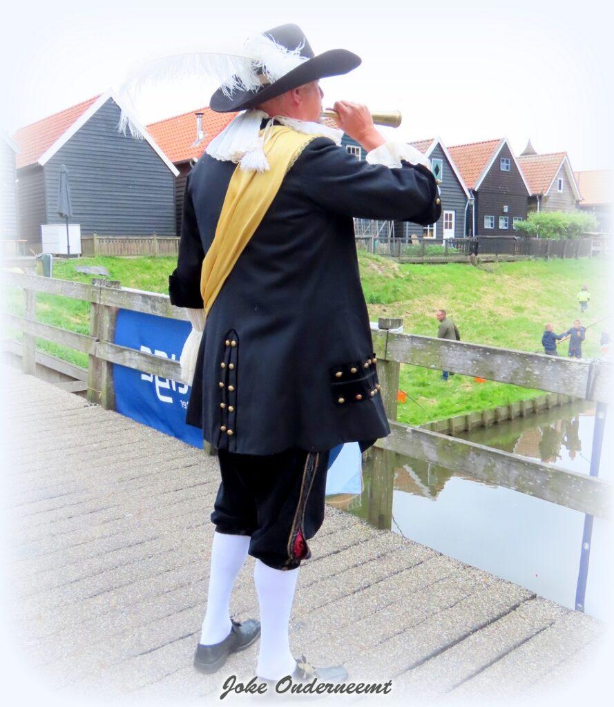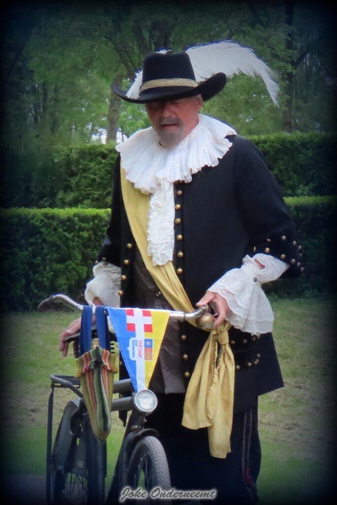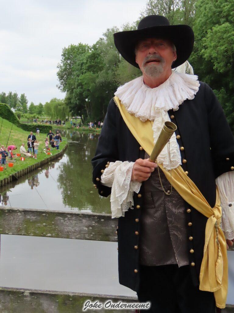 Jan van Nassau gaf vanavond om 18.30 uur het startschot voor de jubileumviswedstrijd en kwam deze keer niet met de koets of mooie oude auto, maar gewoon op zijn vele jaren oude fiets.