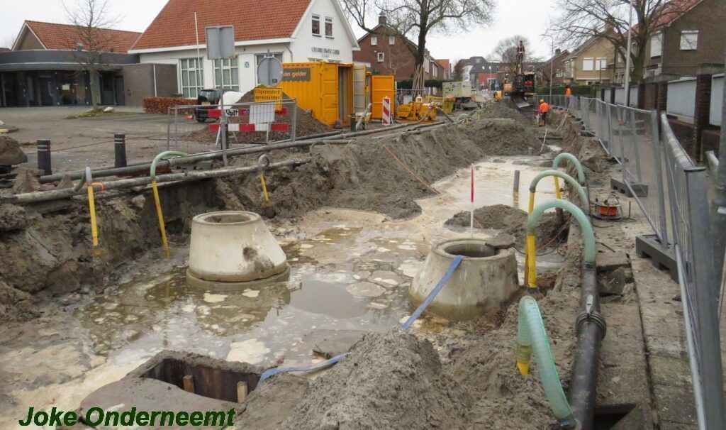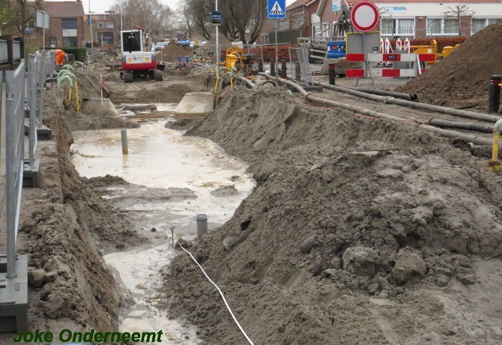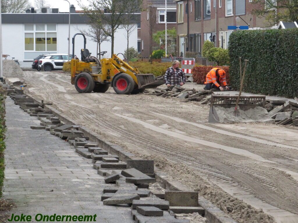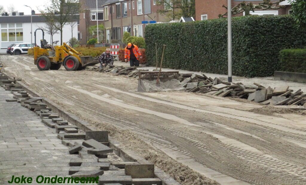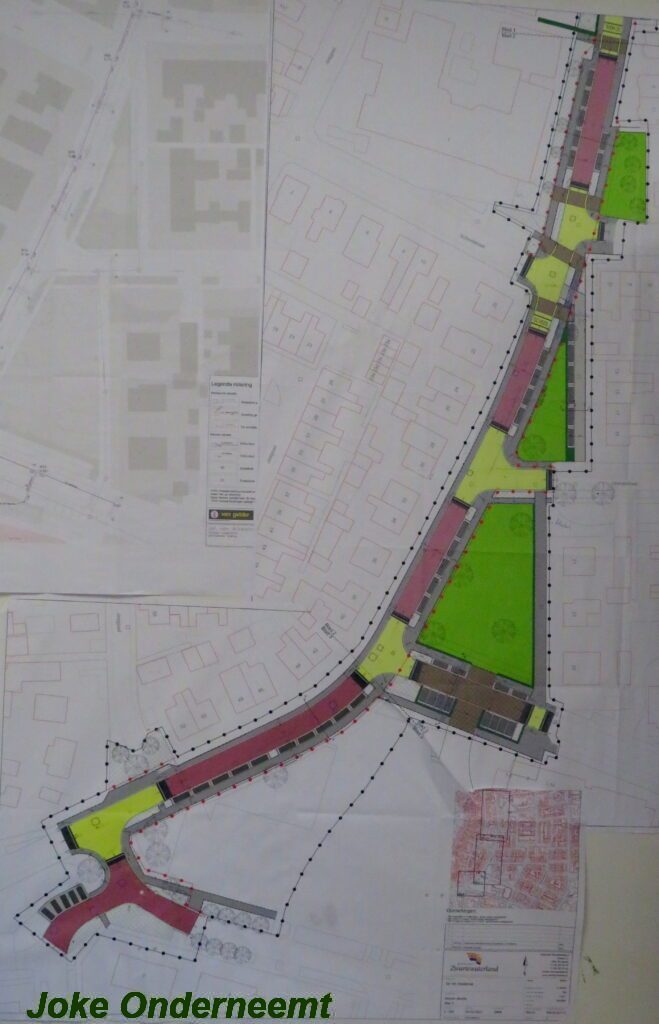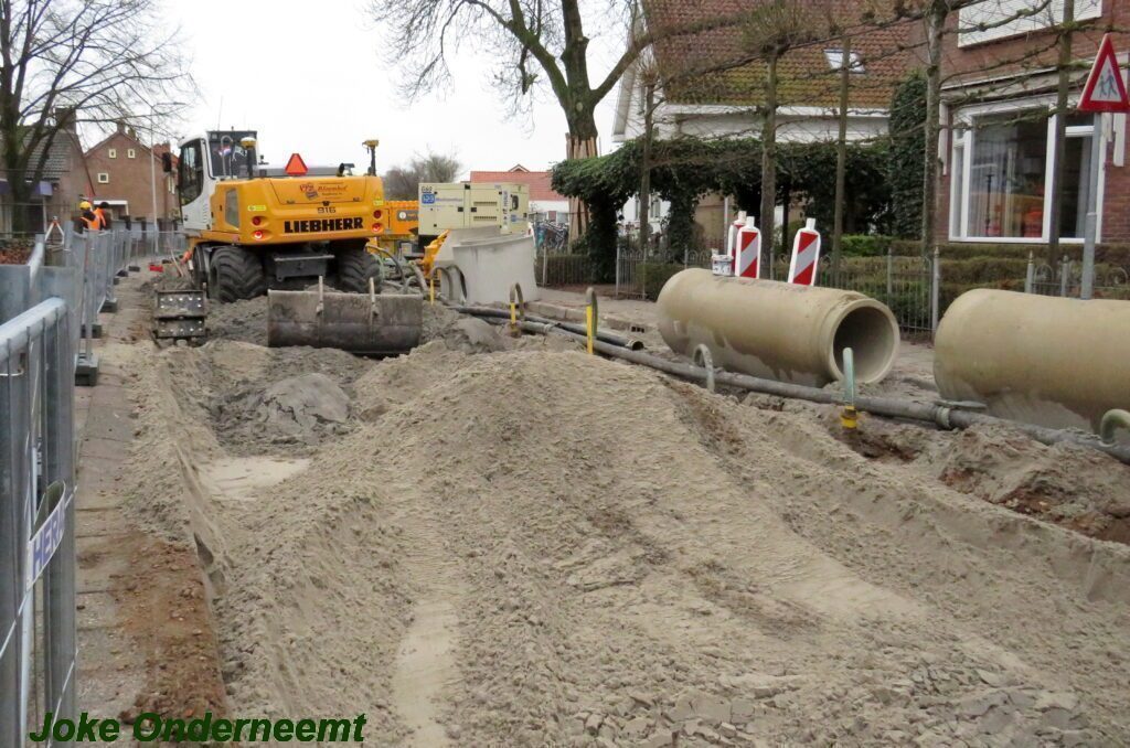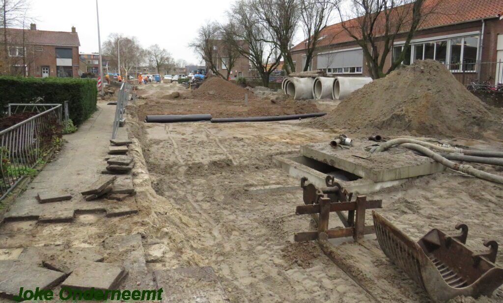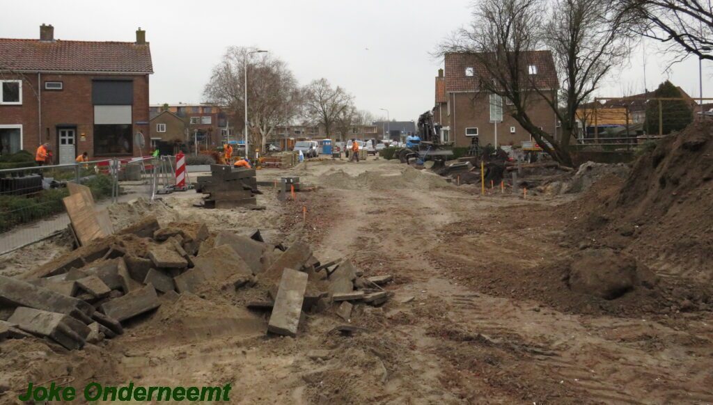 Ik mocht even in de schaftkeet een foto maken van de tekening, die daar aan de muur hing en met een beetje inzomen kun je het mooi zien wat het gaat worden. Maar voorlopig is het nog even een weekje of twee stevig bikkelen voordat de straat weer even toegangkelijk is voor het verkeer .