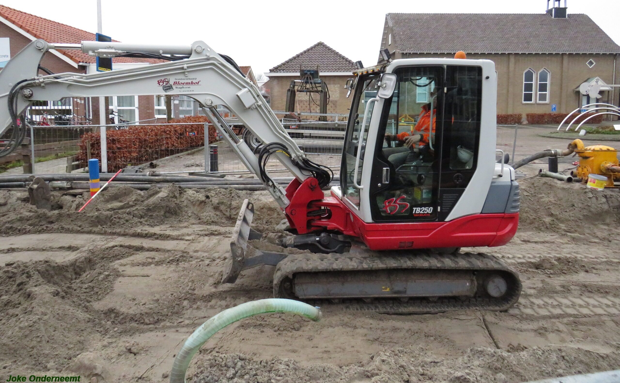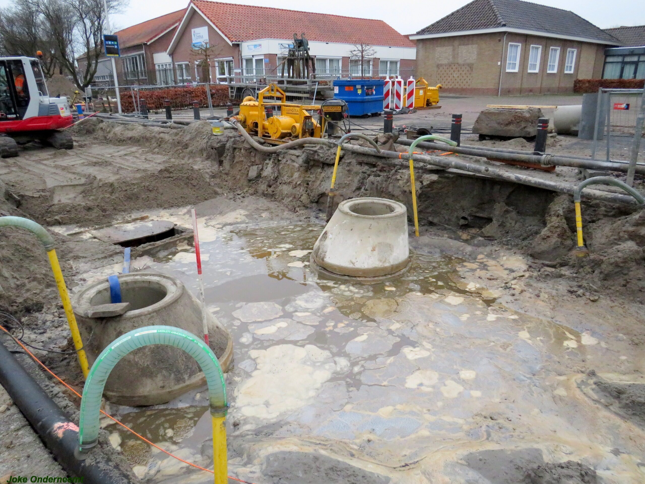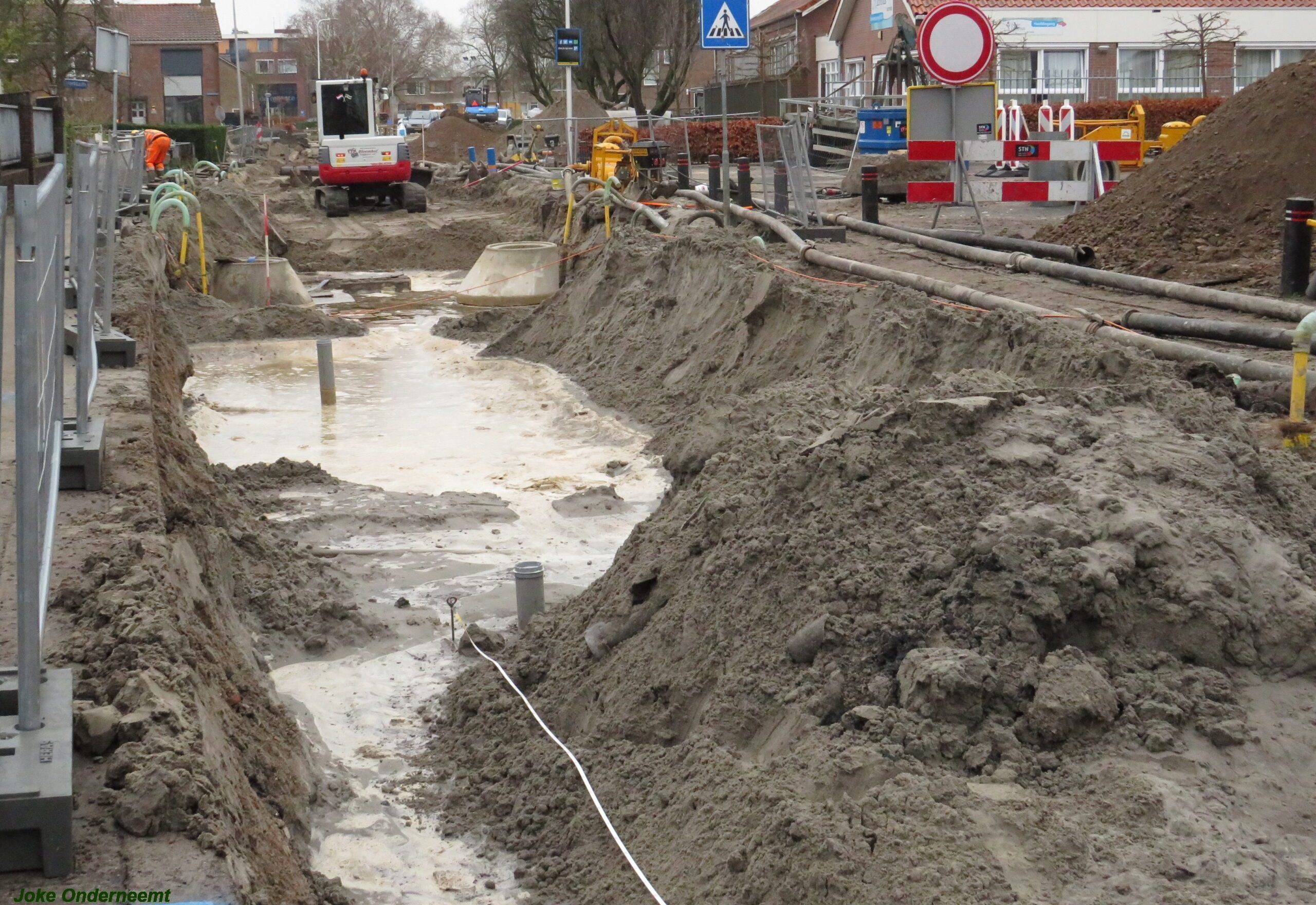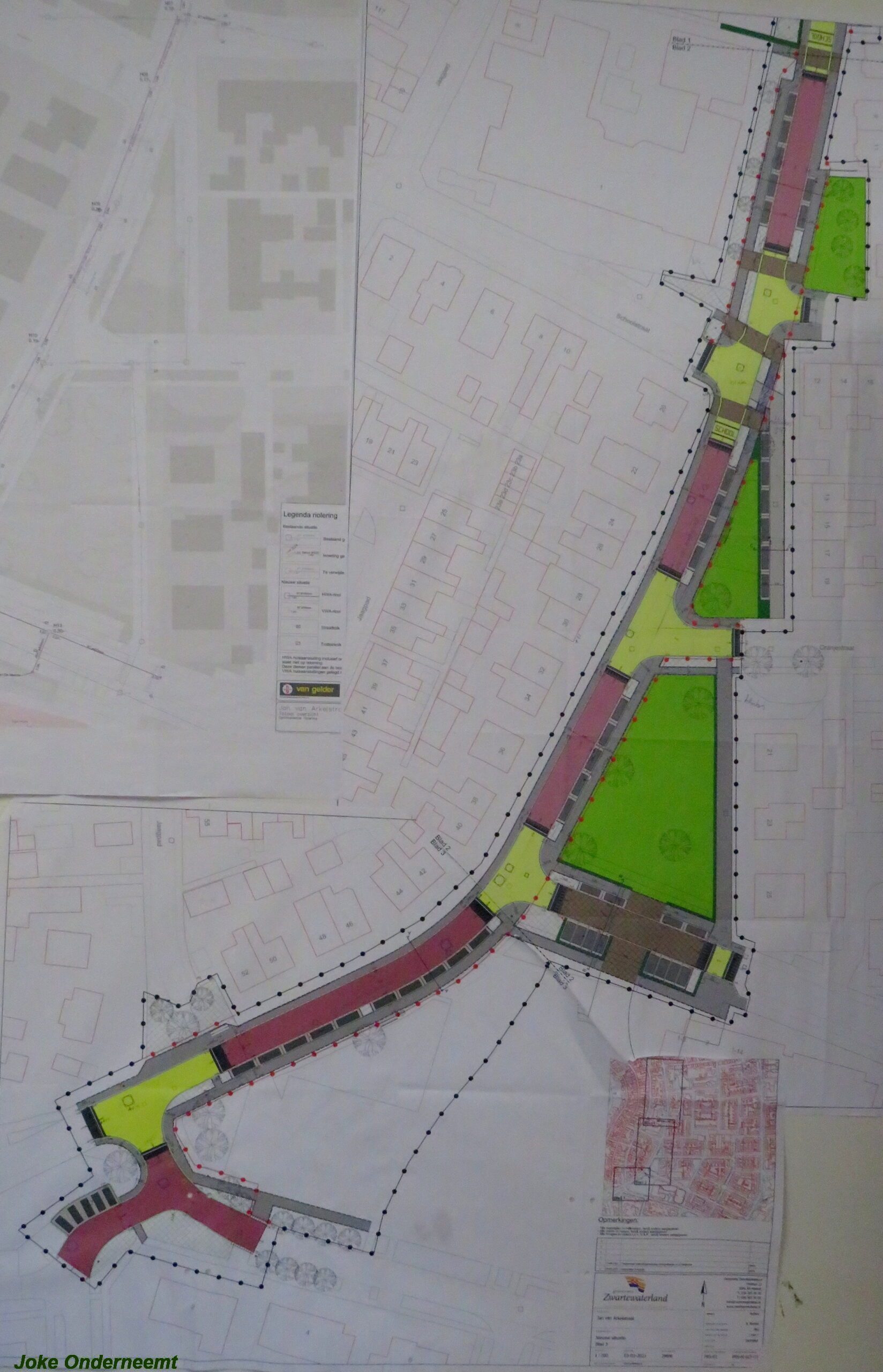 Ik mocht even in de schaftkeet een foto maken van de tekening, die daar aan de muur hing en met een beetje inzomen kun je het mooi zien wat het gaat worden. Maar voorlopig is het nog even een weekje of twee stevig bikkelen voordat de straat weer even toegangkelijk is voor het verkeer .