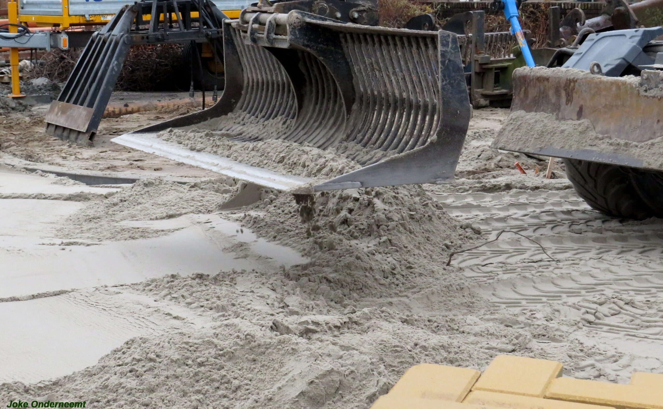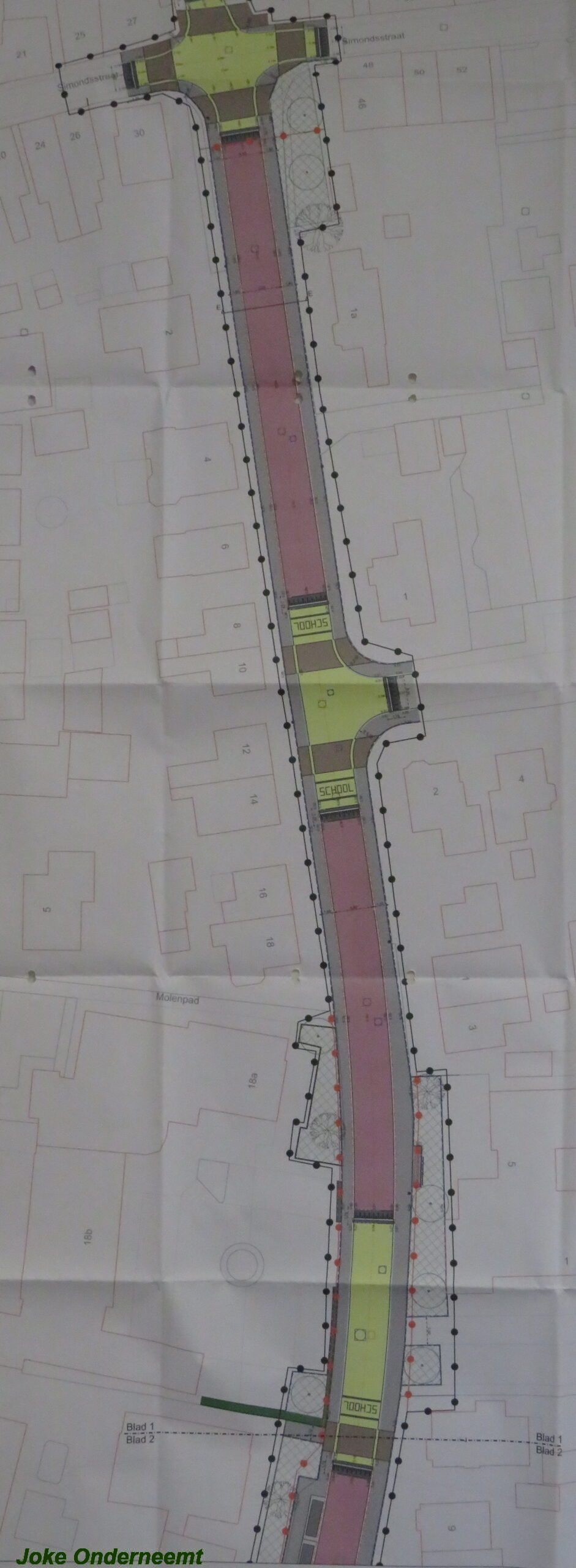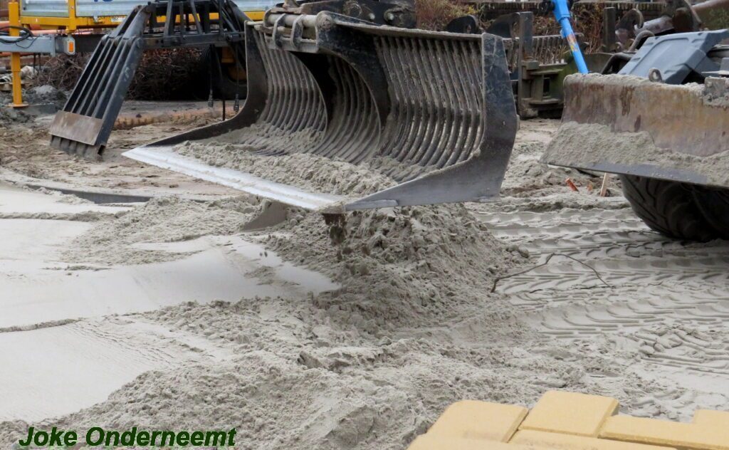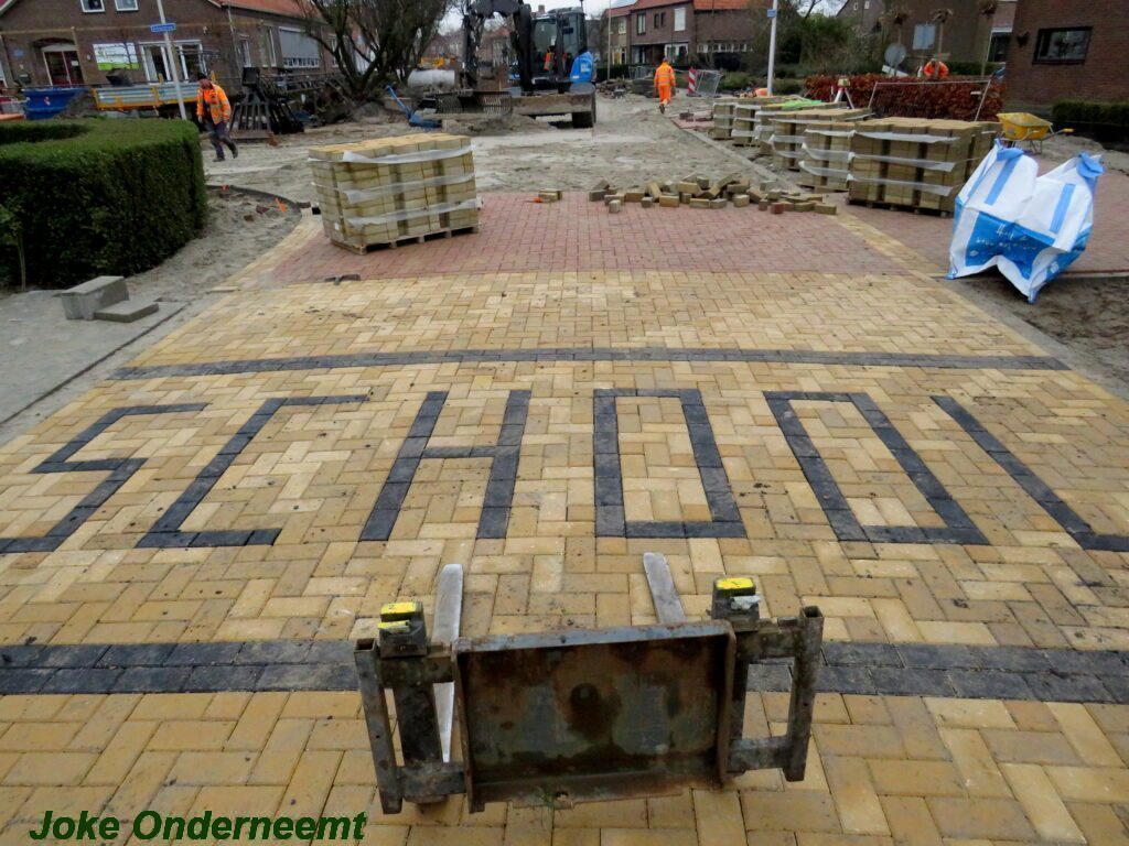 Ze gaan hard door , en zaterdag nog maar even wat uurtjes extra in die enorme zankbak doorgaan. Het eerste woord SCHOOL ligt er inmiddels in en ook de bruine vakken ( oversteekplaatsen ) worden zichtbaar.