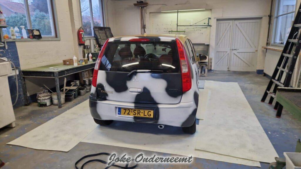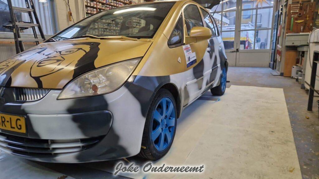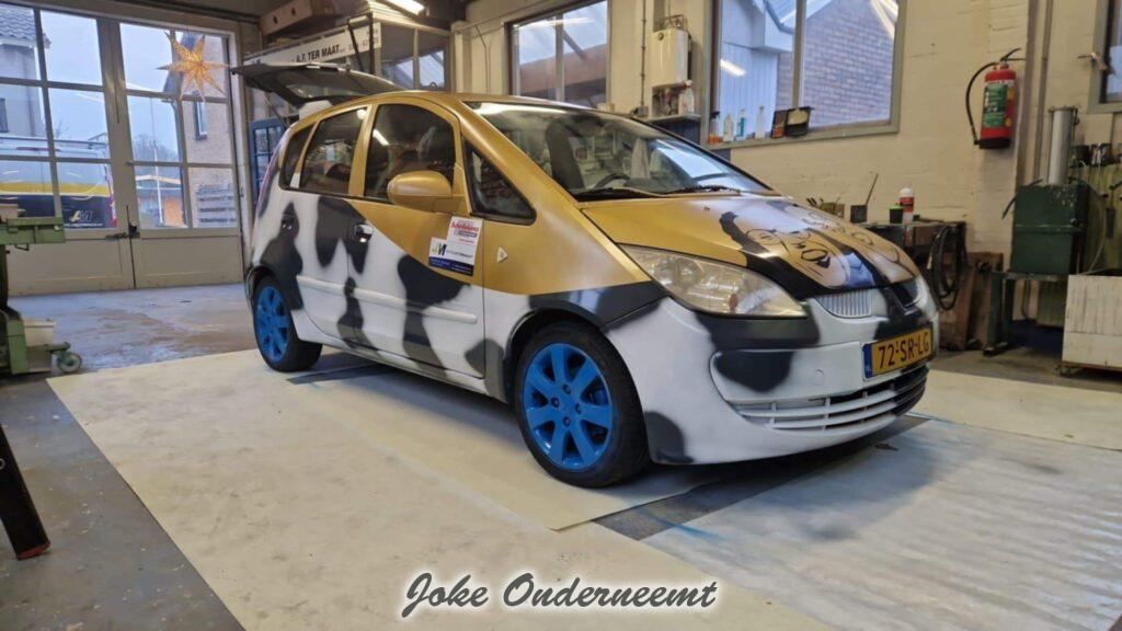 Ondertussen viel er nog genoeg te regelen oa de buitenkant van t autootje. Wilden wel weer iets met koe, maar niet hetzelfde. Zo ontstond het idee dat ie half goud en half koe moest worden en zo de Gouden Koe(ts) creƫerden. Dit alles is gedaan door een goede (motor)vriend van ons in Halle bij schildersbedrijf Ter Maat. We moesten zelf de auto schuren en hij zou hem spuiten. Wat een metamorfose heeft ie onder gaan. Echt super blij mee!