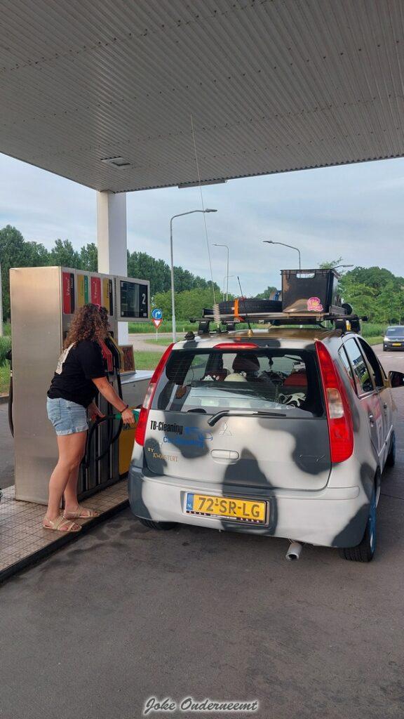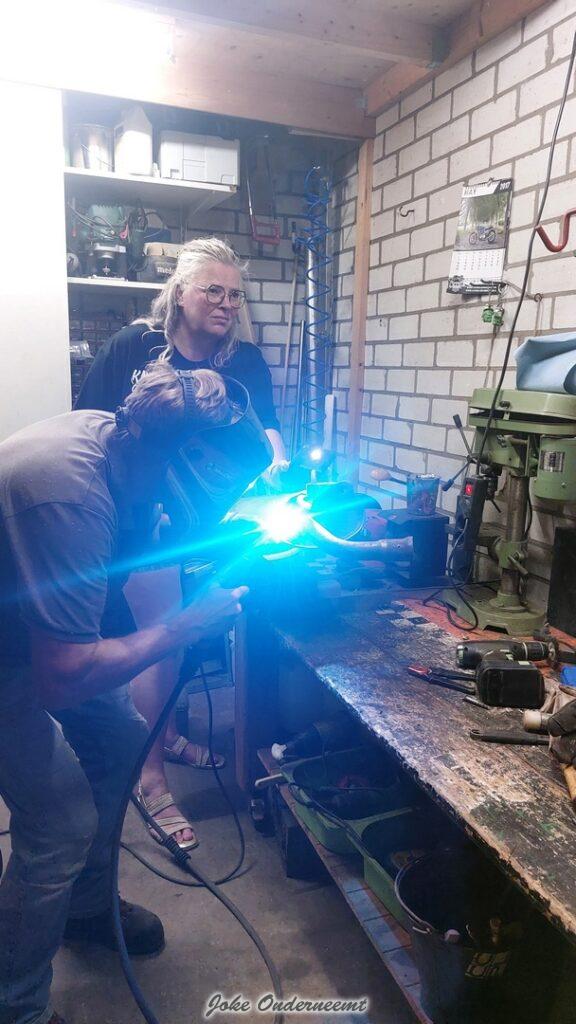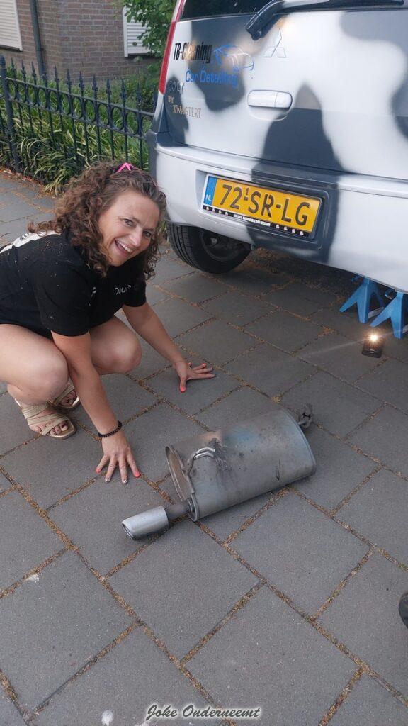 We reden Genemuiden uit en zeiden.. hmm de uitlaat! Toen we 6 min voor de camping zaten, hebben we eerst even getankt zodat we morgen direct met een volle tank weg kunnen. Maar bii de pomp hoorden we de uitlaat nog harder dan in Genemuiden. Dit is niet best. Zo op de camping de krik d’r maar eens onder om te zien wat de schade is. Dat we zo niet verder konden was ons namelijk al wel duidelijk. Dus hup naar de camping. Maar voor we daar waren moesten we nog even een plaatje schieten bij een Molen. Stappen daar uit en kwam eigenlijk direct al volk op ons an en wijzende naar de auto, Schellekens die ken ik (een van onze sponsoren) Daarbij begon ons een lampje te branden. We zijn dichtbij hun, misschien kunnen ze ons helpen. Maar aan de telefoon lieten ze weten dat ze op een Guzzi treffen in Tienhoven zaten, kak. Maar, probeer Rudy eens, Was t antwoord. Rudy gebeld, lang verhaal kort, kom deze kant maar op! Daar hebben we de krik onder de auto gedaan en was t echt goed zichtbaar. Uitlaat helemaal door. 3 uur lang bezig geweest met slijpen, verwijderen, lassen en terug plaatsen. We zijn Rudy dan ook eeuwig dankbaar en hebben beloofd op een volgend motorreizen in de watten te leggen. Want dankzij hem stonden we even over 12 met de tent op de camping én de uitlaat weer onder de Gouden Koe(ts)