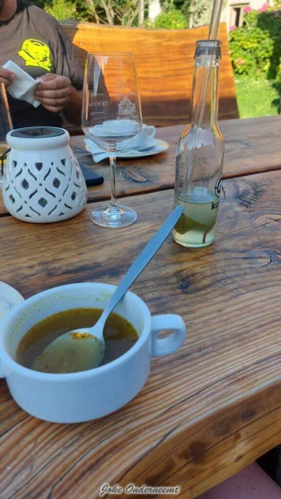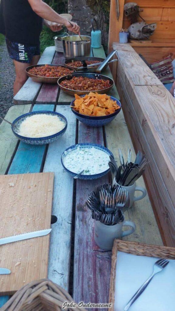 Net voor het eten snel de tent nog even opgezet om te drogen. Daar waren maar 10 sec voor nodig. Pff wat was t warm. Net als anders is het eten hier weer geweldig. Heerlijk Soepje en een Chillie Con Carne.