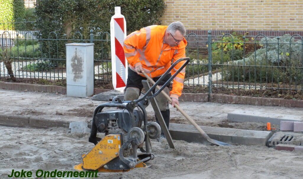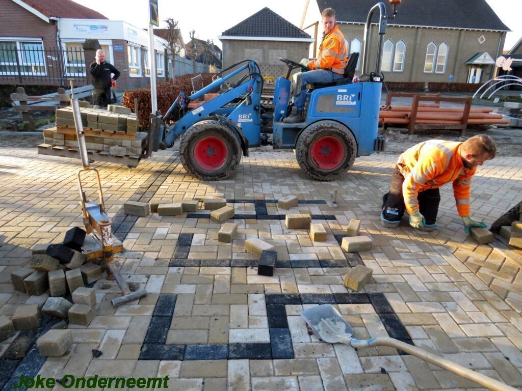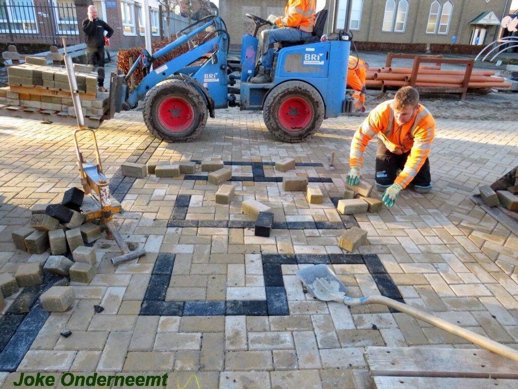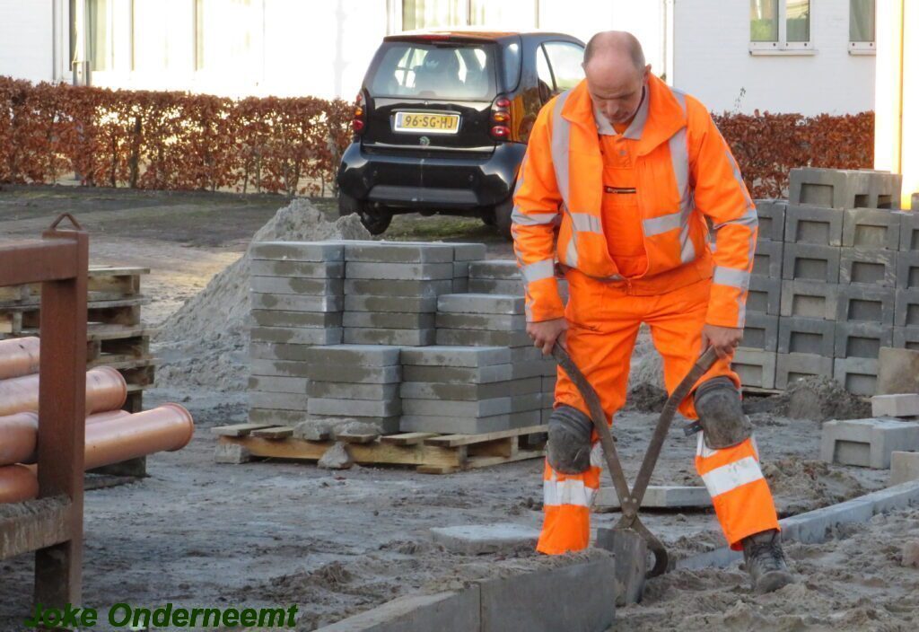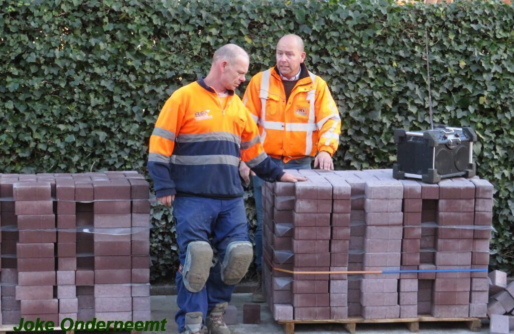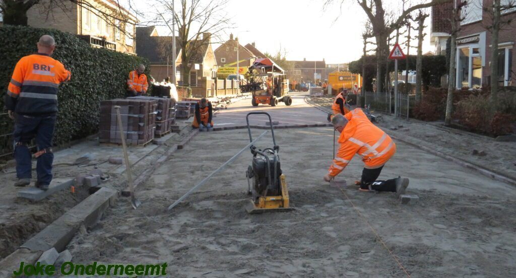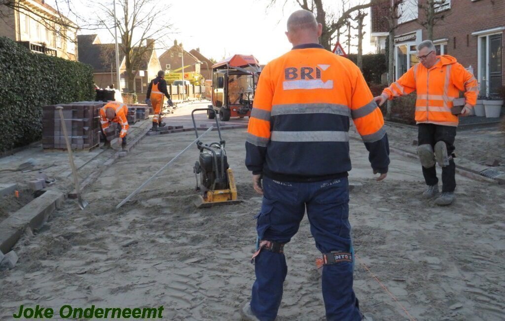 De vele vierkante meters vliegen er bijna in , in de Jan van Arkelstraat zo ook vandaag weer. Met een vierkante meter tegelijk leggen ze de stenen er in en dat schiet lekker op.