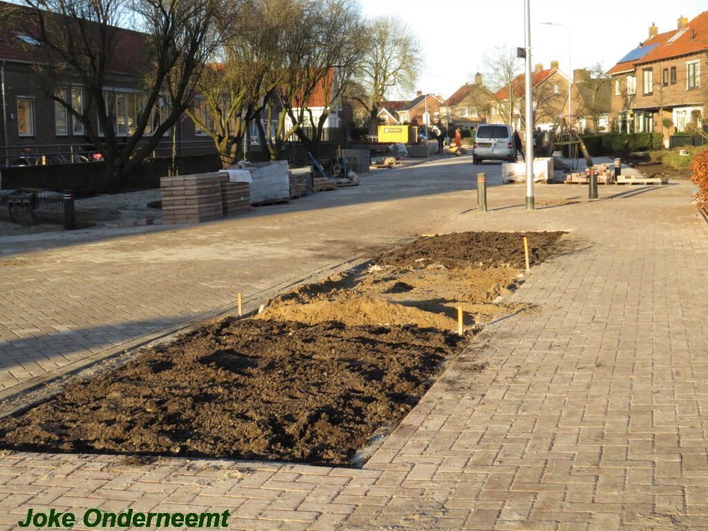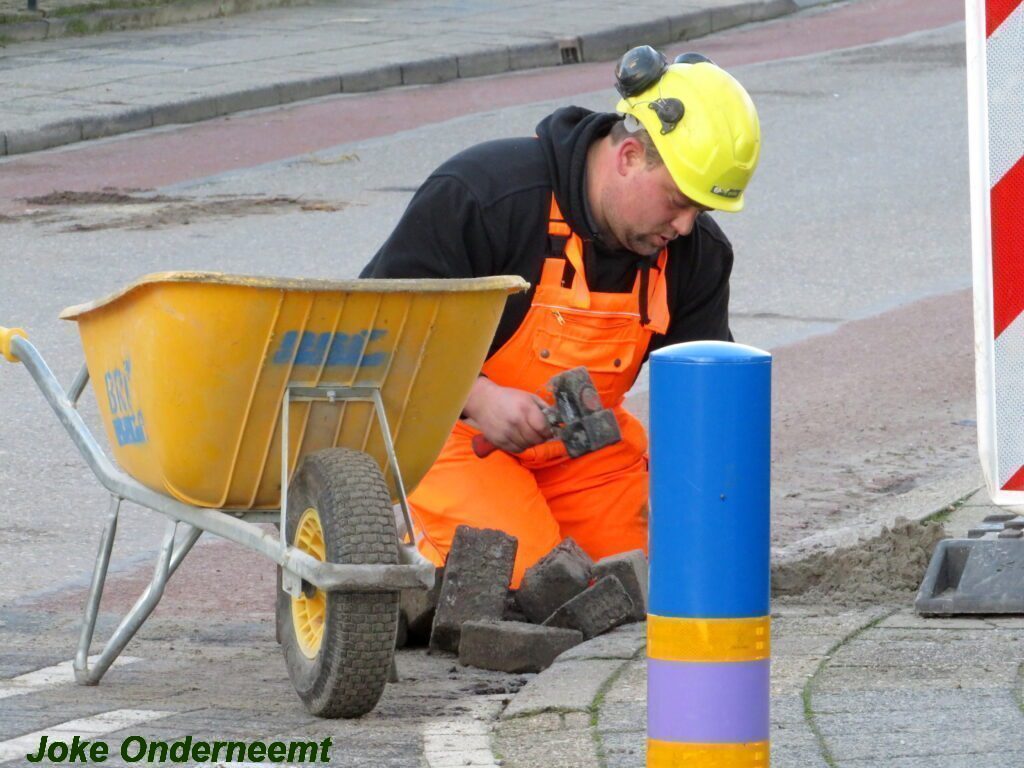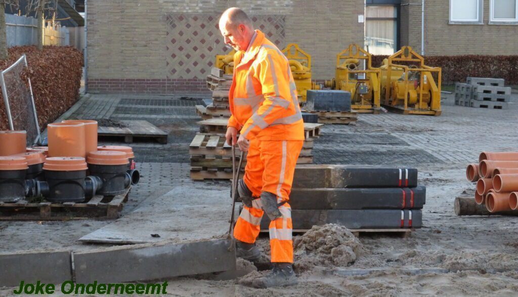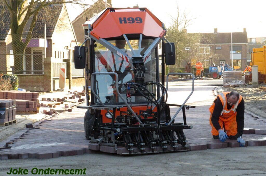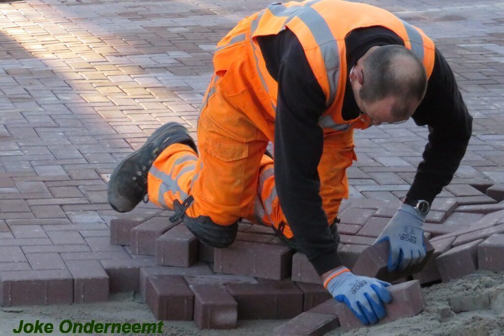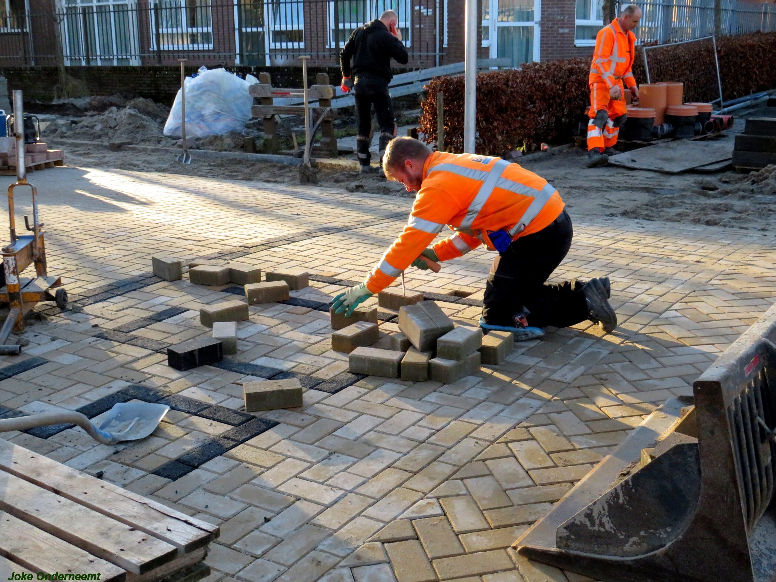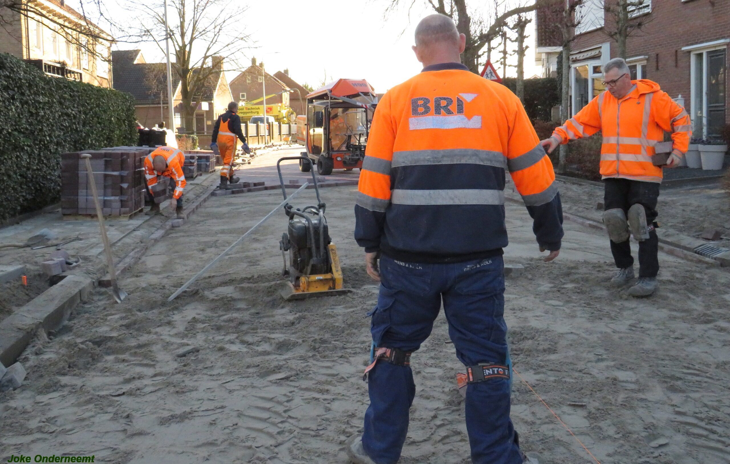 De vele vierkante meters vliegen er bijna in , in de Jan van Arkelstraat zo ook vandaag weer. Met een vierkante meter tegelijk leggen ze de stenen er in en dat schiet lekker op.