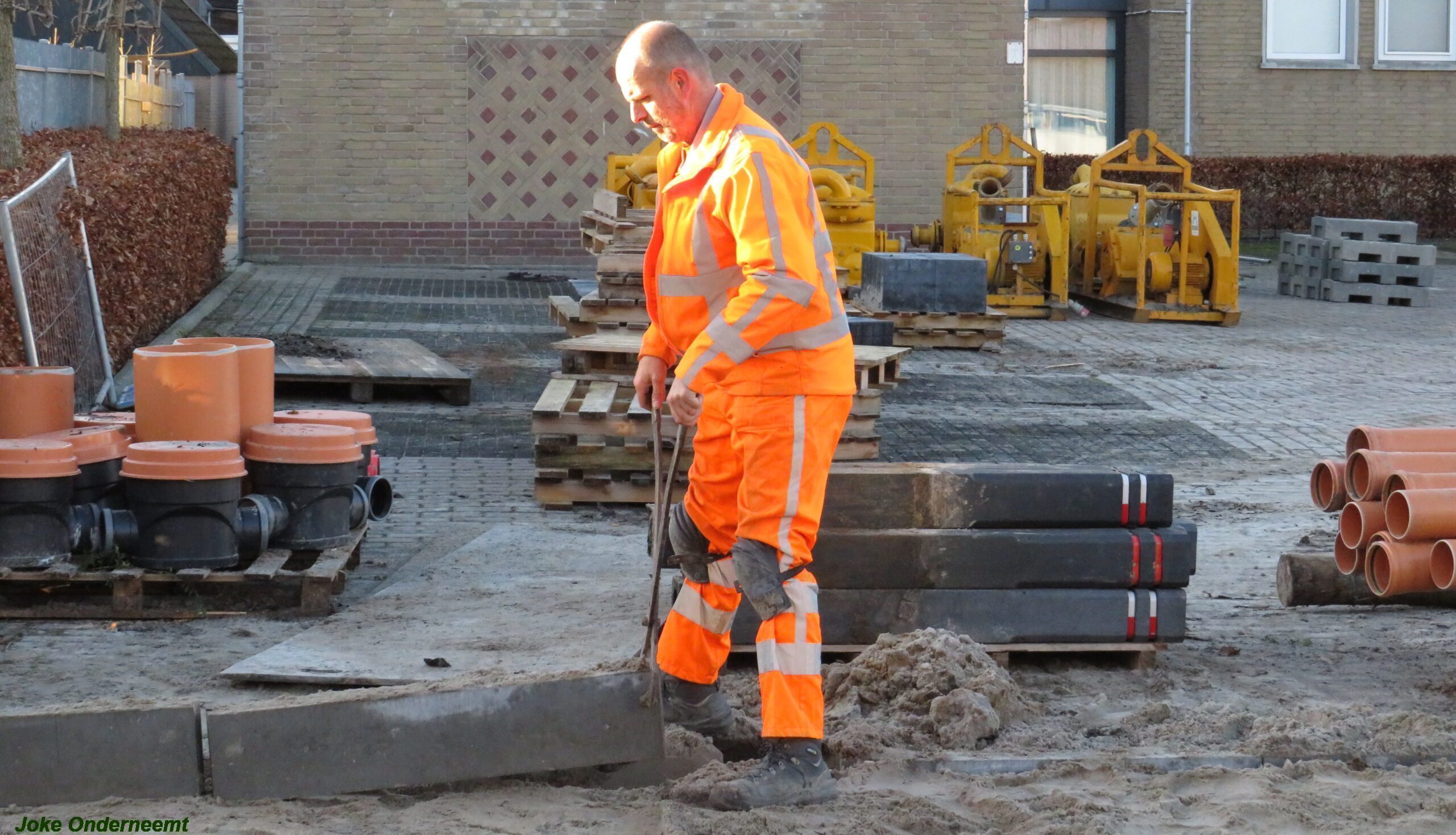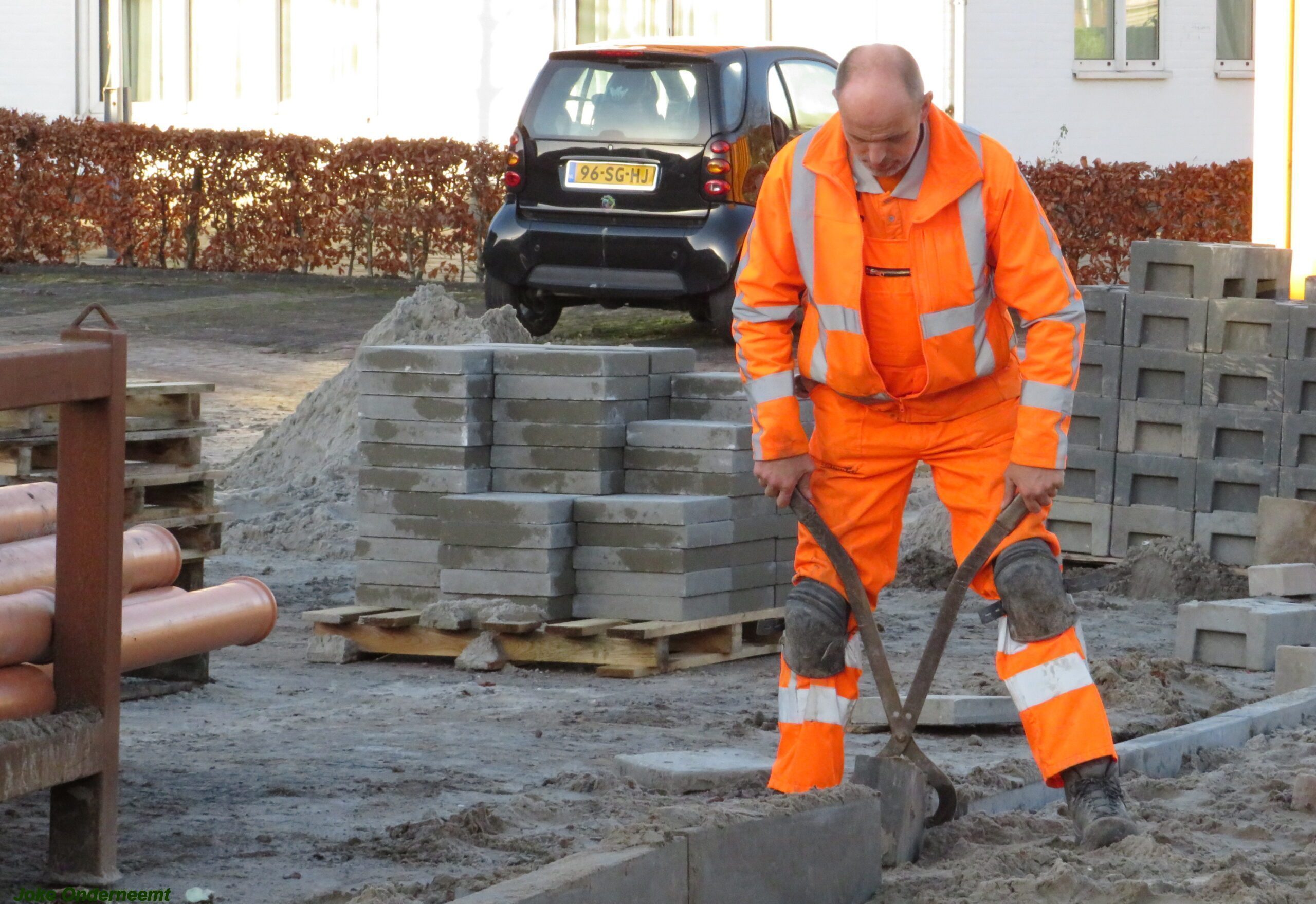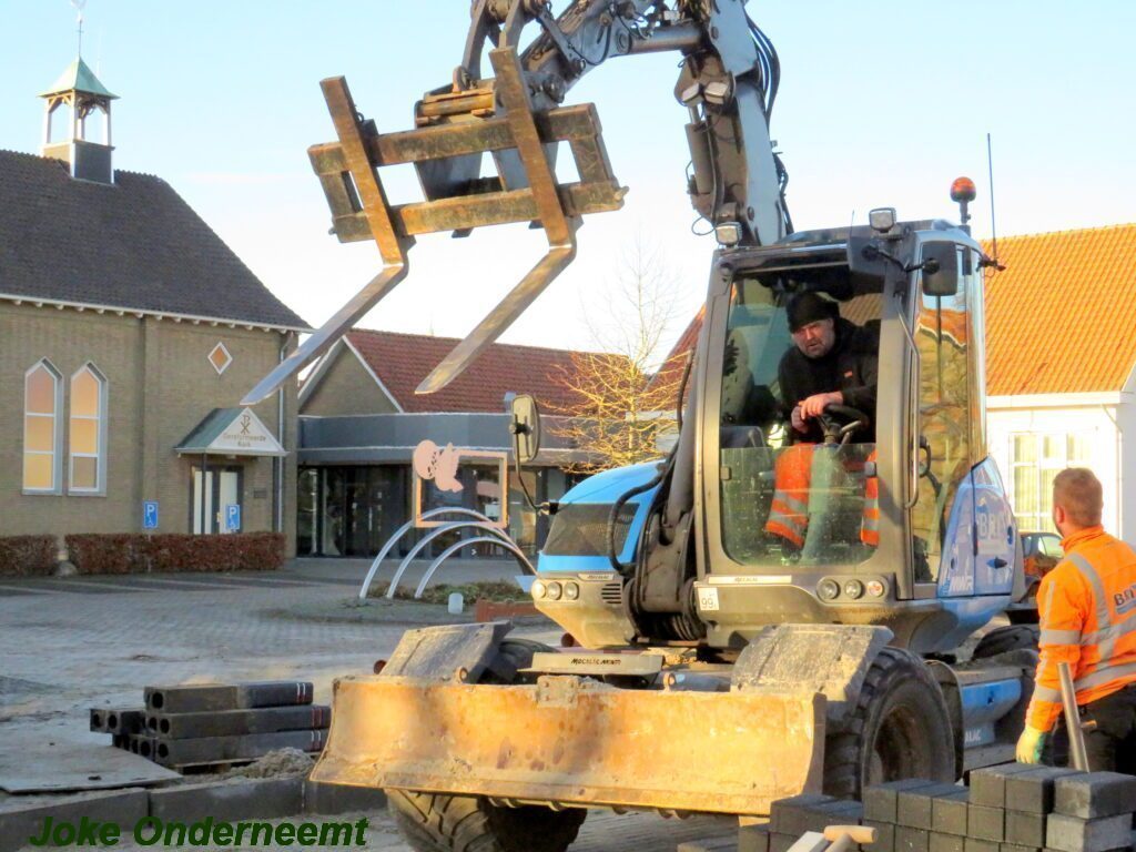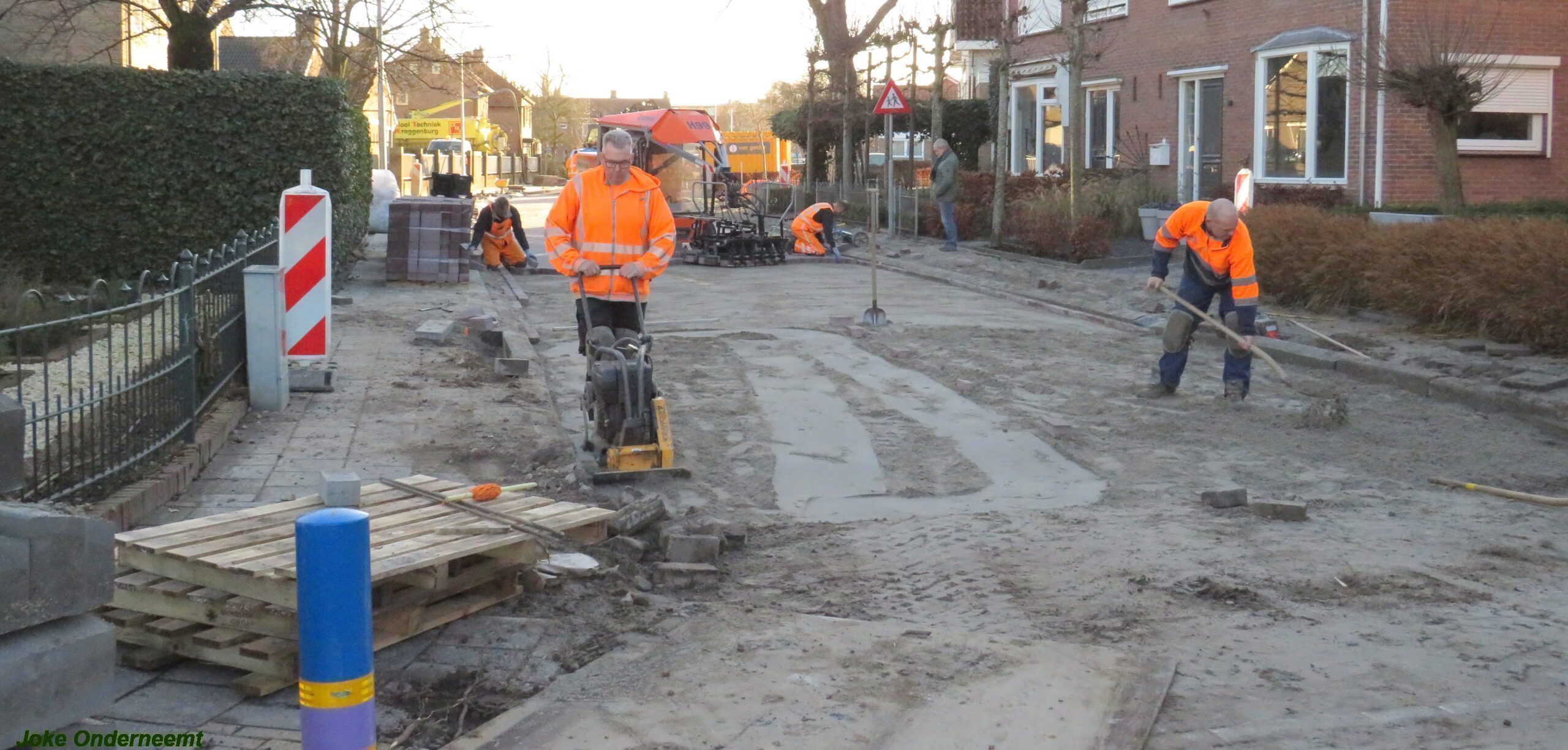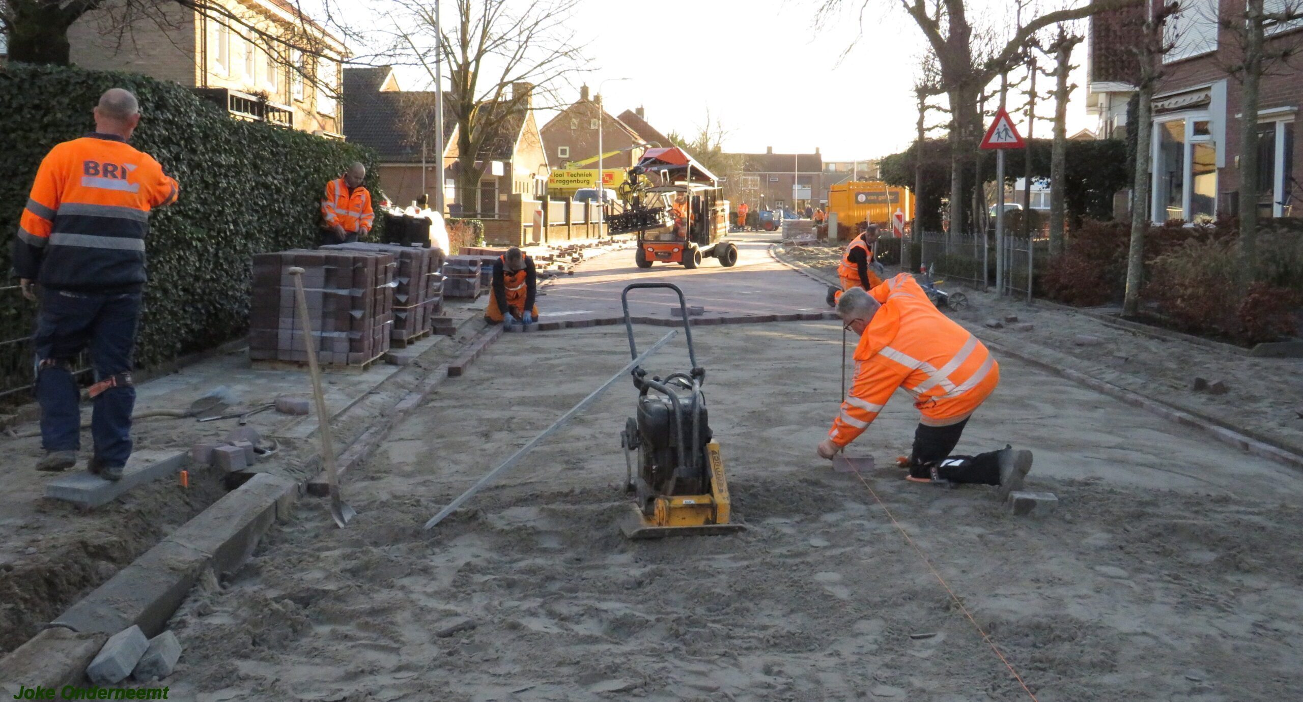 De vele vierkante meters vliegen er bijna in , in de Jan van Arkelstraat zo ook vandaag weer. Met een vierkante meter tegelijk leggen ze de stenen er in en dat schiet lekker op.