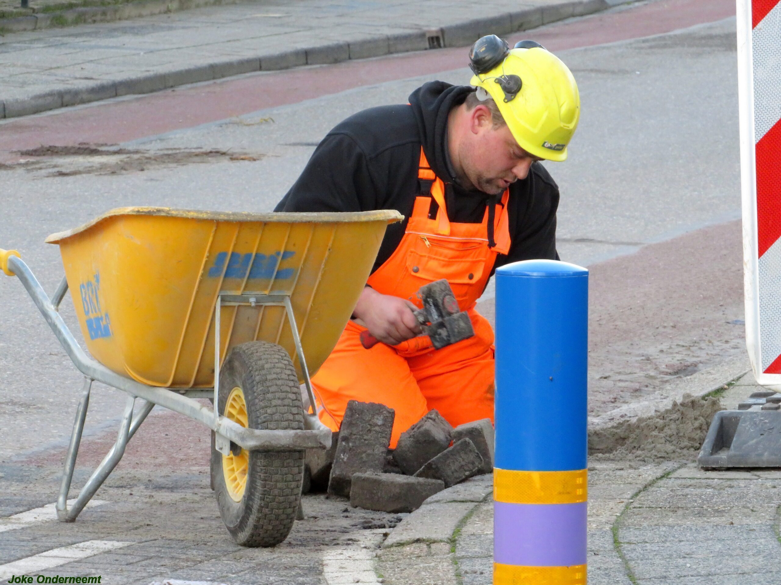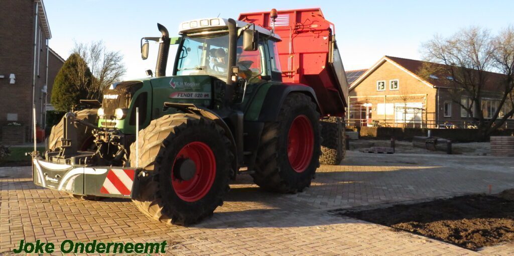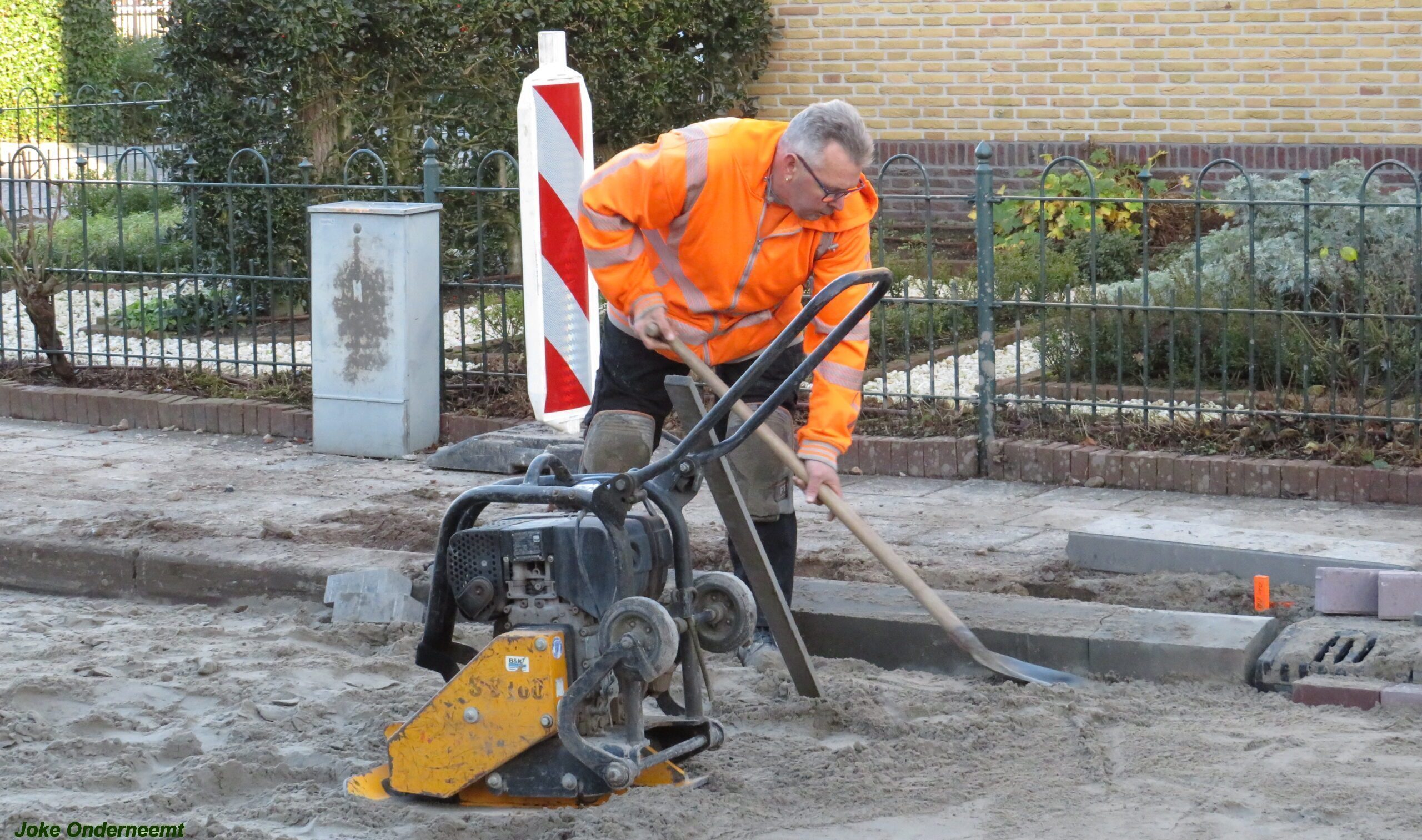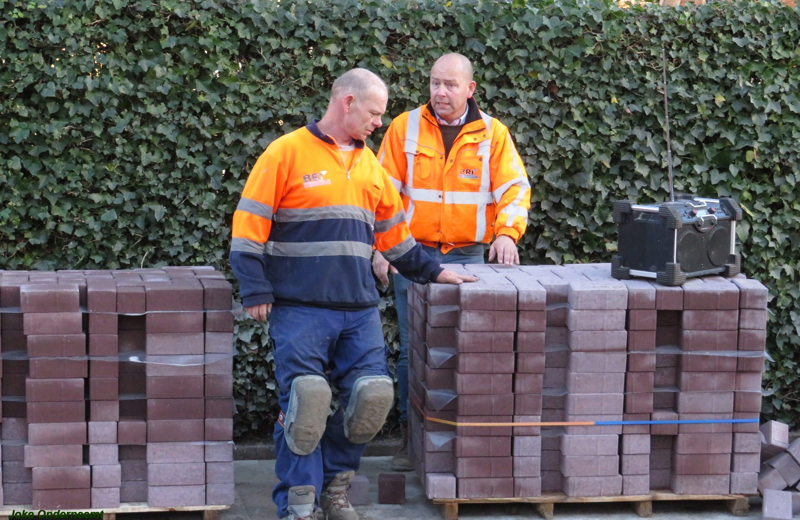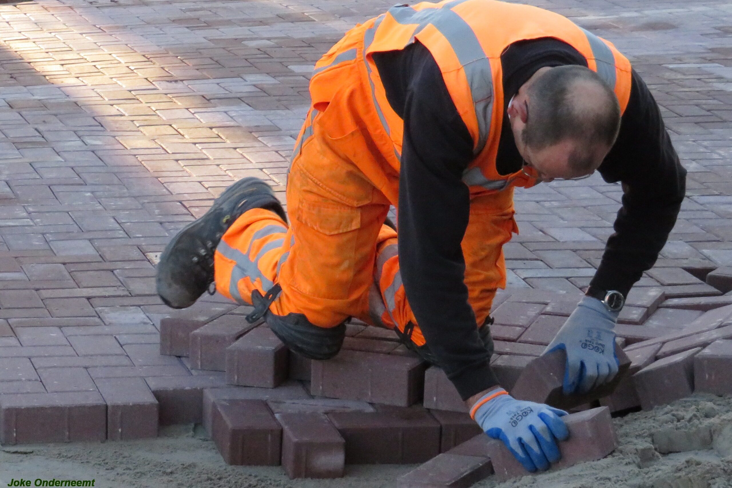 De vele vierkante meters vliegen er bijna in , in de Jan van Arkelstraat zo ook vandaag weer. Met een vierkante meter tegelijk leggen ze de stenen er in en dat schiet lekker op.