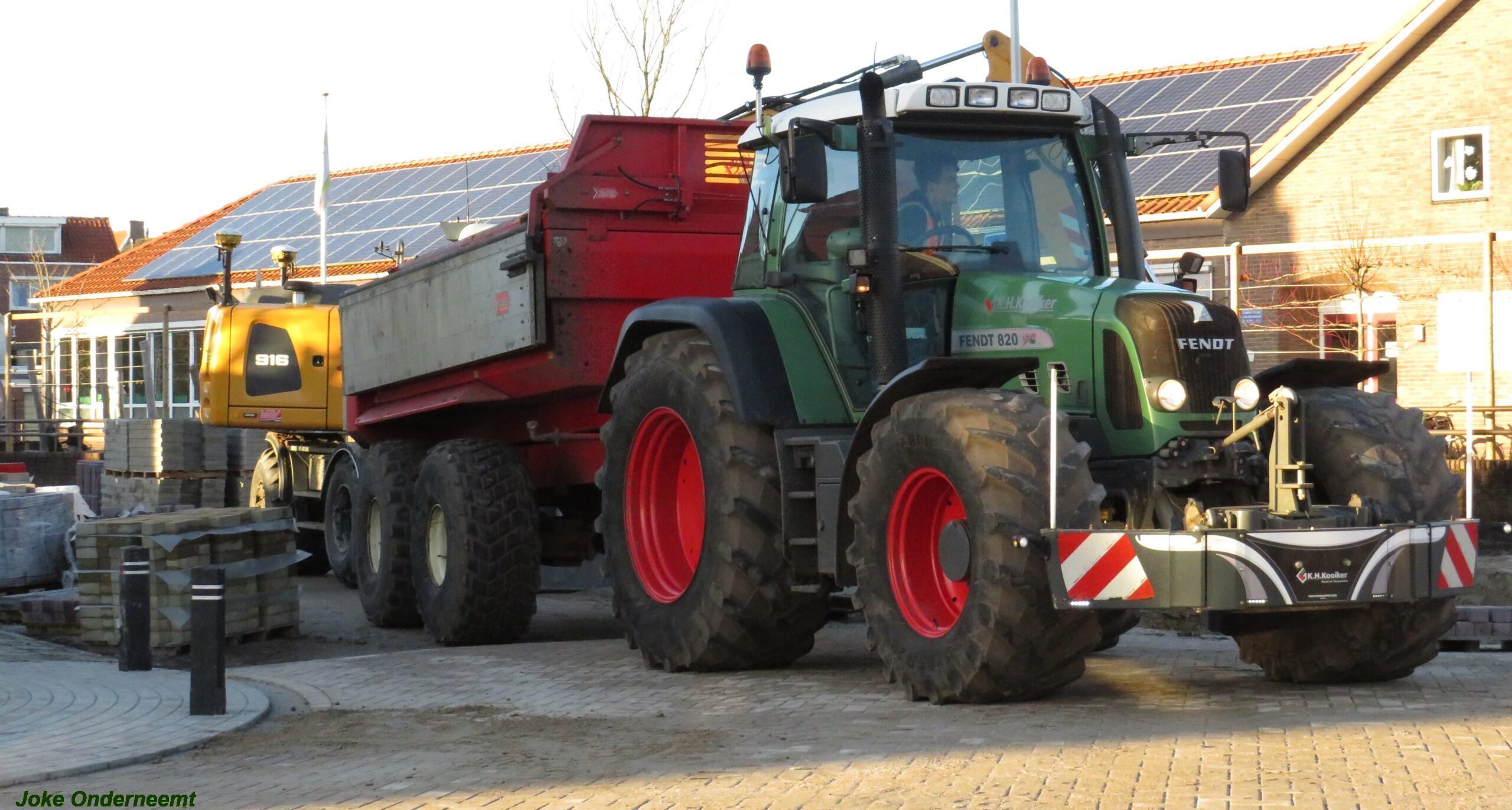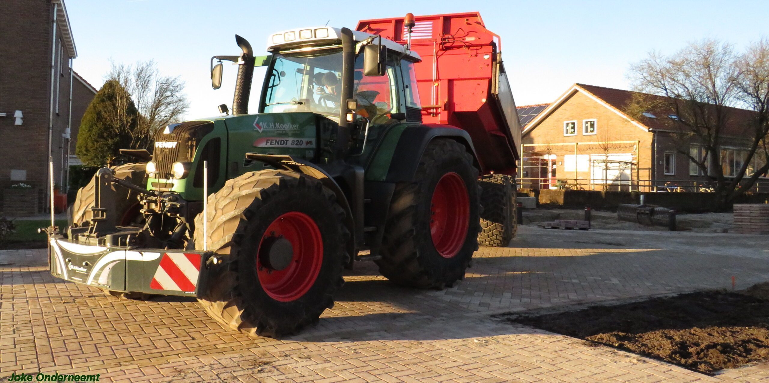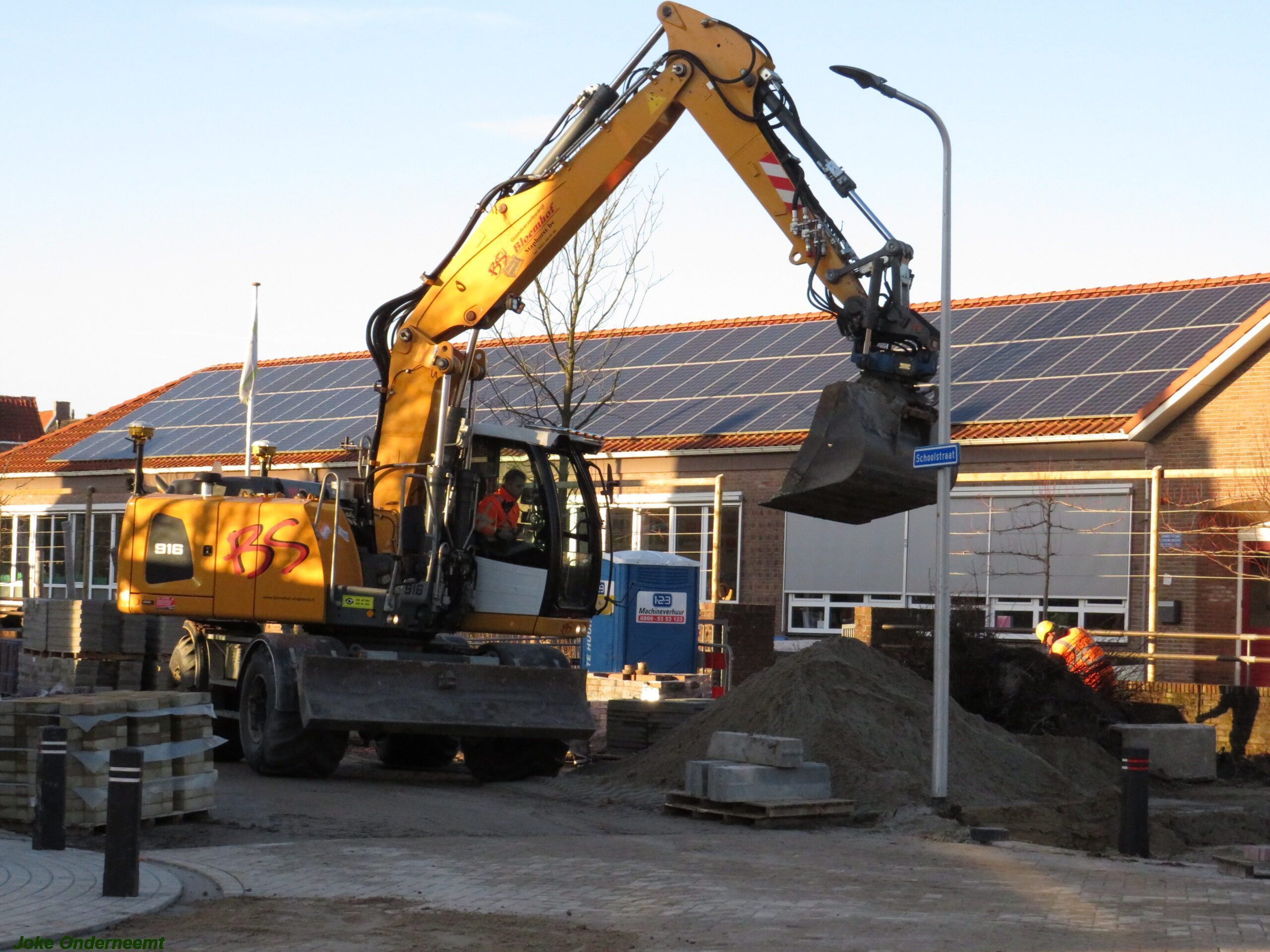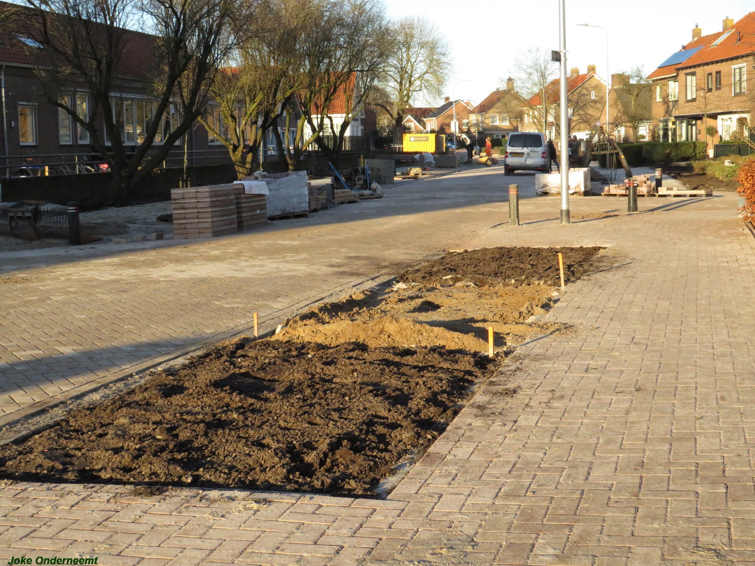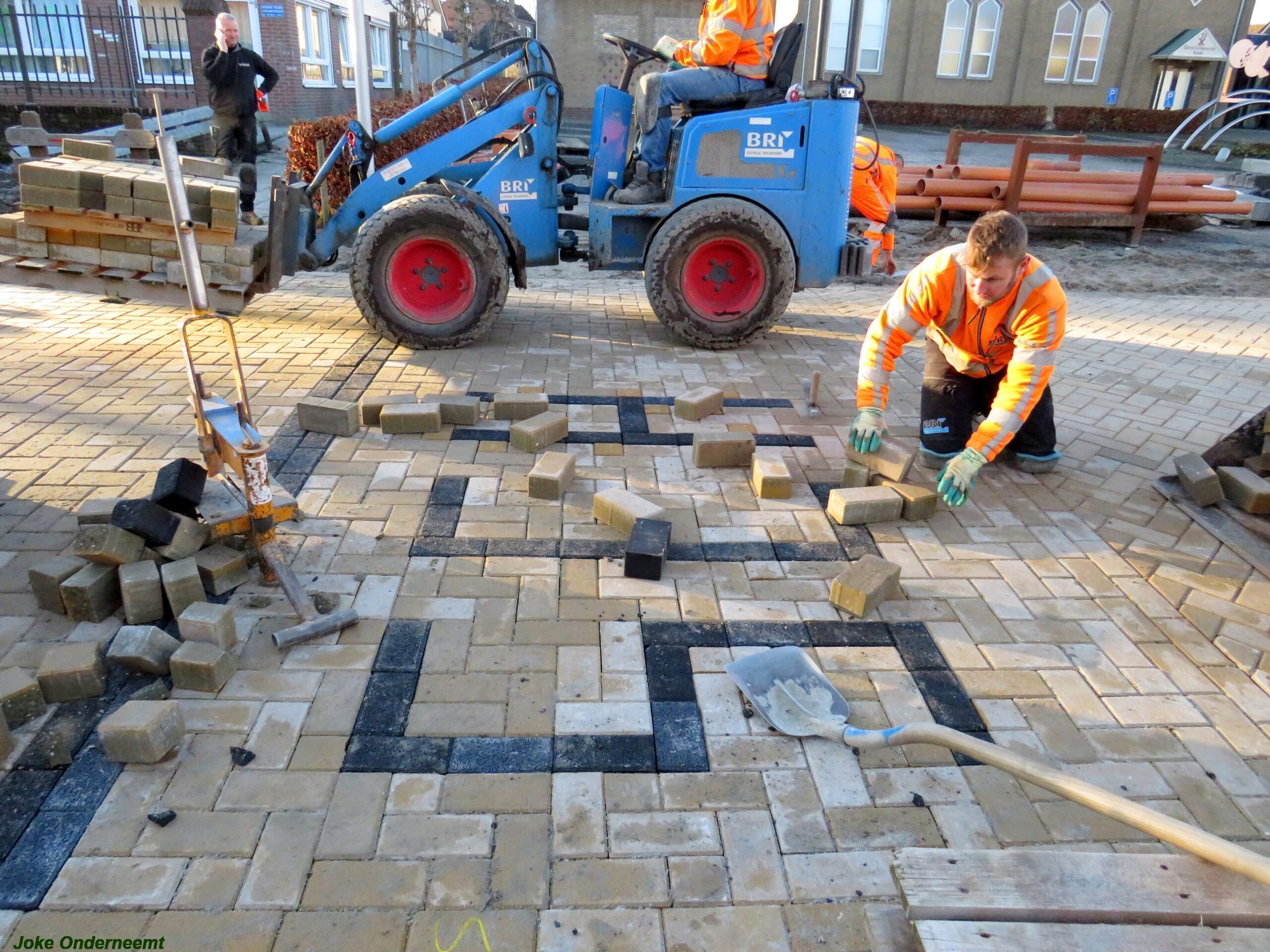 Verderop in de straat bij de school zijn ze ook nog druk bezig en bloemperken komen al in zicht.. evenals een ijverige stratenmaker bezig is met het woord SCHOOL .