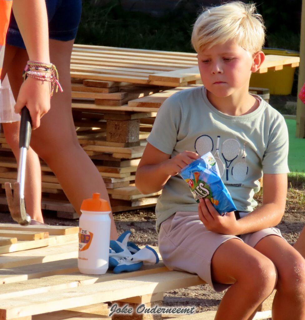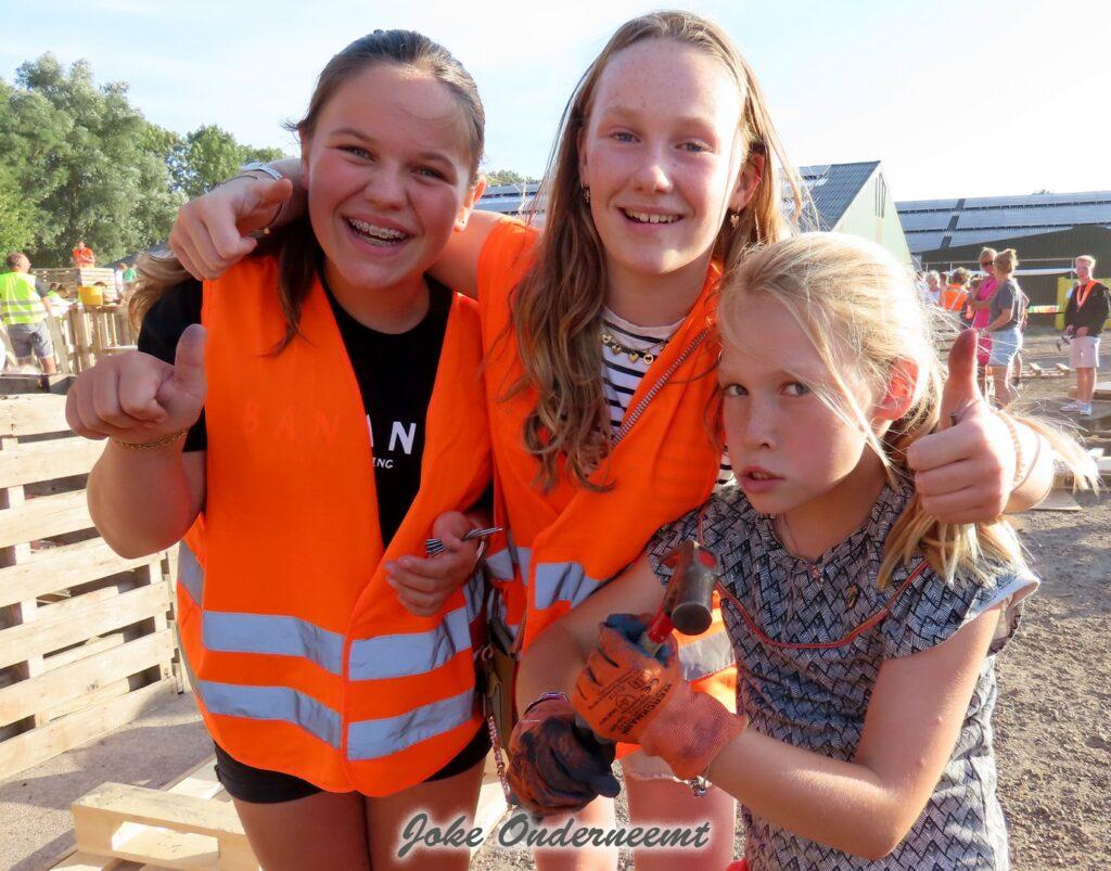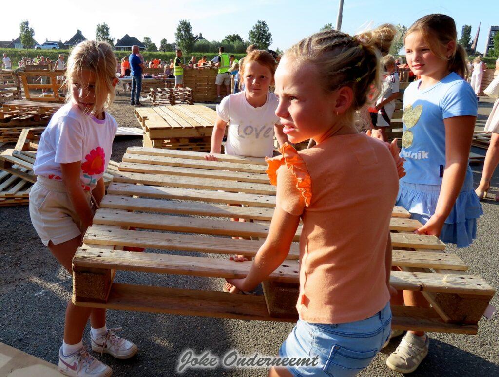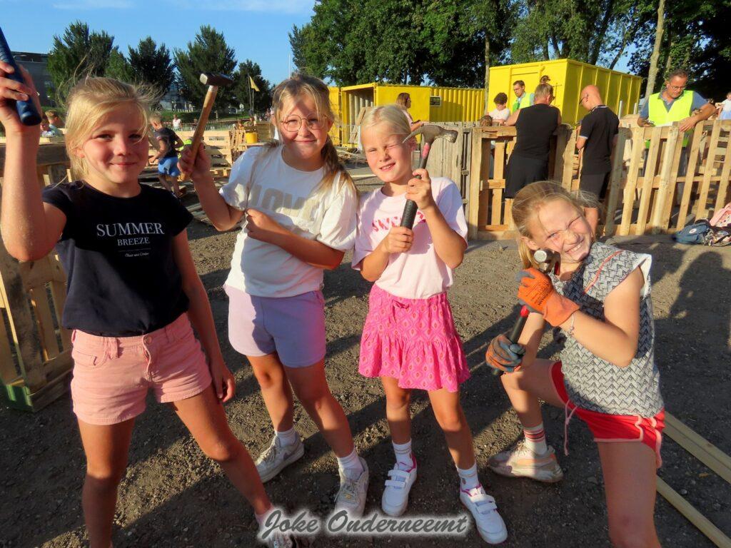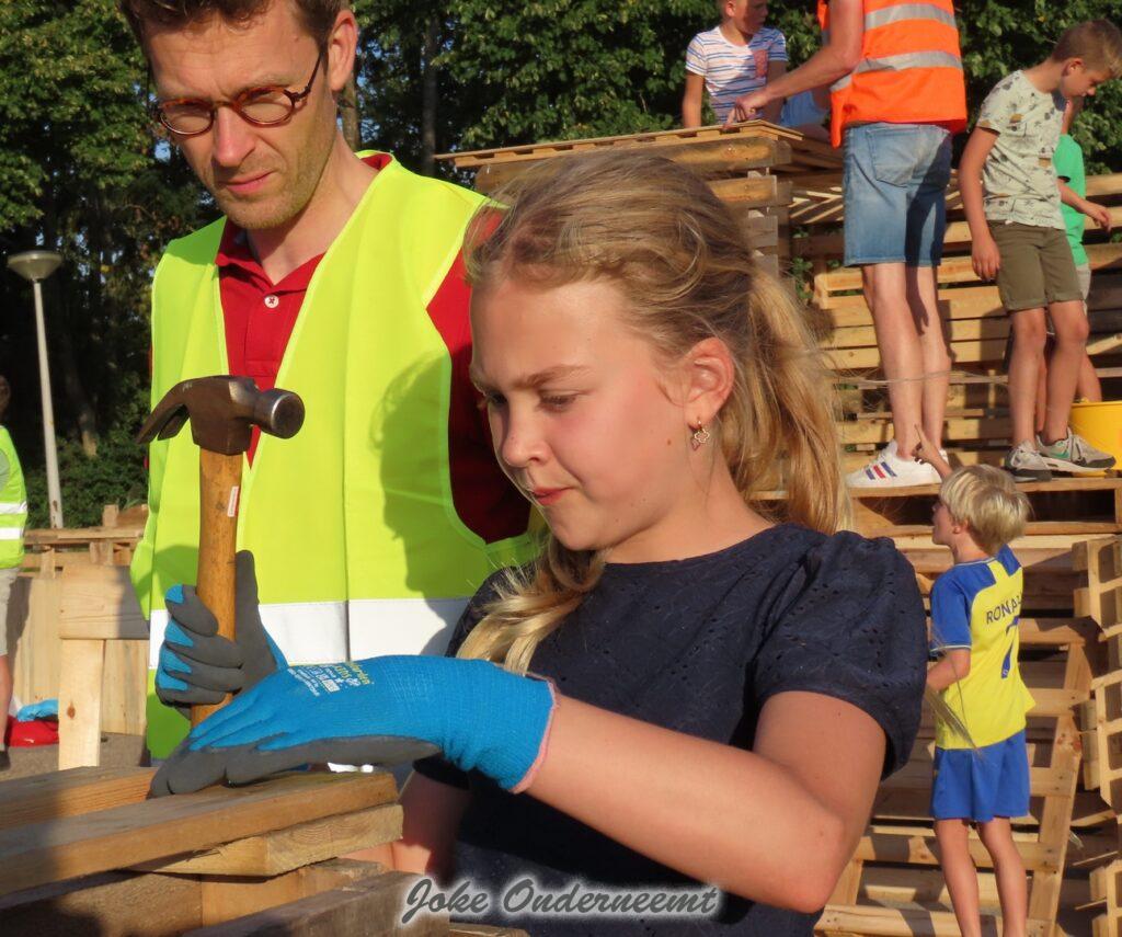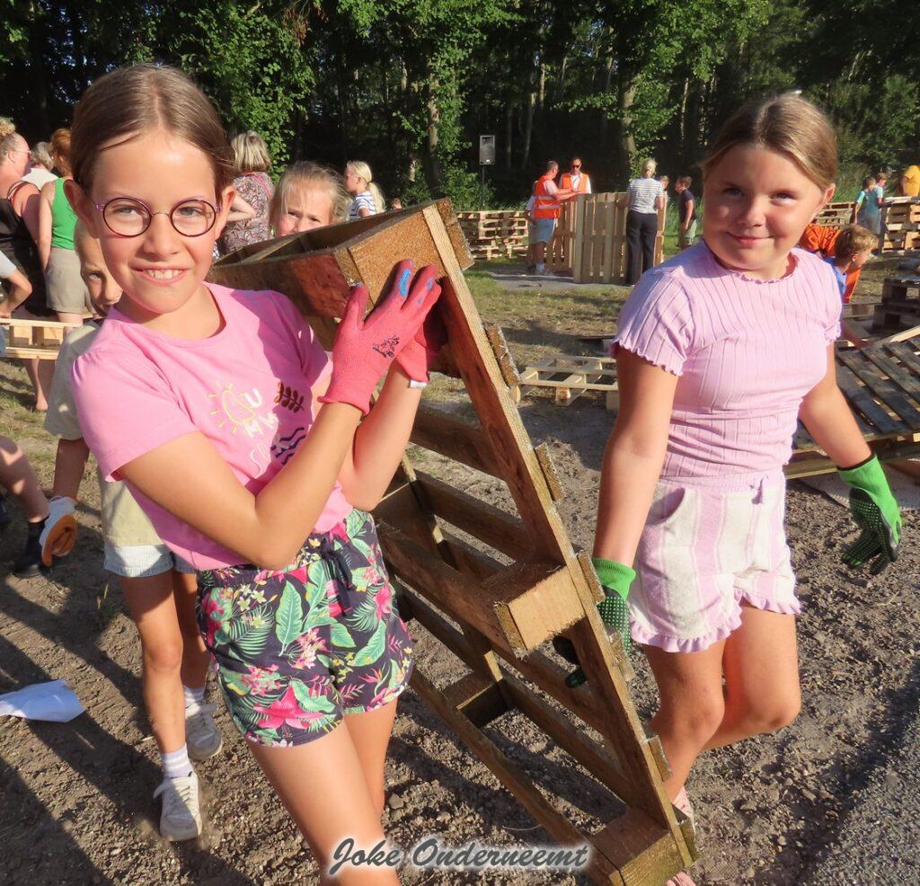 Maar gelukkig mochten ouders ook helpen en dat was maar goed ook. Want de pallets zijn best zwaar en lagen nog hoog opgestapeld. Maar veel handen maken ligt werk en ook de meiden wisten zich prima te redden… beetje zweten maar oke ze hadden tenslotte drinken mee.