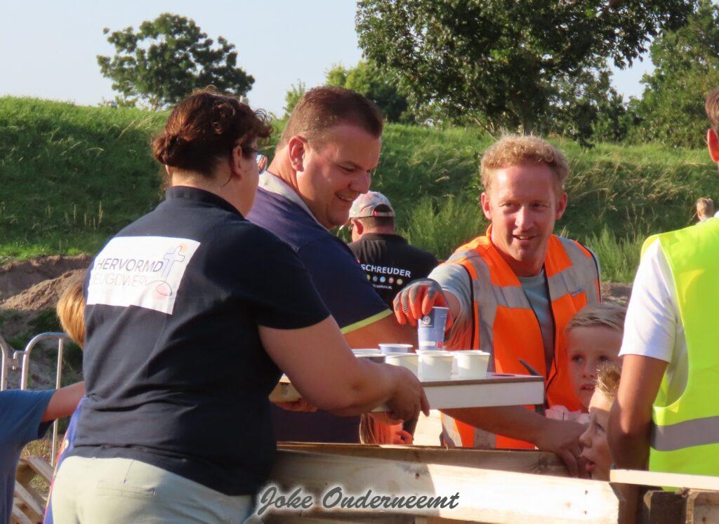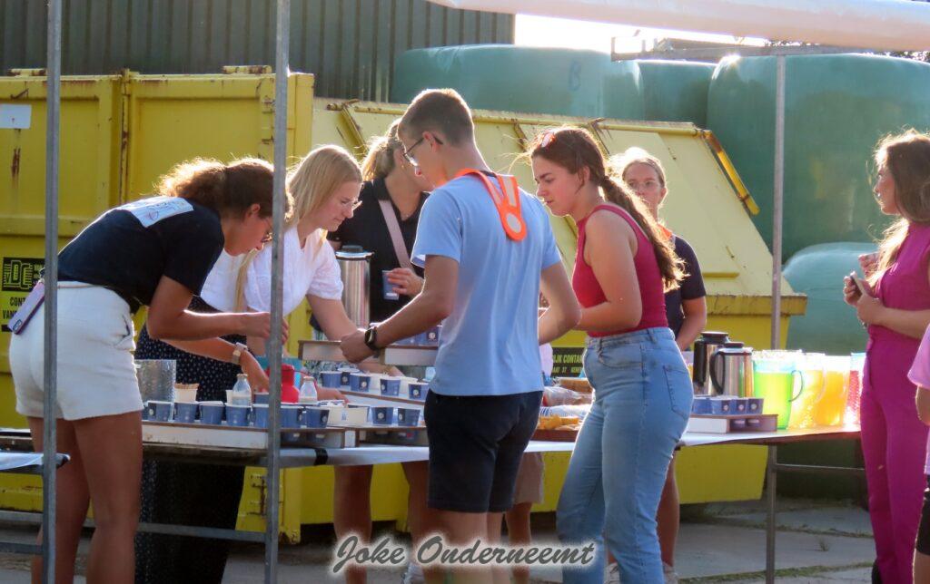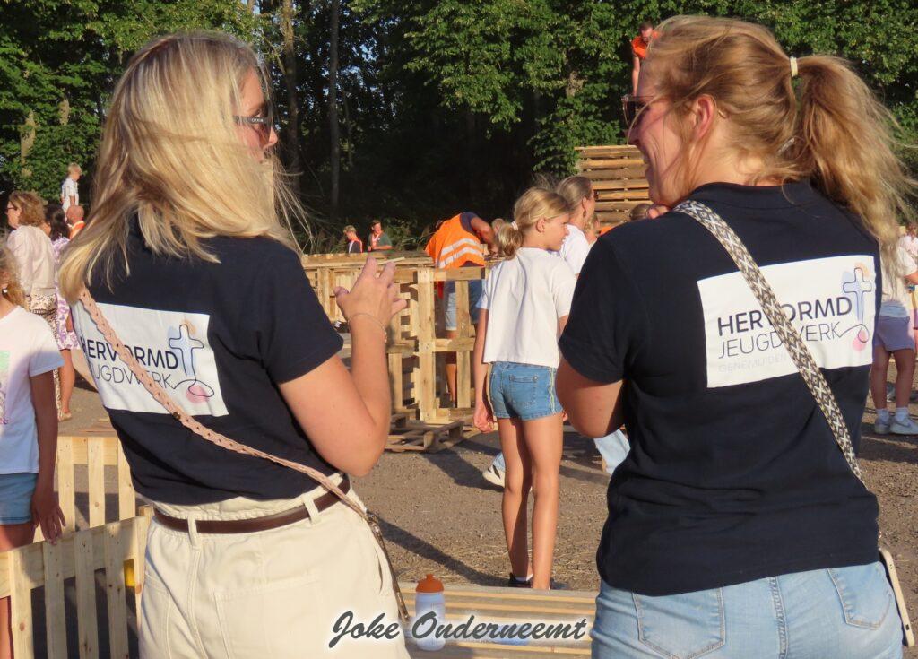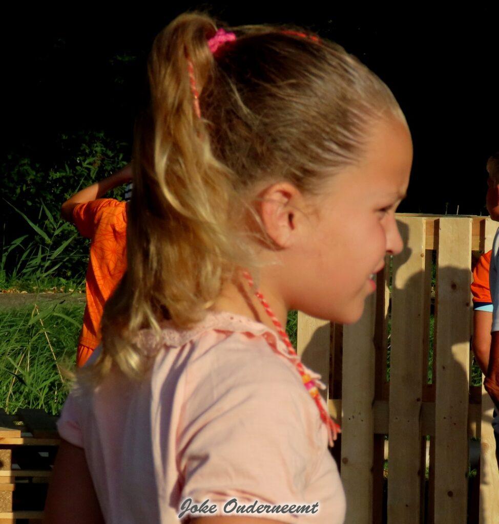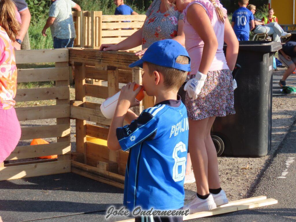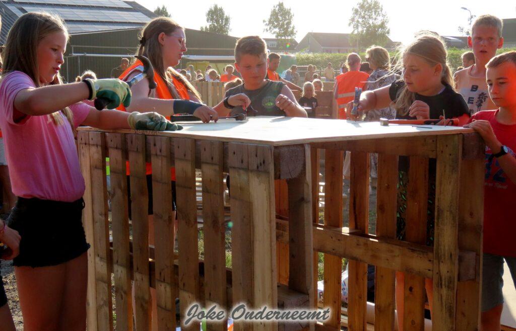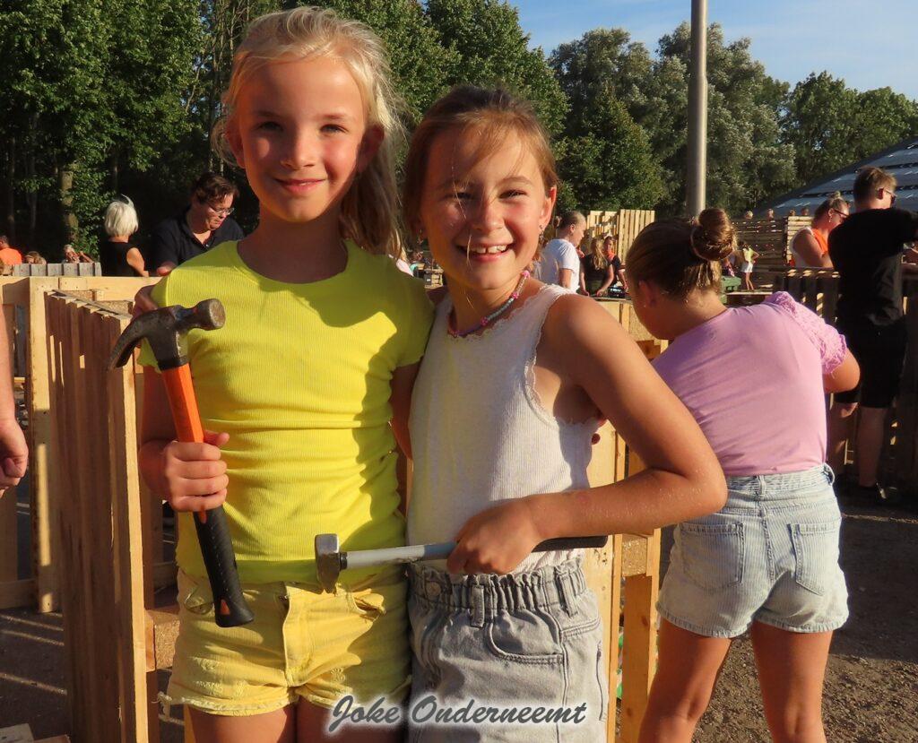 Maar gelukkig mochten ouders ook helpen en dat was maar goed ook. Want de pallets zijn best zwaar en lagen nog hoog opgestapeld. Maar veel handen maken ligt werk en ook de meiden wisten zich prima te redden… beetje zweten maar oke ze hadden tenslotte drinken mee.
