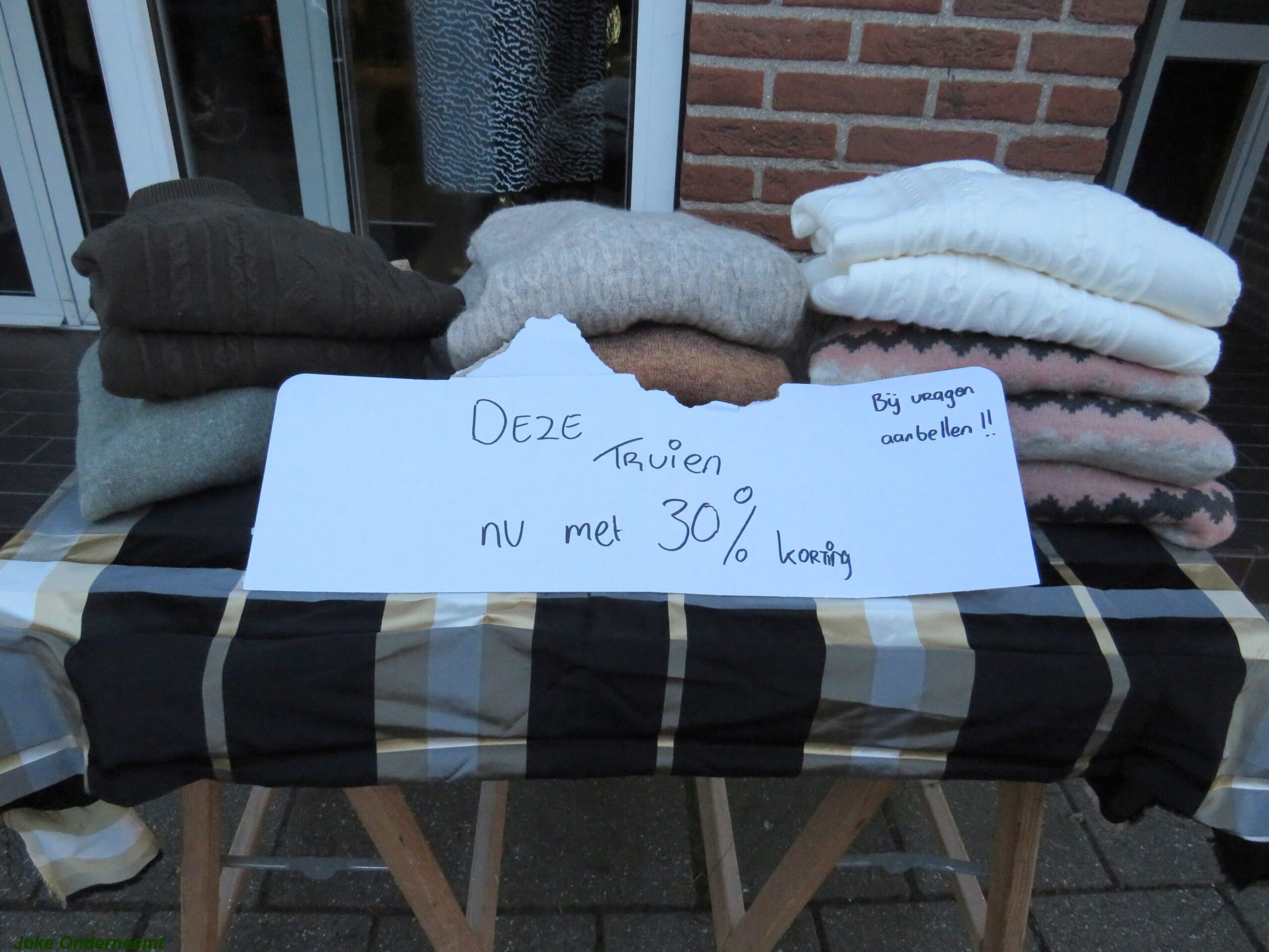 Ook buiten staat een tafel met heerlijke warme truien voor een klein prijsje en het rek met winterjassen is 50% korting!