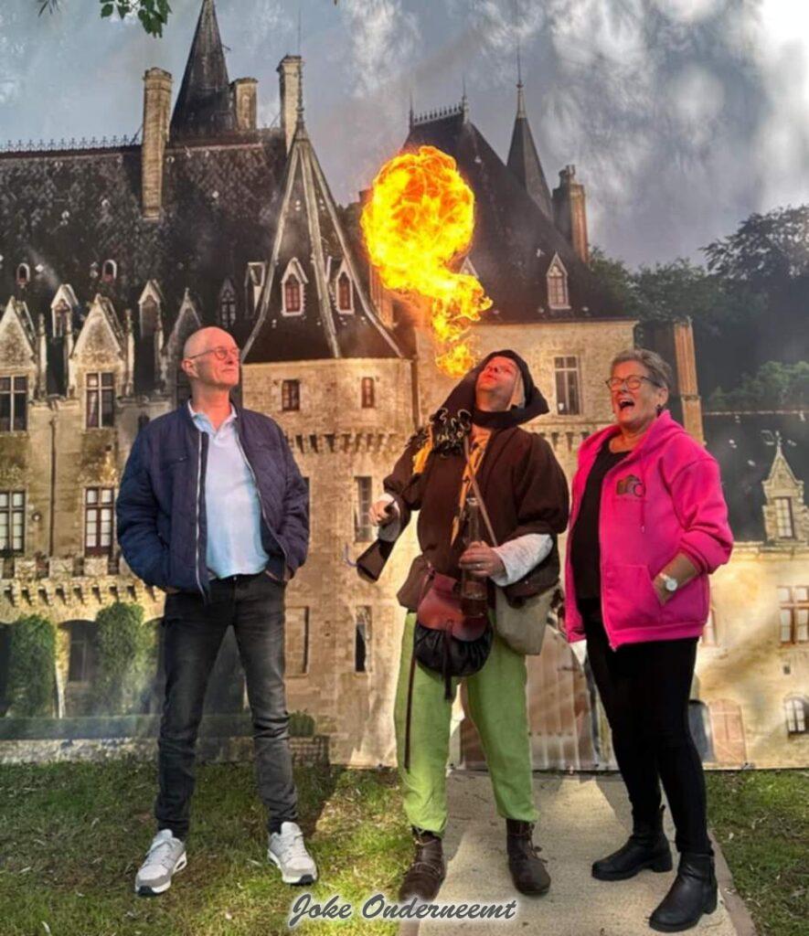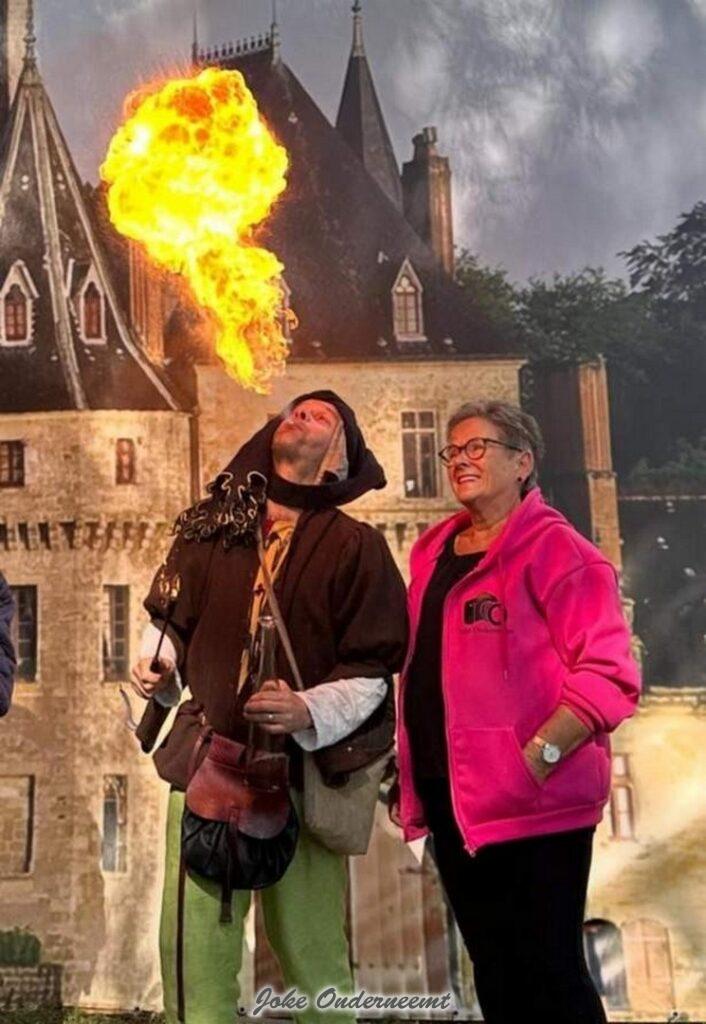 Maar oké dat was een mooie gelegenheid om wat foto’s te maken van de hele groep en ook de vuurspuwer wilde wel vast een demonstratie geven … natuurlijk liet ook ik me de kans niet ontnemen om met zo’n “heethoofd” op de foto te gaan.. want wat een hitte gaf dat af ontzettend… ook best een beetje eng hoor, maar oké voor een foto doe ik bijna alles he…