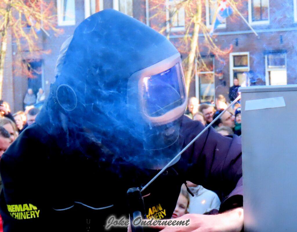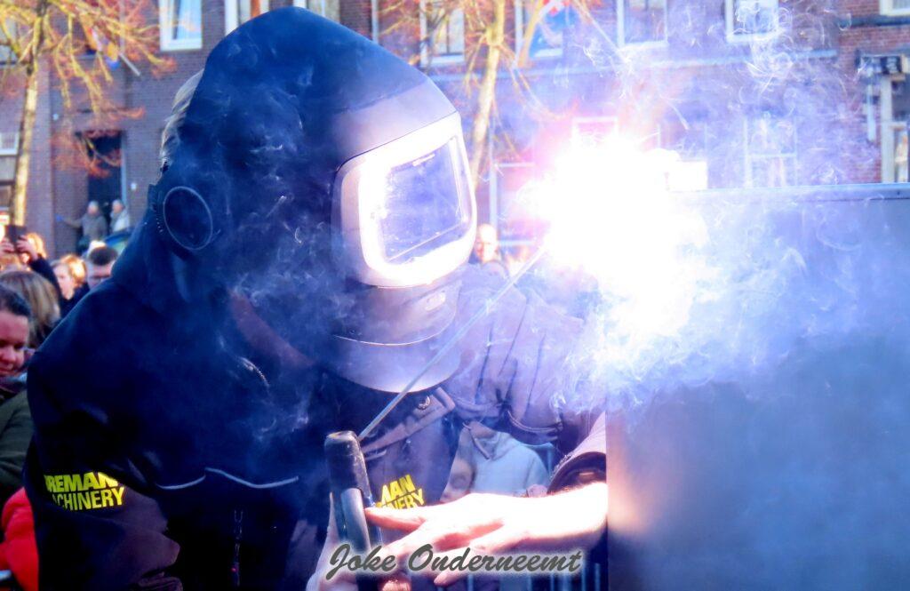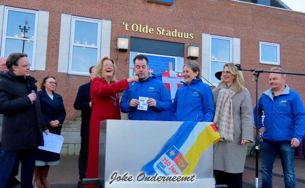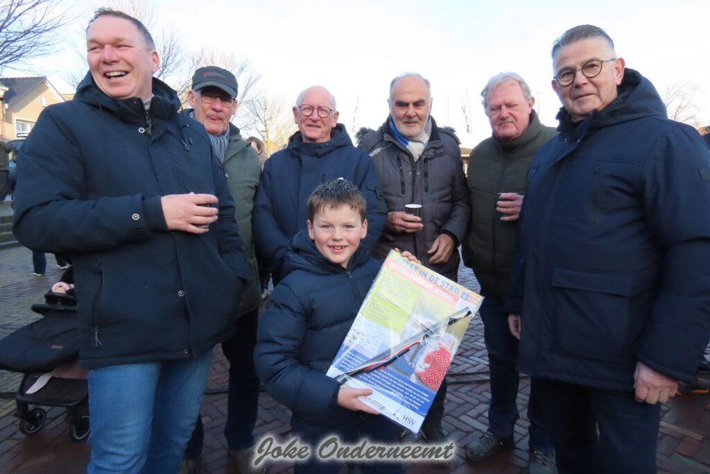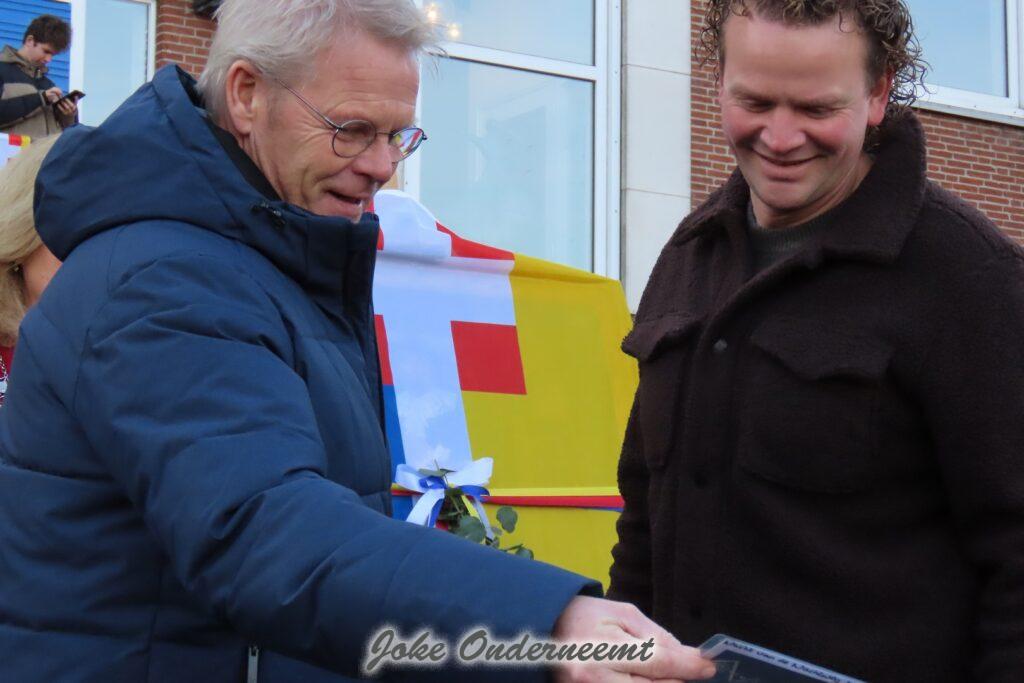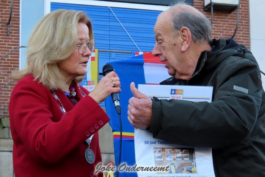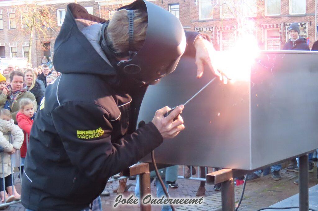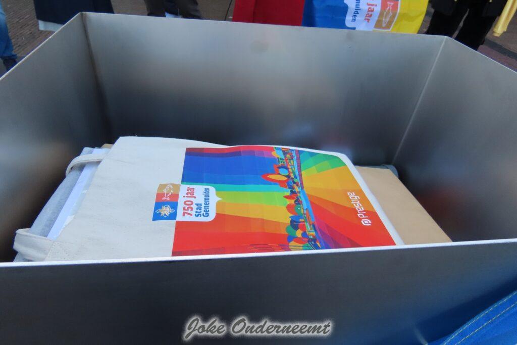 In een “tijd capsule” konden afgevaardigde van verenigingen en mensen die hun medewerking hadden verleend afgelopen jaar een herinnering of kado in plaatsen. Dat was bv een oorkonde van Aron Harms die hij had gewonnen bij de visvereniging en waar hij heel trots op was ( zie foto) maar die hij toch in de capsule wilde plaatsen. En zo gingen er verhalen of andere leuke dingen in. Daarna werd hij dicht gelast en krijgt een plaatsje in het nieuwe Stadsmuseum dat over een aantal maanden open hoopt te gaan.
