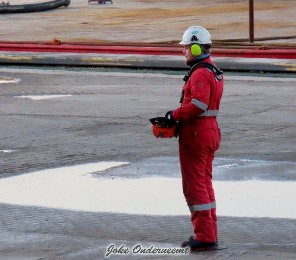 Van die grote loods waar dat ding uit kwam, toen rondom Fuite en richting de haven waren we anderhalf uur verder, dus van top tot teen bevroren ongeveer want wat was het daar ijzig koud aan het water!