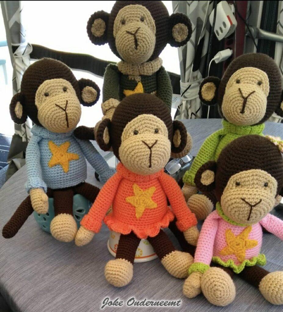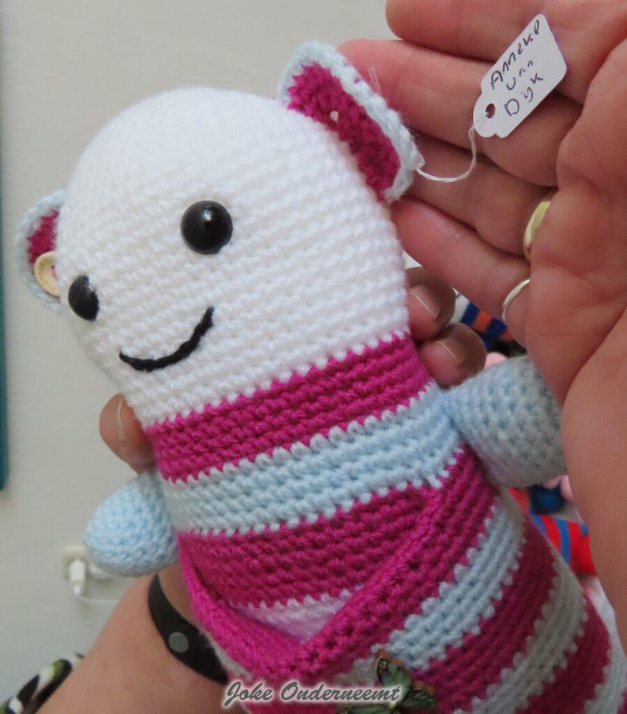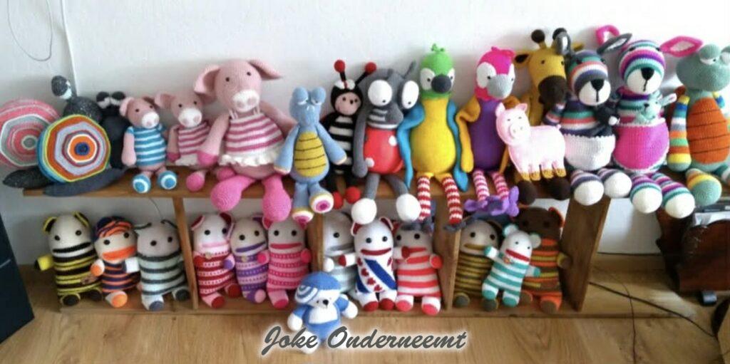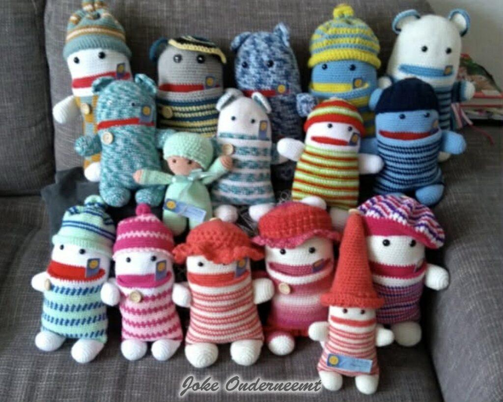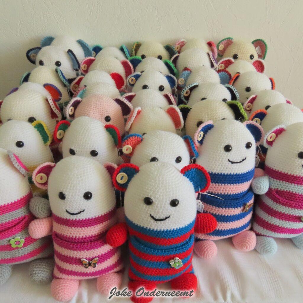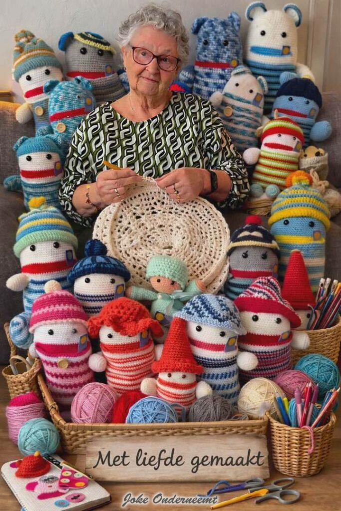 Dit jaar viert ze haar 70 jarig haak jubileum in oktober volgens mij… nog even een kleine indicatie over hoeveel en snel ze haakt…vanaf 1 november : 4 grote dekens – 4 baby dekens – 32 troostpopjes ( zie foto) en nog eens 3 dekens…en alles wordt al die jaren netjes per stuk genoteerd in een schrift … wat het is , wanneer het was, en volgens mij ook nog wat voor wol.